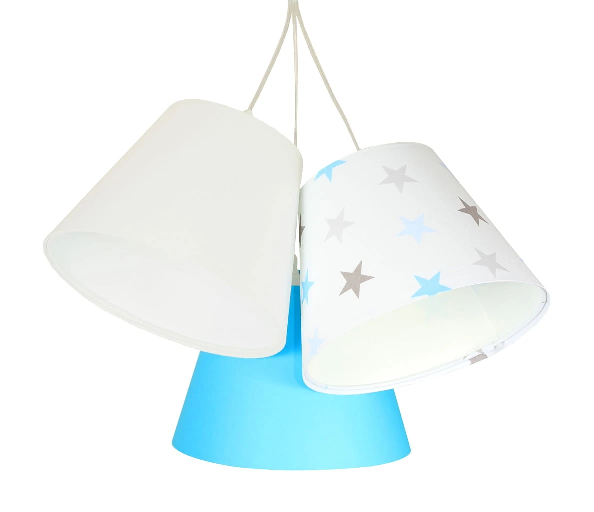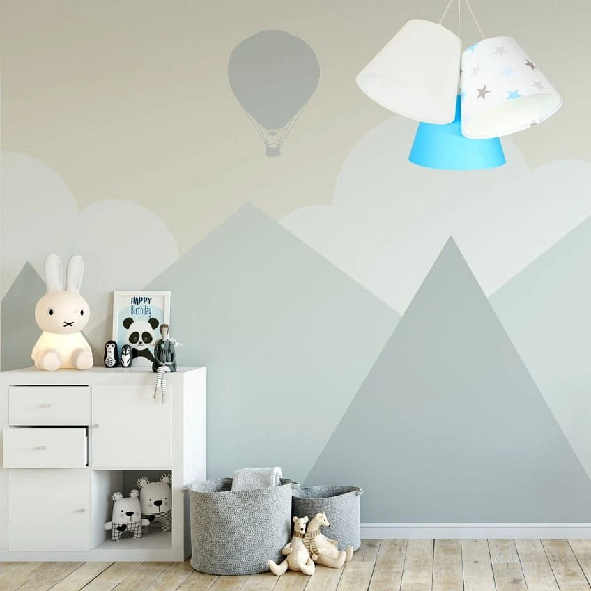 Potrójna lampa wisząca do pokoju dziecięcego wykonana z welurowych abażurów o pastelowych kolorach. Jeden z nich ozdobiony delikatnymi gwiazdkami. Welur odporny na działania promieni UV, dzięki czemu lampa na długie lata zachowa piękny kolor.
