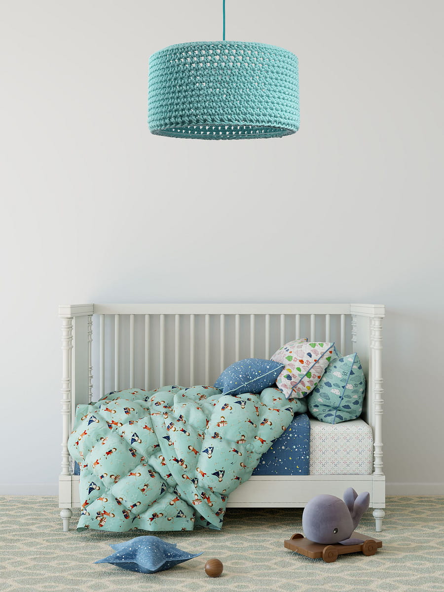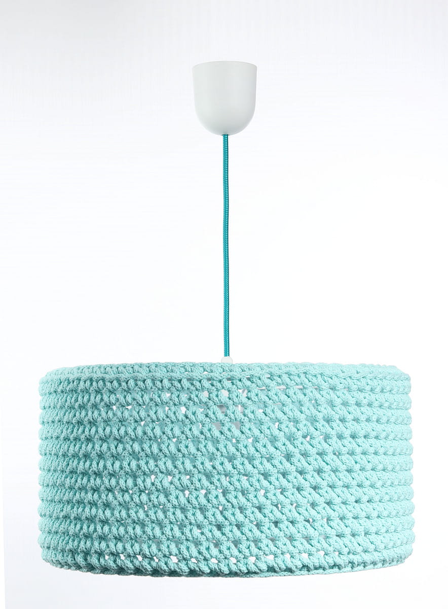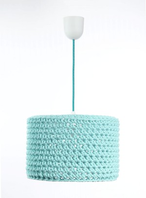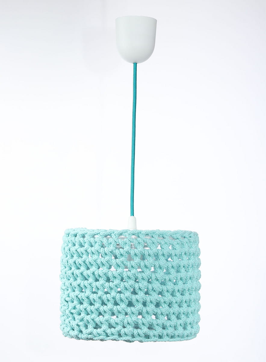 Śliczna lampa wisząca do pokoju dziecka "ubrana" w ręcznie robiony sweterek z grubo splatanego bawełnianego sznurka w kolorze mięty. Gruby splot w podświetleniu tworzy na suficie i ścianach efekt siateczki, równocześnie rozświetlając każdy pokój dziecięcy i nadając mu ciepły, radosny klimat.