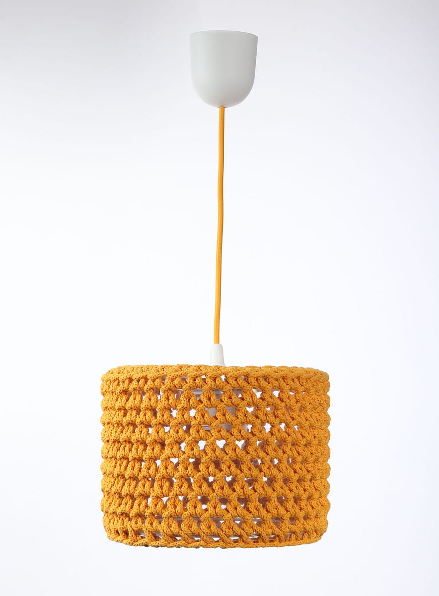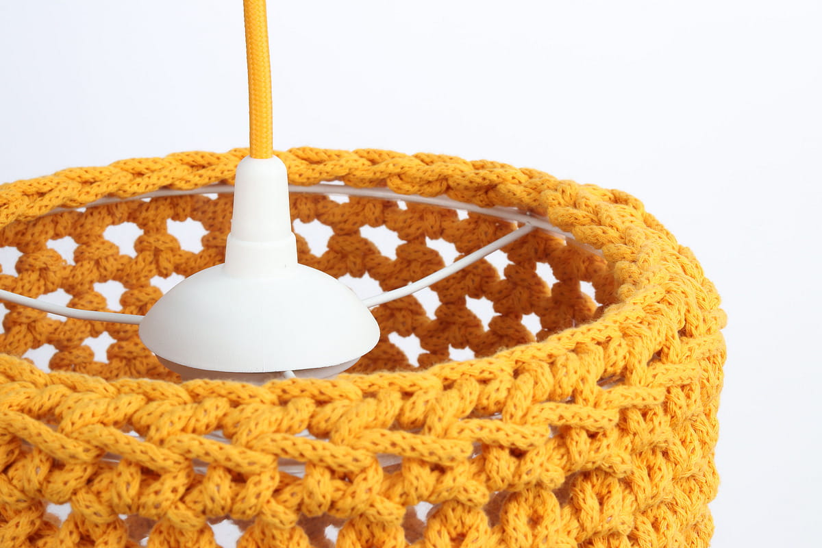 Piękna, pomarańczowa lampa wisząca do pokoju nastolatki "ubrana" w ręcznie robiony sweterek z grubo splatanego bawełnianego sznurka. Gruby splot w podświetleniu tworzy na suficie i ścianach efekt siateczki, równocześnie rozświetlając pokój i stwarzając przytulny nastrój.