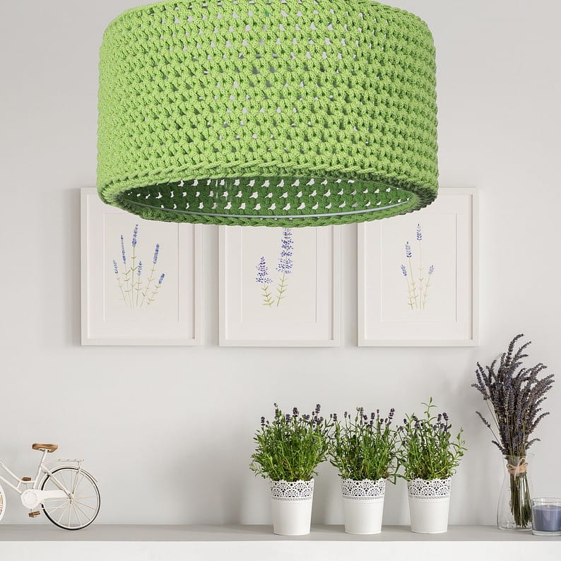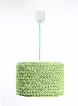 Śliczna zielona lampa wisząca do pokoju dziecięcego "ubrana" w ręcznie robiony sweterek z grubo splatanego bawełnianego sznurka. Gruby splot w podświetleniu tworzy na suficie i ścianach efekt siateczki, równocześnie rozświetlając pokój dziecka i stwarzając niepowtarzalny klimat.