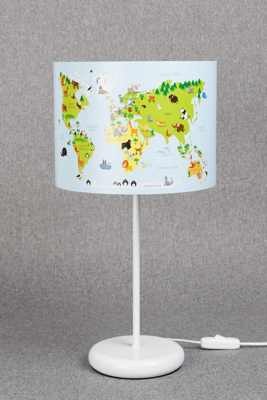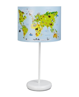 Prosta lampka do pokoju dziecka na białej metalowej podstawce z kolorowym abażurem, na którym "zmieścił się" cały świat. Nadruk na abażurze przedstawiający mapę świata wraz z charakterystycznymi dla danego regionu zwierzętami może być oryginalną pomocą w poznawaniu i nazywaniu kontynentów. Lampka do pokoju dziecka jest częścią kolekcji Sweet Dreams i wraz z pozostałymi lampami stanowi pełne i odpowiednie oświetlenie dziecięcego pokoju.