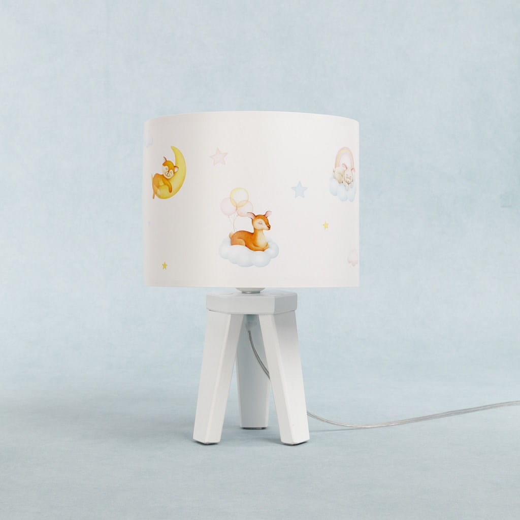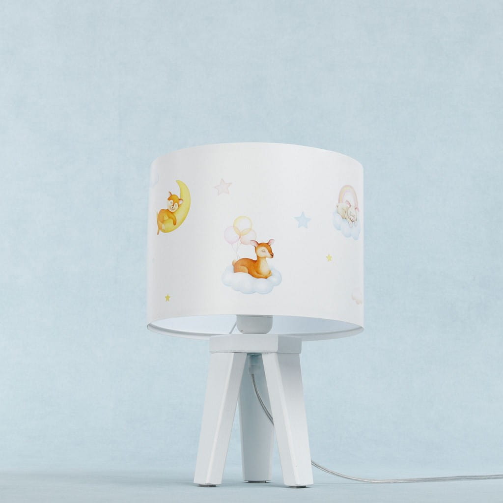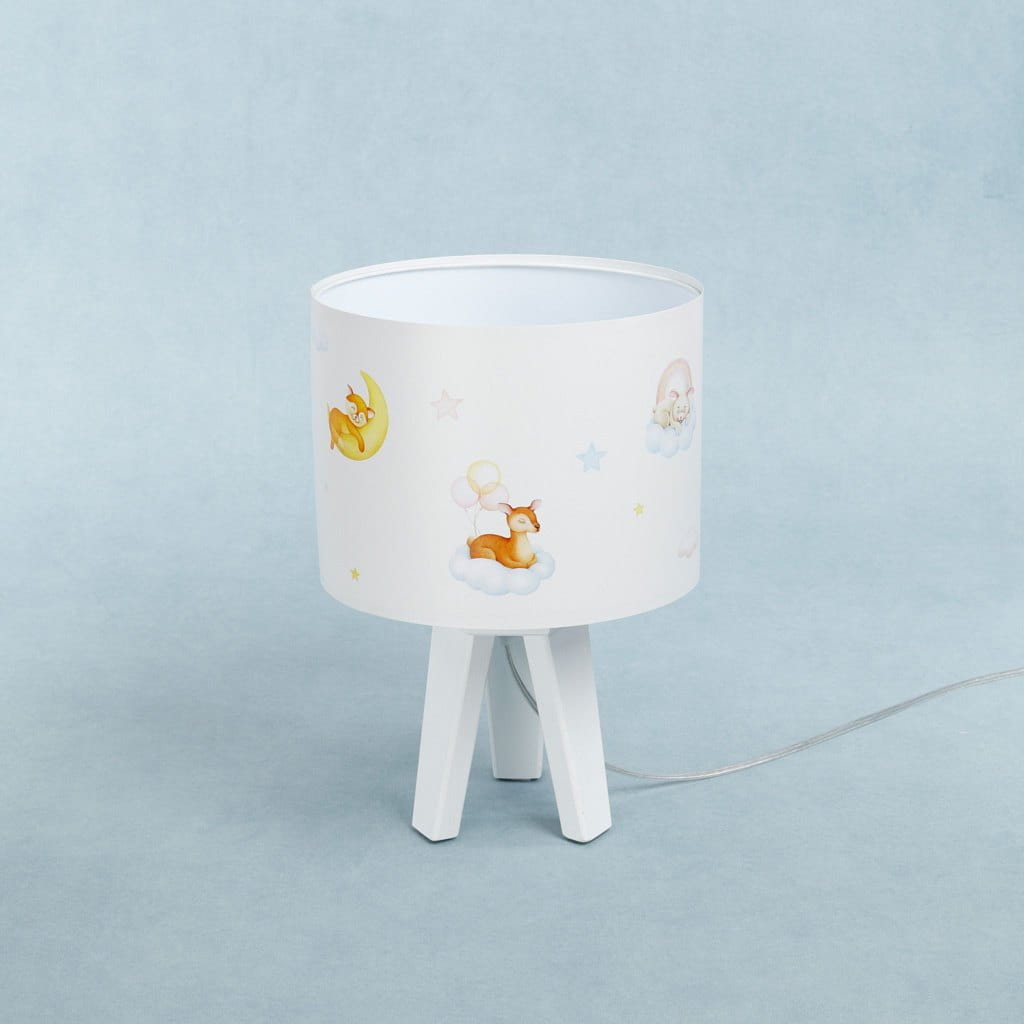 Śliczna lampka nocna do pokoju niemowlaka, której światło delikatnie go oświetli i wprowadzi przyjemny nastrój. Abażur lampki ozdobiony został pastelowym nadrukiem z sympatycznymi zwierzątkami i osadzony na drewnianym trójnogu. Lampka nocna, która z pewnością podkreśli dziecięcy charakter pokoju i stanie się jego ozdobą. Lampka nocna jest częścią kolekcji Sweet Dreams i wraz z pozostałymi lampami, z tym samym wzorem na abażurze stworzy kompletne i wyjątkowe oświetlenie pokoju dla niemowlaka.