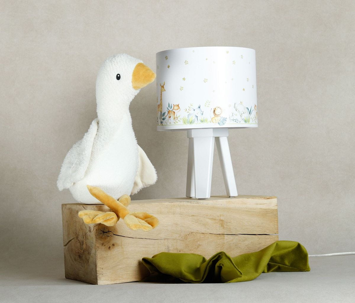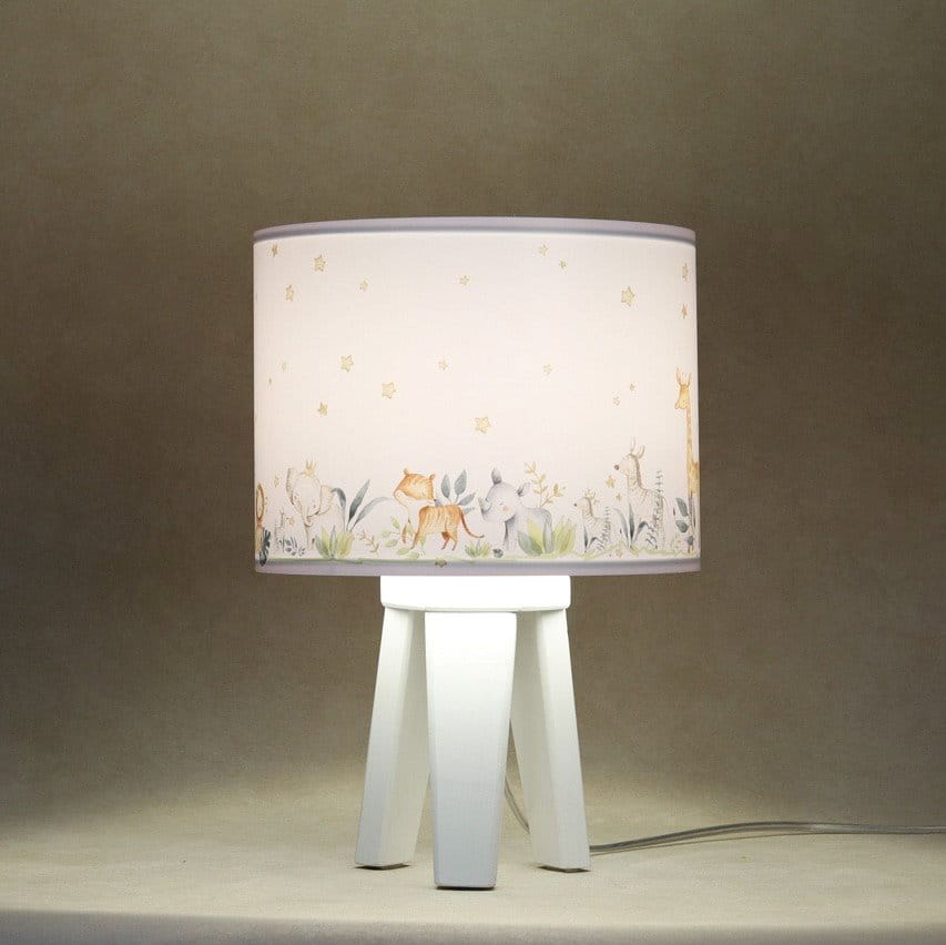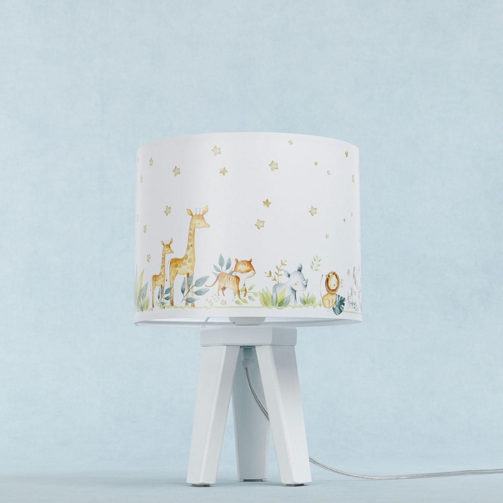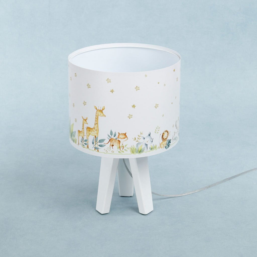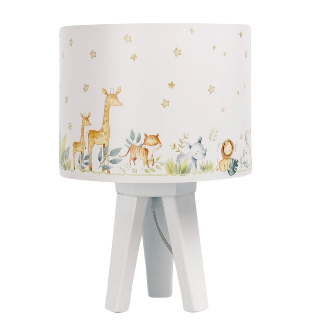 Niezwykle urocza lampka nocna dziecięca, która nie tylko delikatnie oświetli pokój ale wprowadzi do niego ciepłą i przytulną atmosferę. Abażur lampki osadzony na białym drewnianym trójnogu ozdobiony jest lateksowym nadrukiem z sympatycznymi zwierzątkami. Lampka nocna w pokoju dziecięcym jest bardzo praktycznym rozwiązaniem, które sprawdzi się przy wieczornym zasypianiu lub przebudzeniu dziecka w nocy.