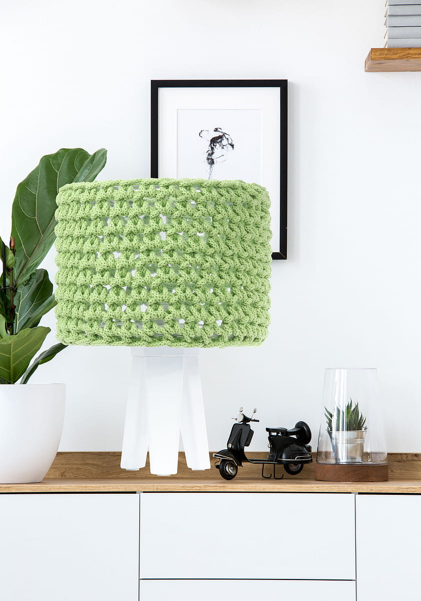 Wesoły, zielony sweterek lampki ręcznie wykonany ze sznurka bawełnianego o grubym splocie delikatnie oświetli pokój dziecka. W połączeniu z białym drewnianym trójnogiem stanowi urokliwą całość, będącą praktyczną ozdobą pokoju.