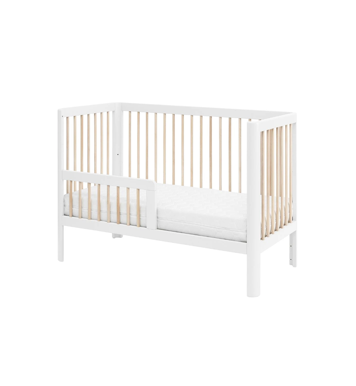Po wymianie jednego z boków na barierkę łóżeczko zmienia się w pierwsze niskie łóżko dla przedszkolaka, który nadal śpi bezpiecznie, ale ma więcej swobody.