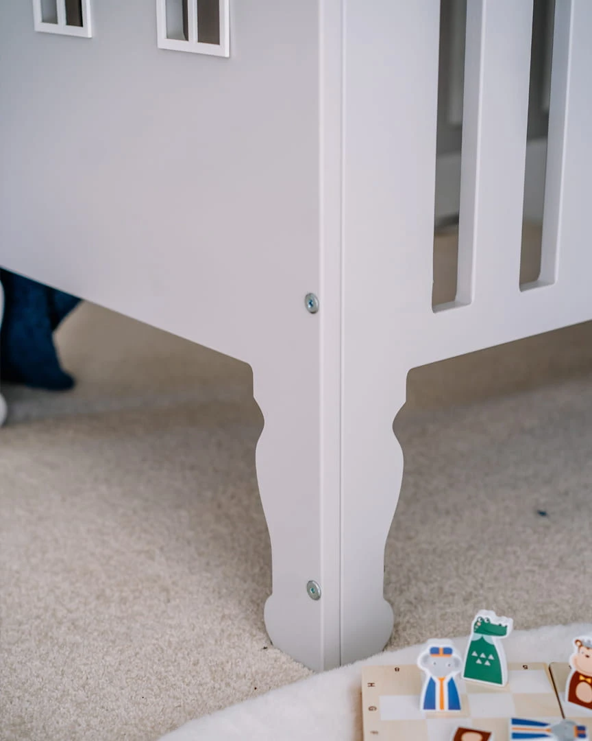 Łóżeczko domek posiada trzystopniową regulację wysokości położenia materaca, która pozwala na odpowiednie jej dopasowanie do wieku dziecka i etapów rozwoju. Najwyższe ułożenie materaca przeznaczone jest dla maluszków "leżących", środkowe - dla dzieci, które potrafią już siedzieć, ale jeszcze nie wstawać i najniższe - dla wszystkich dzieciaków, które opanowały sztukę wstawania. Z myślą o starszych dzieciach, łóżeczko wyposażono w zdejmowane szczebelki ułatwiające wchodzenie i wychodzenie z niego.