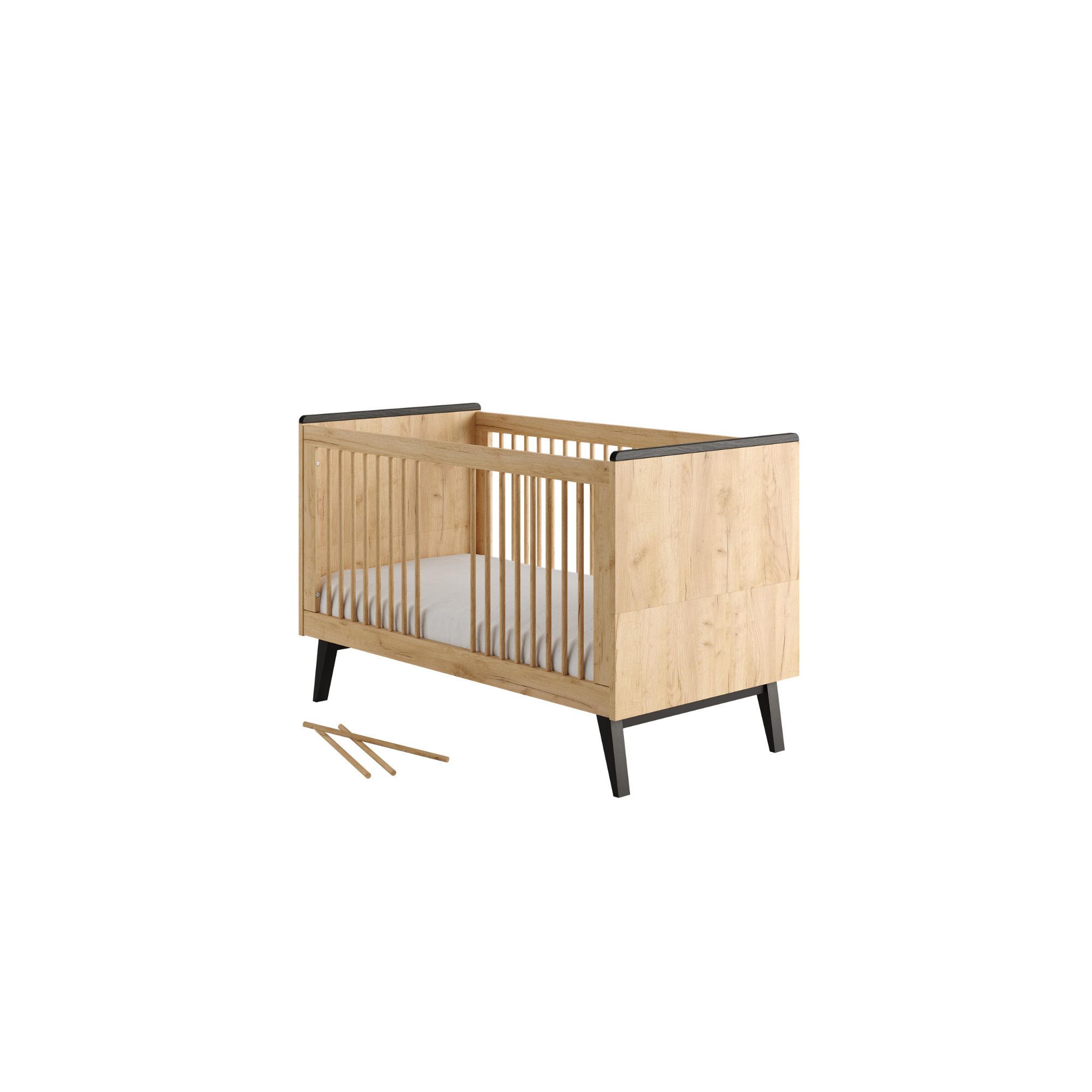 Łóżeczko-tapczanik 140x70 cm Retro to mebel 2w1 do pokoju niemowlęcia i przedszkolaka. Na początku pełni funkcję bezpiecznego łóżeczka niemowlęcego, a gdy dziecko podrośnie, łatwo przekształcisz je w niski tapczanik dla starszaka. Styl loftowo-skandynawski, wysokie nogi z litego drewna bukowego i ciepły, naturalny dekor drewna sprawiają, że łóżeczko pasuje zarówno do pokoju dziewczynki, jak i chłopca oraz do pozostałych mebli z kolekcji Retro (komoda, szafa, regał).