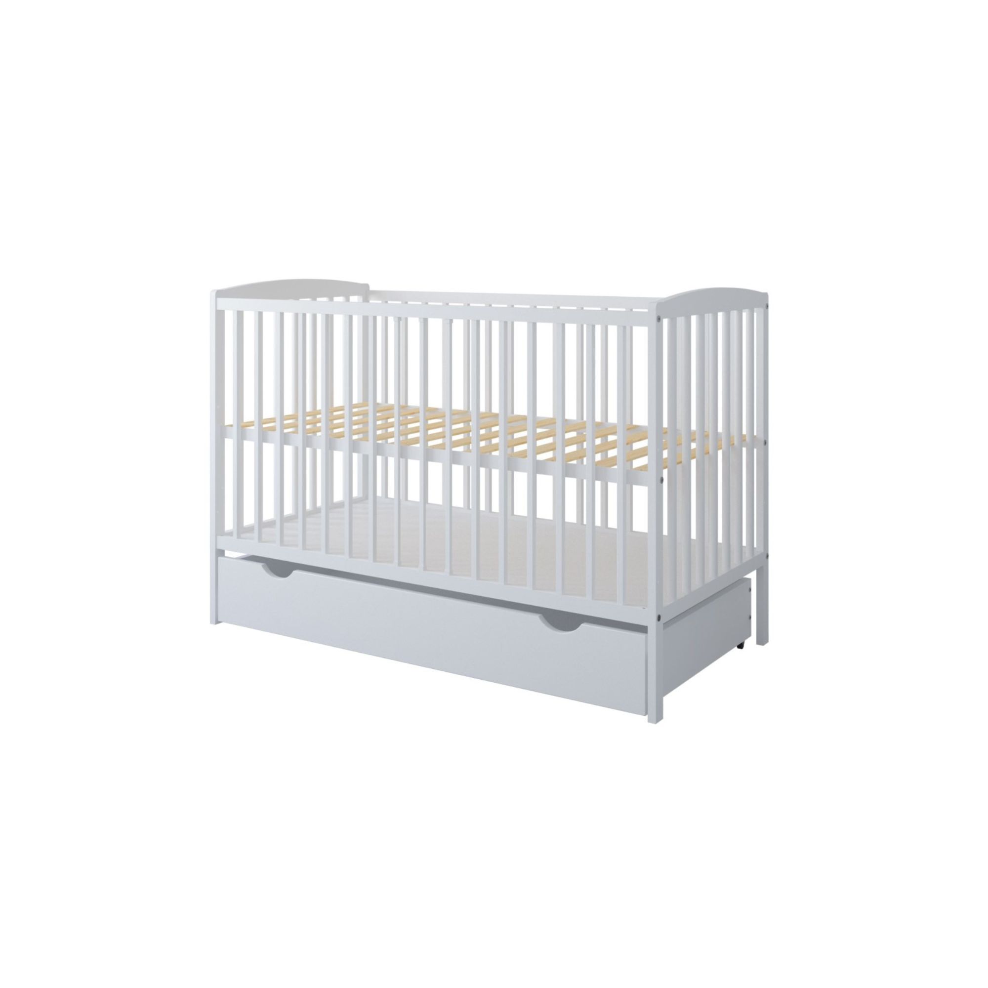 Łóżeczko wykonano z drewna sosnowego, a stelaż z listew ze sklejki liściastej, które zapewniają dobrą wentylację materaca. Biały kolor uzyskano dzięki atestowanemu lakierowi wodnemu, odpowiedniemu do produktów dziecięcych.