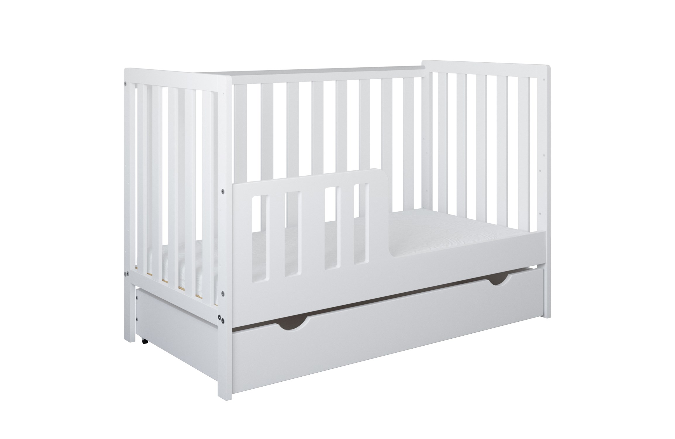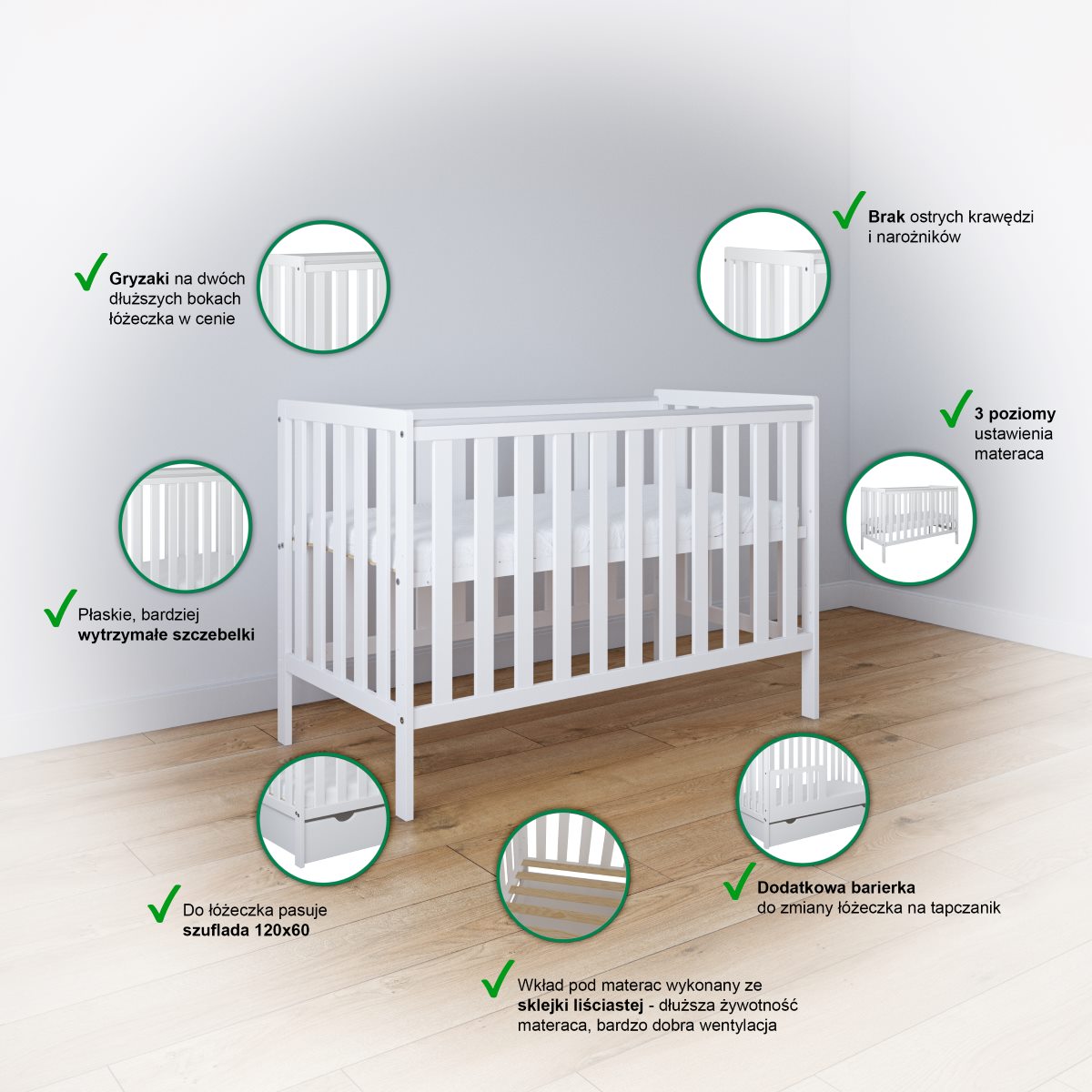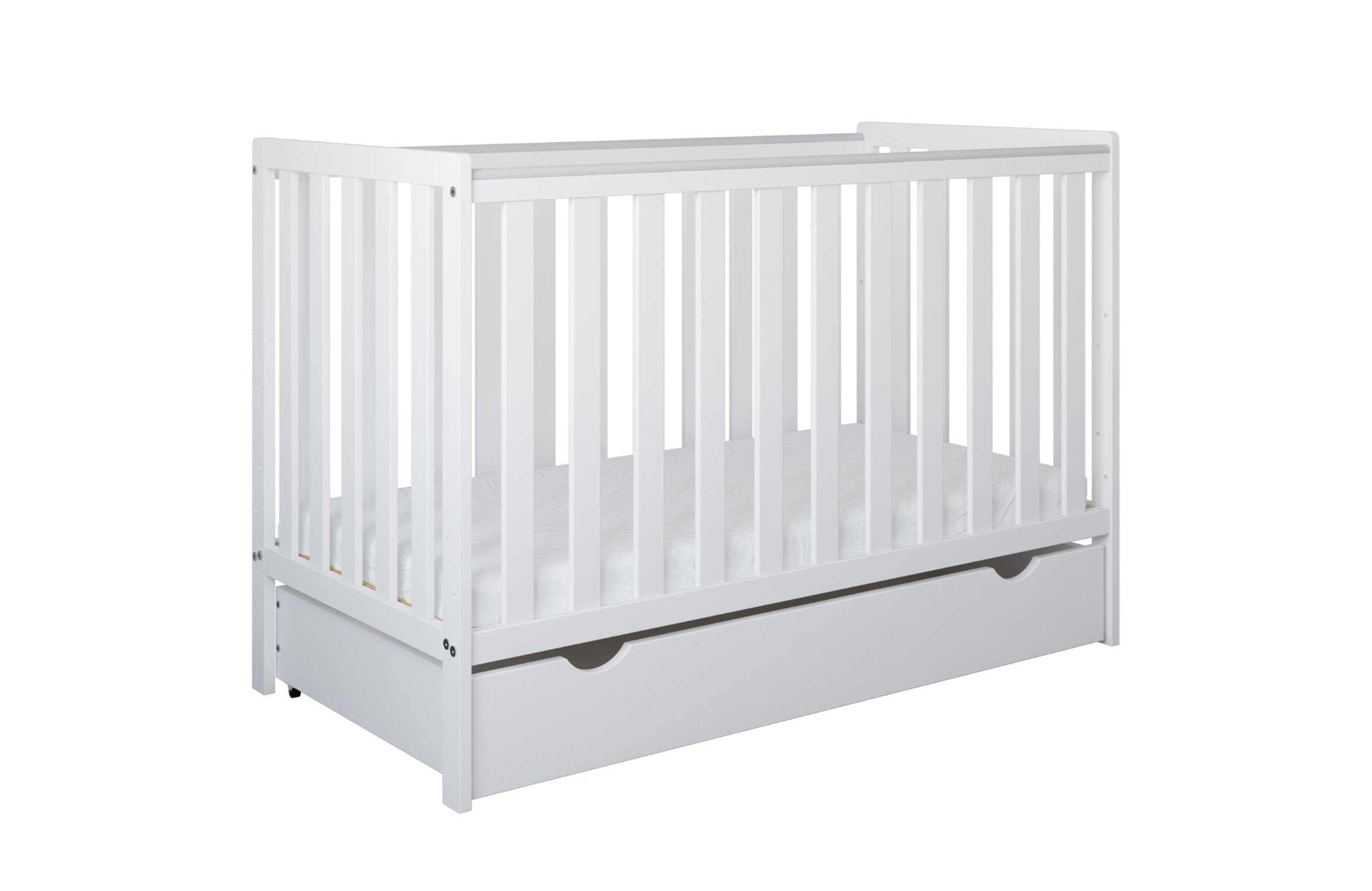 Opcjonalne dodatki – możliwość dokupienia praktycznej szuflady na kółkach, idealnej do przechowywania pościeli, ubranek lub zabawek, a także wybór jednego z dostępnych materacy, dostosowanych do potrzeb maluszka: