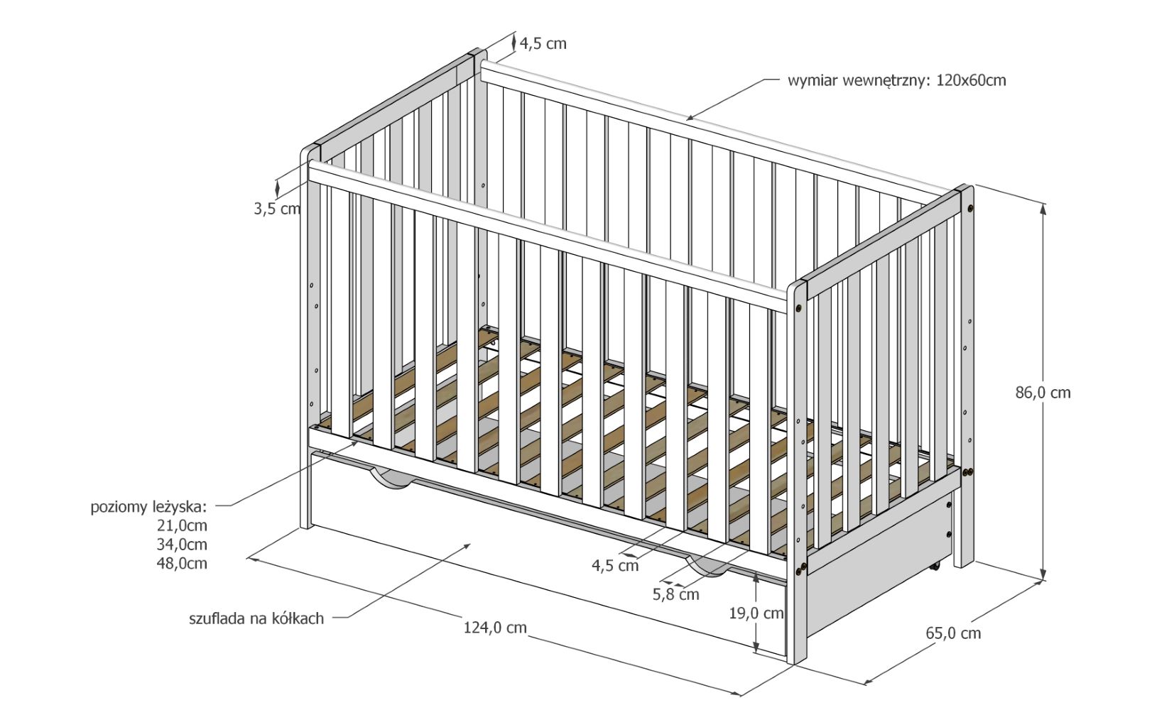 Łóżeczko ze szczebelkami - specyfikacja: