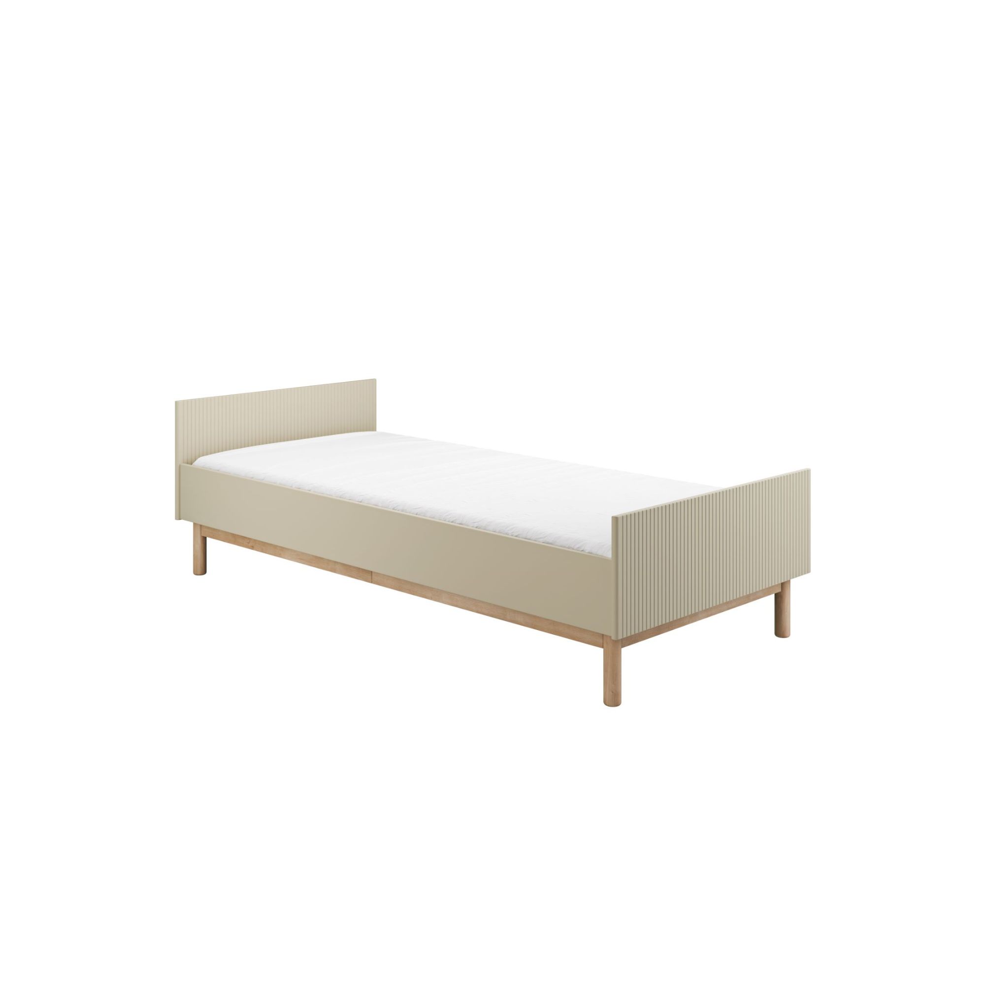 Łóżko Miloo 90x200 szampańskie to prosta, elegancka podstawa strefy snu w pokoju dziecka i nastolatka. Szampański odcień, ryflowane szczyty oraz bukowe nogi nawiązują do pozostałych mebli z kolekcji Miloo – dzięki temu łatwo zbudujesz spójny zestaw z regałem, biurkiem czy szafą w tym samym stylu.