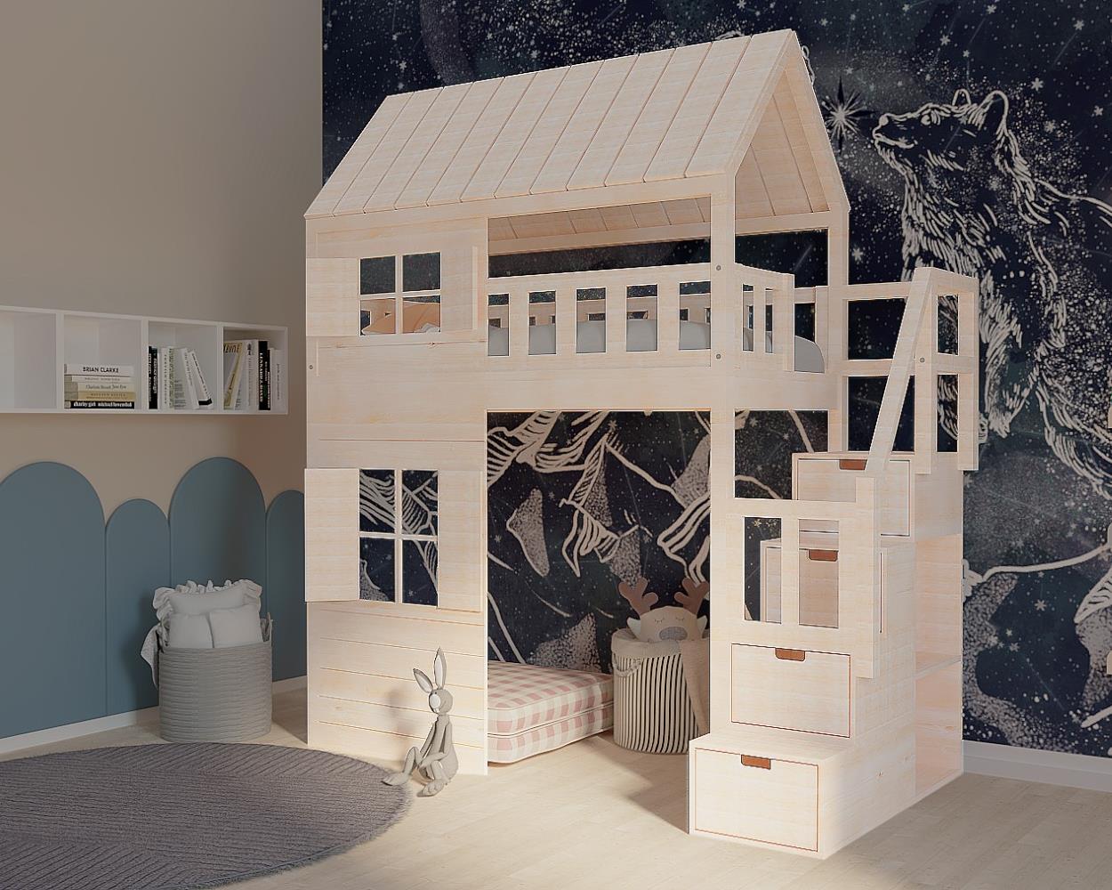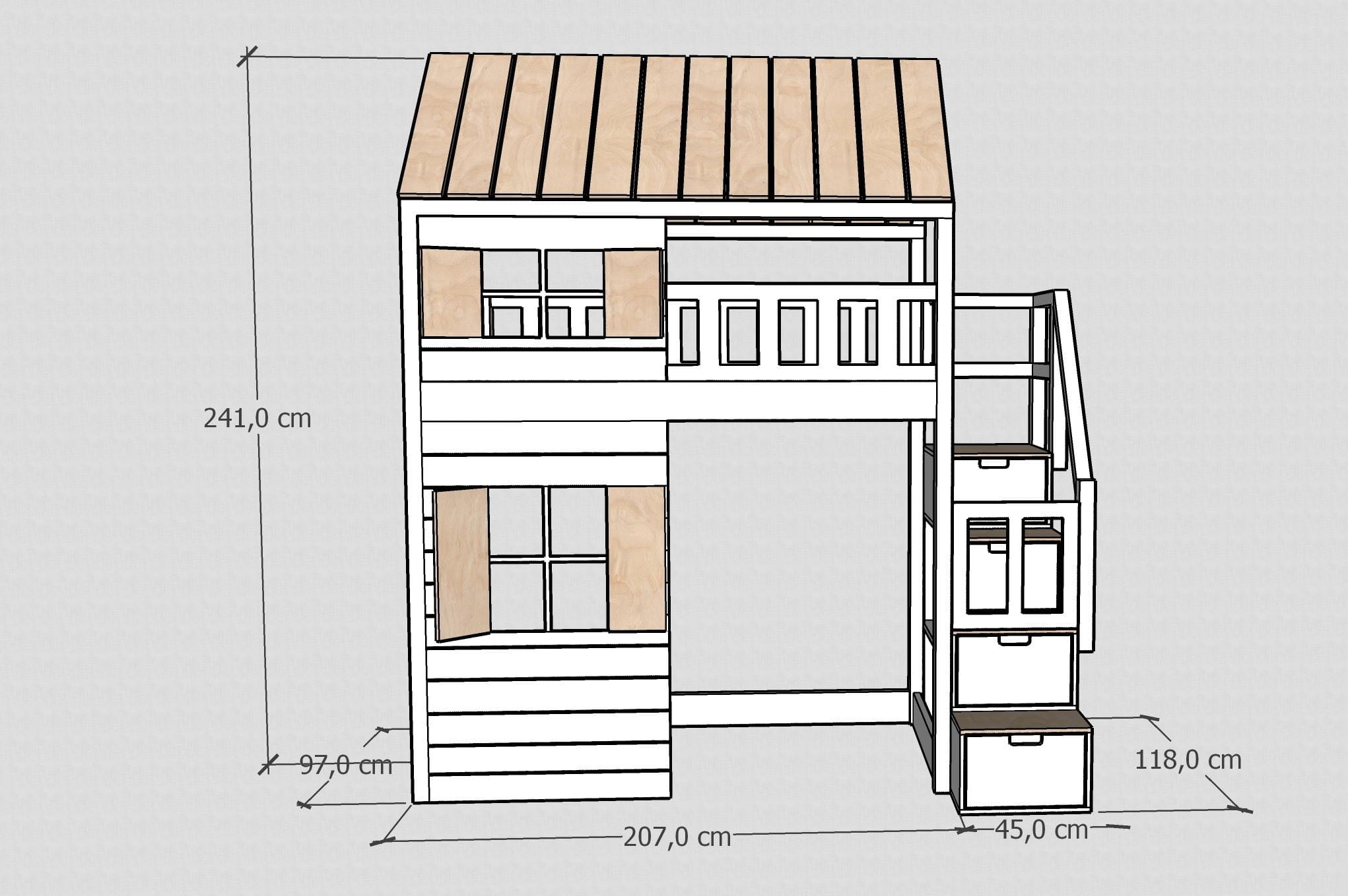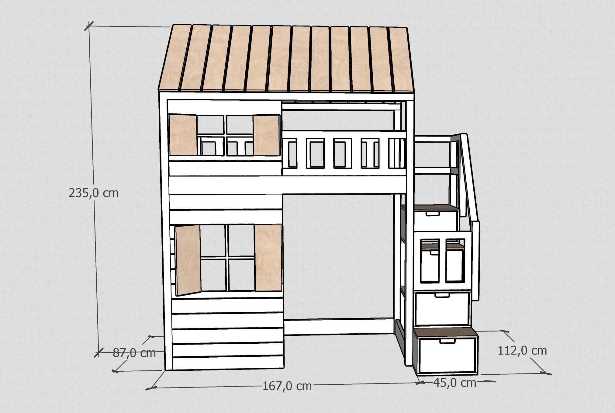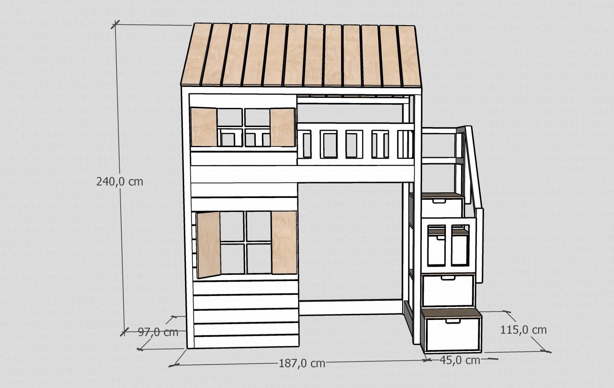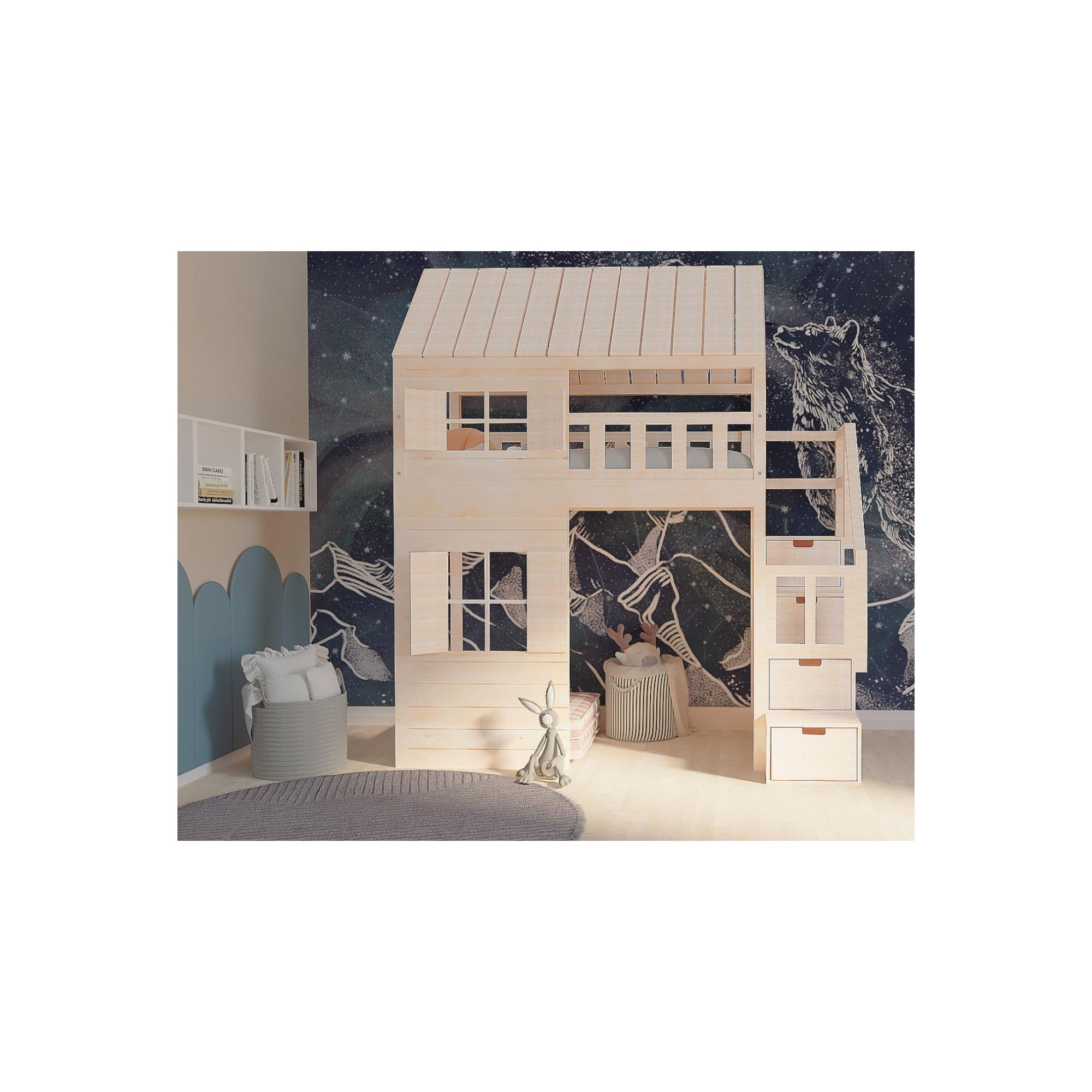 Łóżko domek antresola wykonane z drewna sosnowego, płyty stolarskiej, klejonki oraz sklejki liściastej w naturalnym kolorze z białymi dodatkami (daszek i okiennice). Całość lakierowana certyfikowanymi i bezpiecznymi dla dzieci lakierami i farbami na bazie wody. Produkt dostępny jest w trzech rozmiarach. Nie posiada materaca.