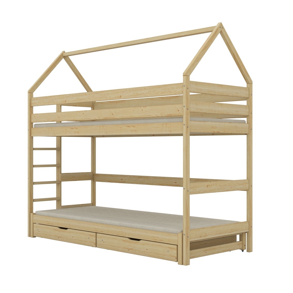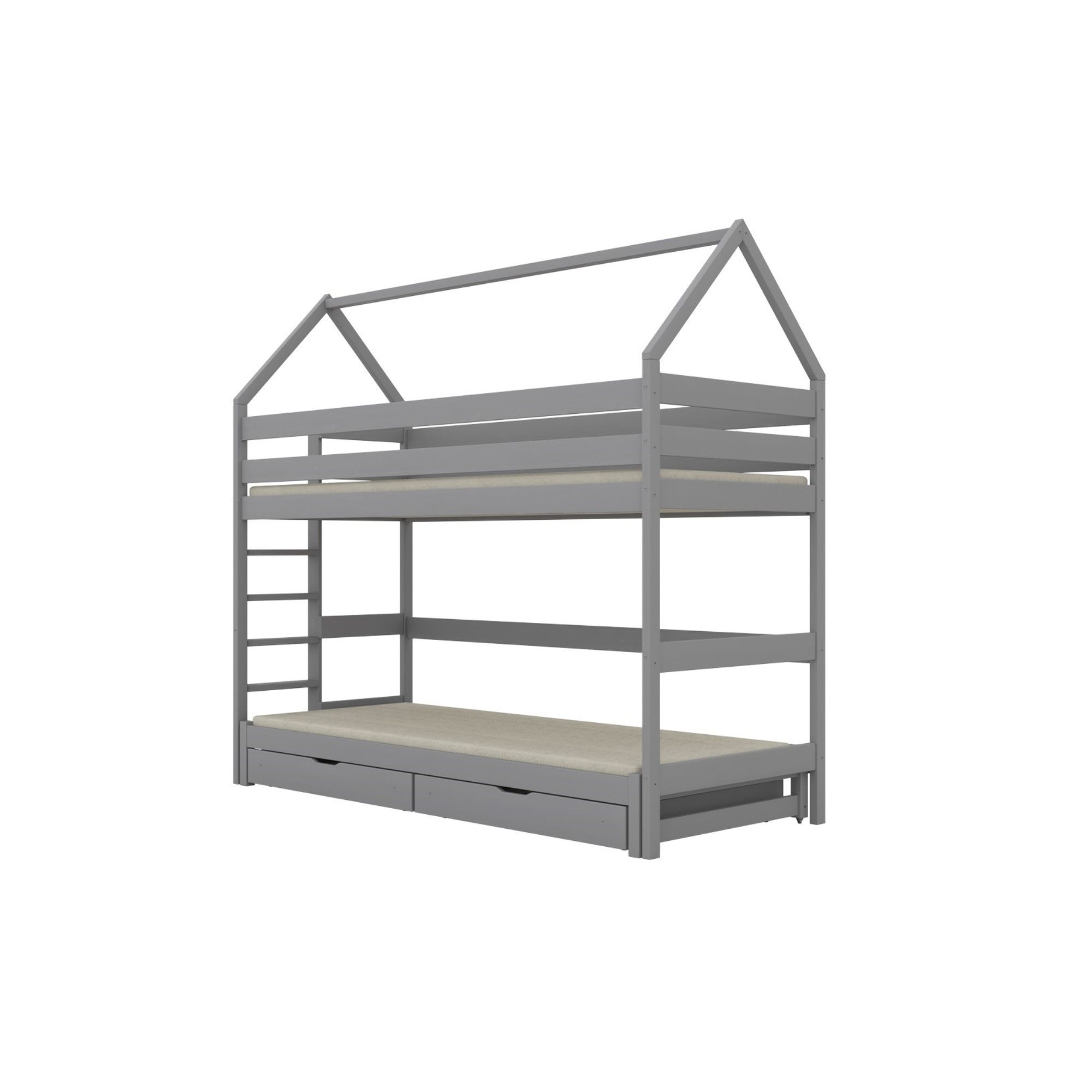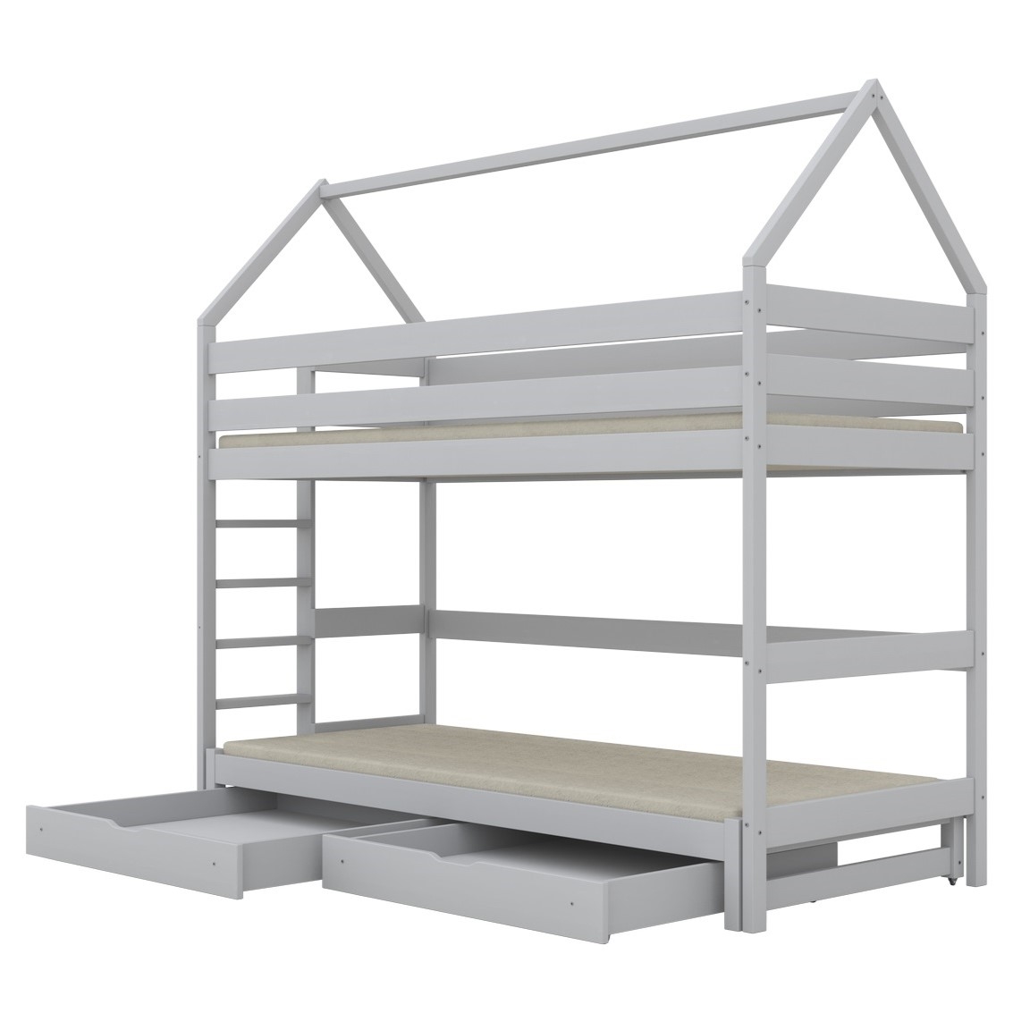 Łóżko domek na antresoli z wysuwanym spaniem i szufladami - Viko
