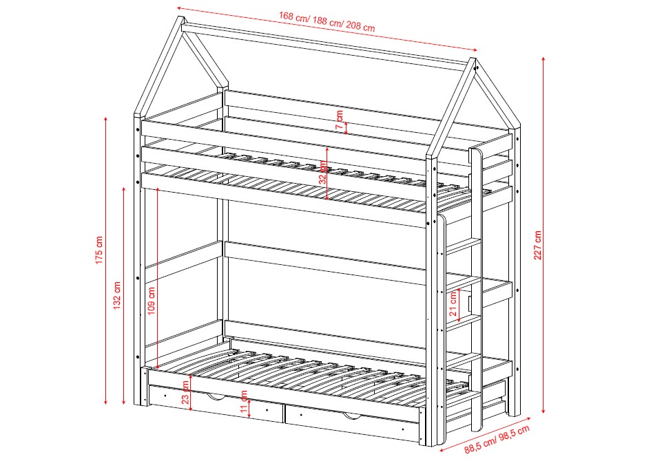 Najbardziej rozbudowana wersja łóżka Viko to kompletny zestaw do spania i przechowywania. Antresola, wysuwane łóżko (które można całkowicie rozdzielić), a także dwie pojemne szuflady zapewniają pełną organizację przestrzeni. Wygodne, stylowe i zaprojektowane z myślą o potrzebach dzieci i rodziców.