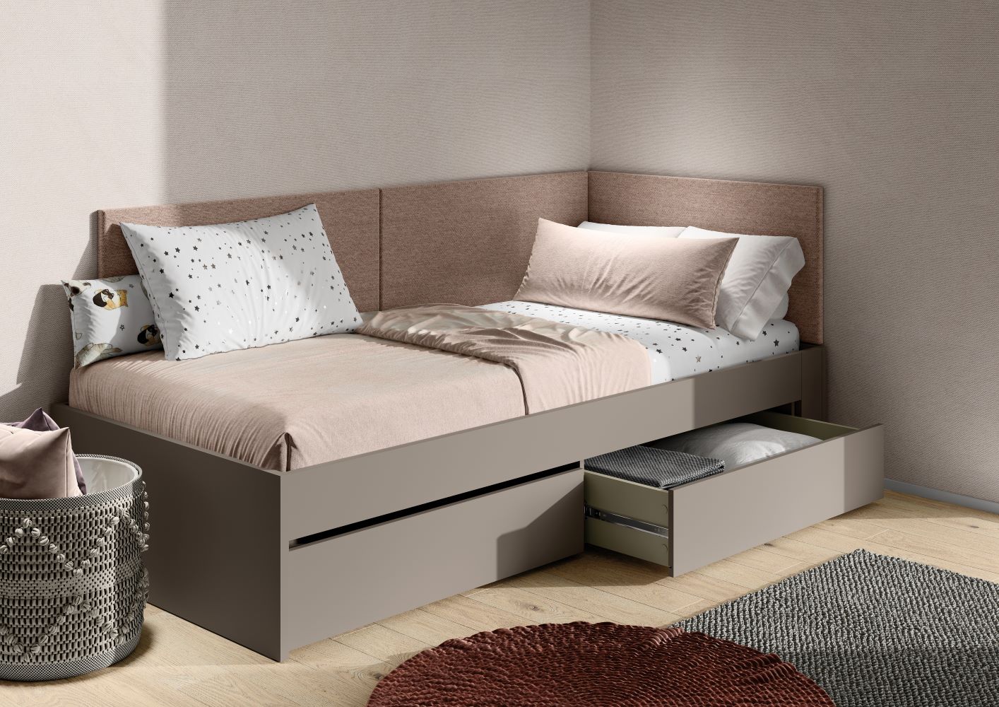 Minimalistyczna forma, stonowane kolory (clay gray) i uniwersalne wykończenia sprawiają, że łóżko pasuje zarówno do pokoju 10-latka, jak i nastolatka przygotowującego się do matury. Bez potrzeby wymiany co kilka lat.