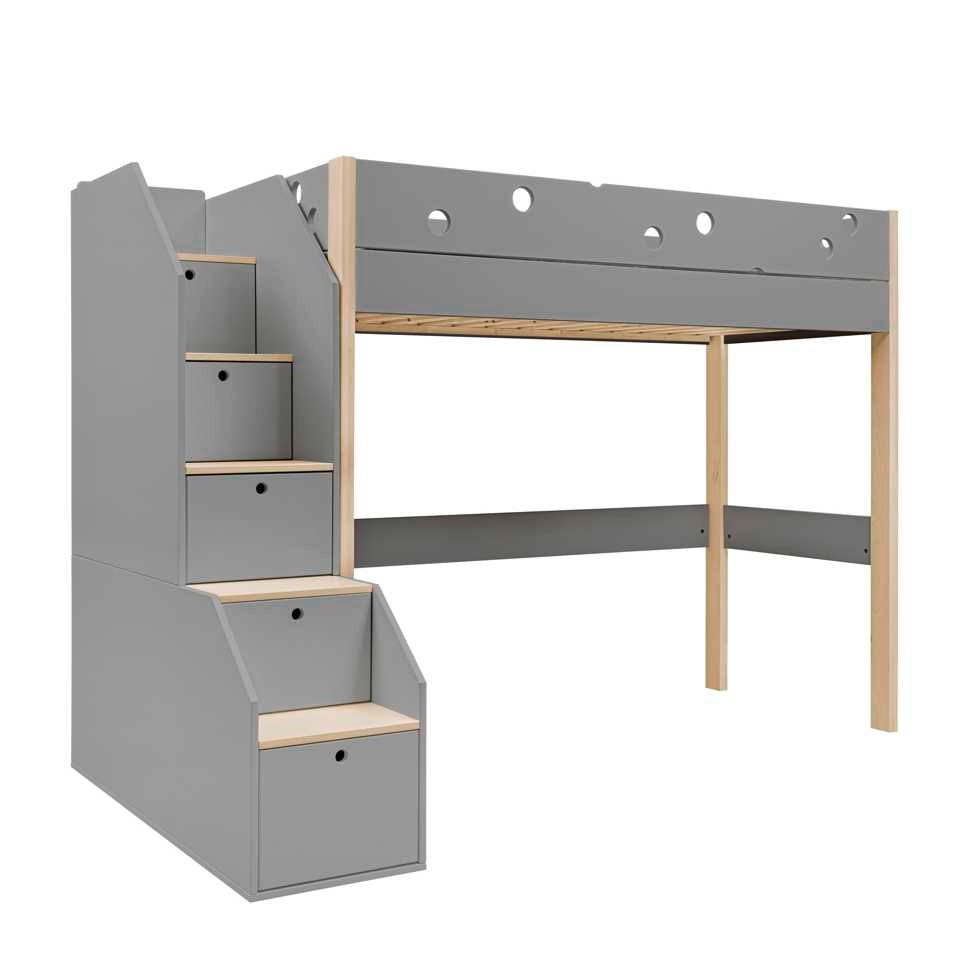 Łóżko na antresoli ze schodami Funflex 90x200 to mebel młodzieżowy łączący naturalne drewno brzozowe z gładkimi frontami z lakierowanego MDF w kolorze białym lub szarym. Wraz z innymi elementami kolekcji Funflex tworzy spójny, nowoczesny zestaw do pokoju nastolatka, w którym strefa snu i przechowywania zajmuje minimum miejsca, a daje maksimum funkcjonalności.