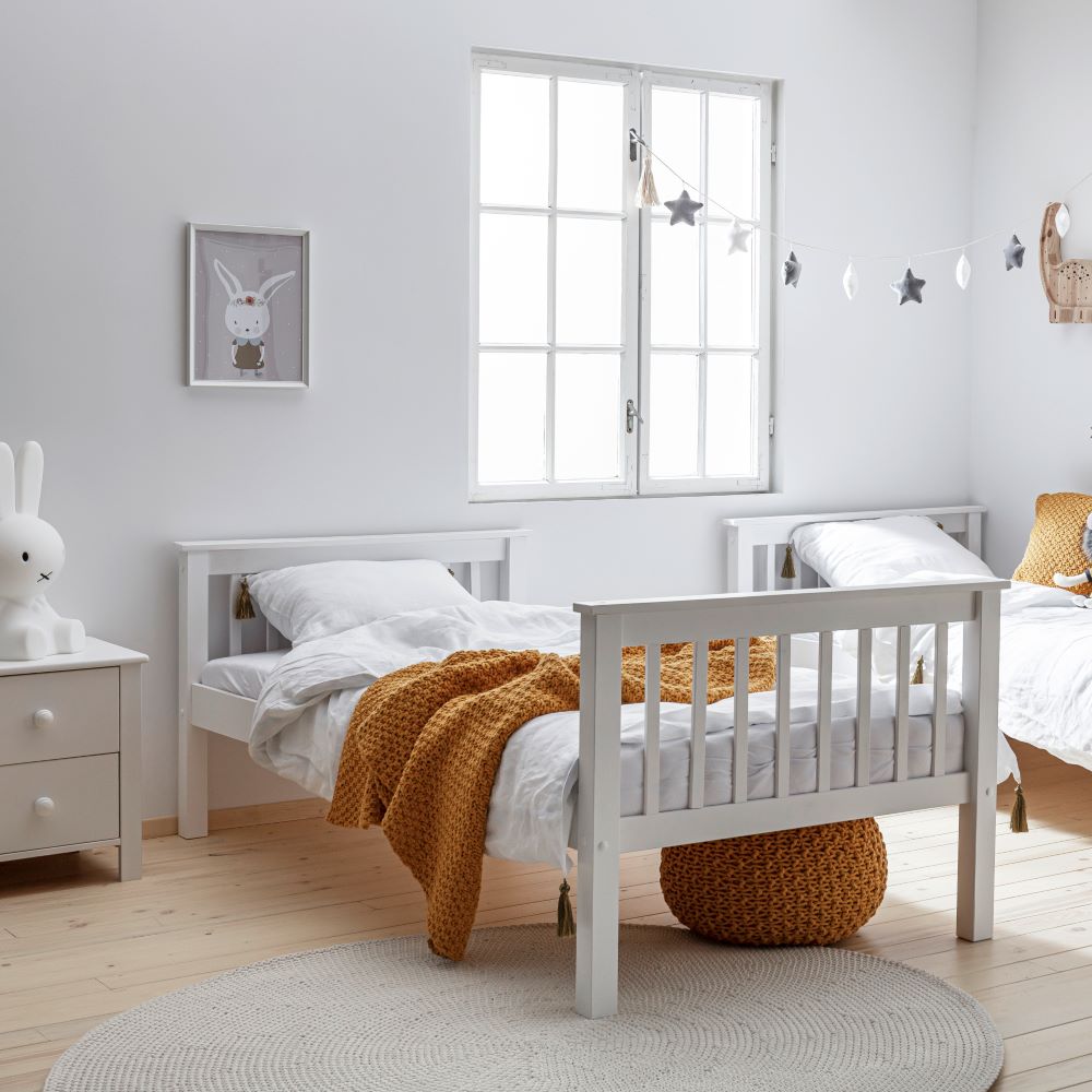 To wymiary, które pozwalają wygodnie ustawić łóżko przy ścianie, obok szafy, komody lub biurka Collet w pokoju dwóch dziewczynek.
