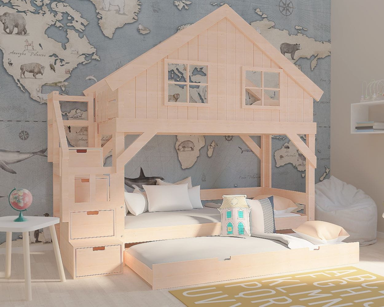 Łóżko piętrowe dla dziewczynki to zestawienie łóżka domku na górnym poziomie, do którego prowadzą wygodne schodki i niezabudowanego łóżka na dolnym. Dzięki takiemu projektowi, całość nabiera lekkiego wyglądu i nawet w mniejszym pokoju zostanie utrzymane poczucie przestrzeni. W schodkach znajdują się szufladki na zabawki, gry oraz wszystkie skarby dzieci. Z boku schodków znajdują się półeczki do zagospodarowania, a same schodki mogą być zamontowane z prawej lub lewej strony łóżka piętrowego.