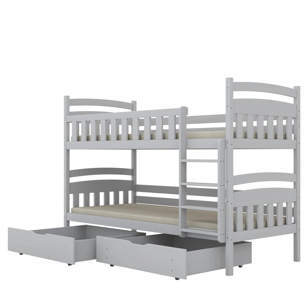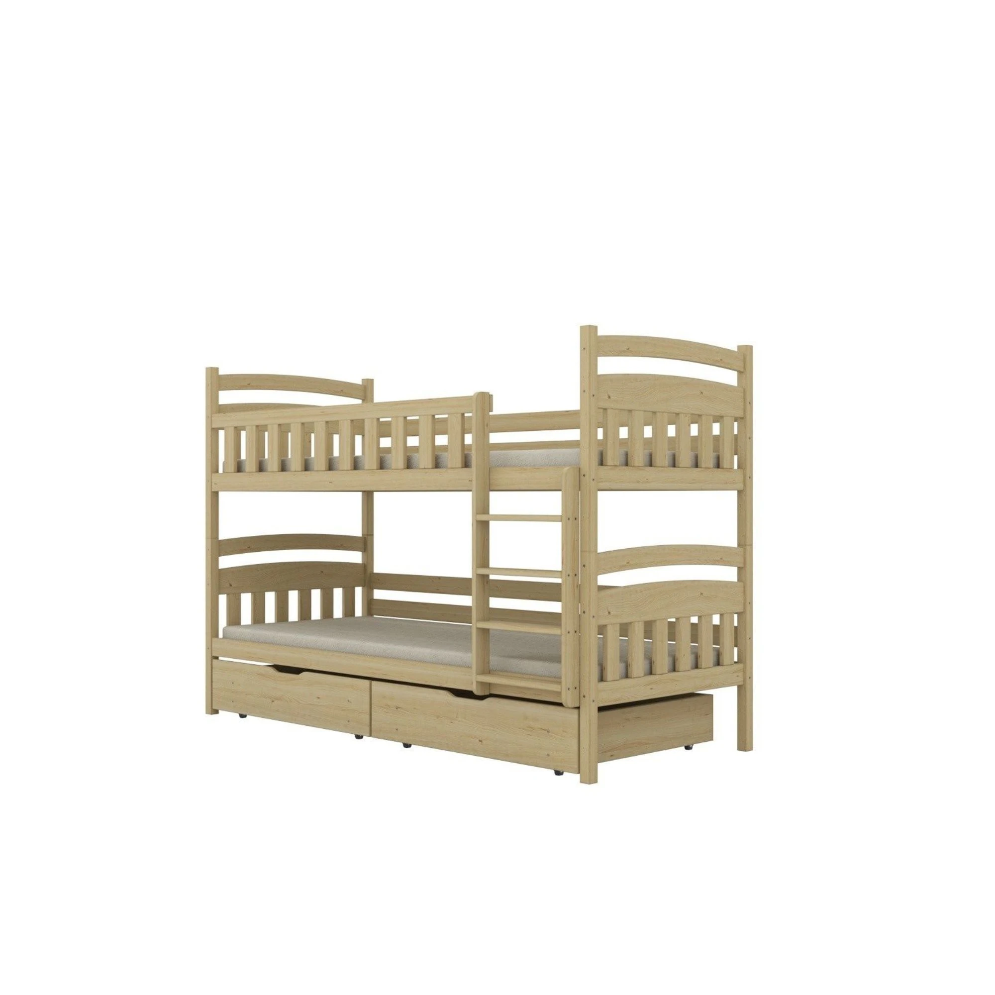 Łóżko piętrowe z szufladami Milo to idealne połączenie minimalizmu i funkcjonalności. Oprócz klasycznej, piętrowej konstrukcji oferuje dwie pojemne szuflady, które pomogą utrzymać porządek w dziecięcym pokoju – idealne na pościel, zabawki czy sezonowe ubrania.