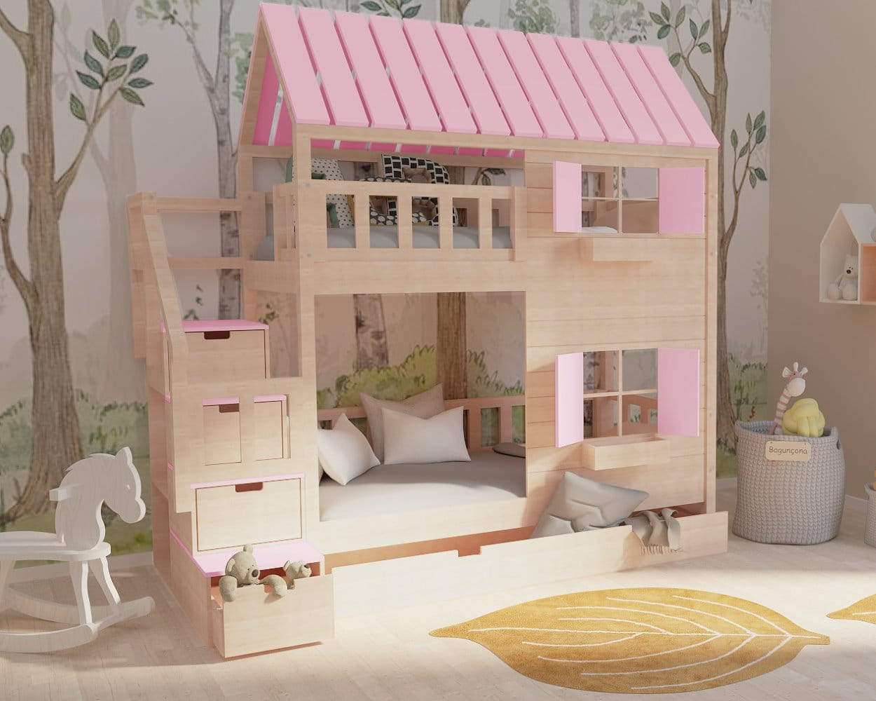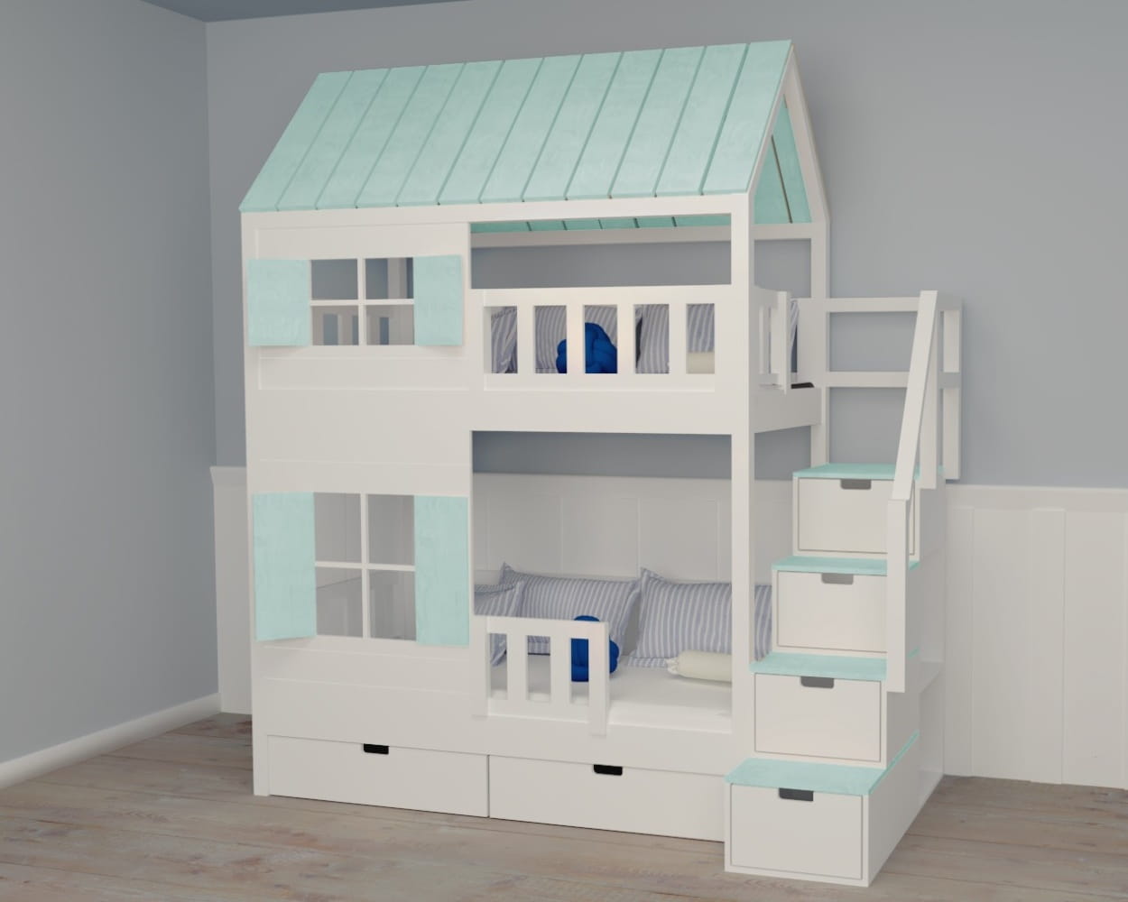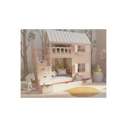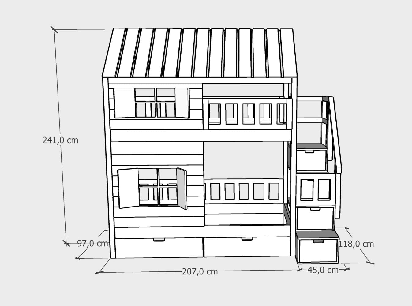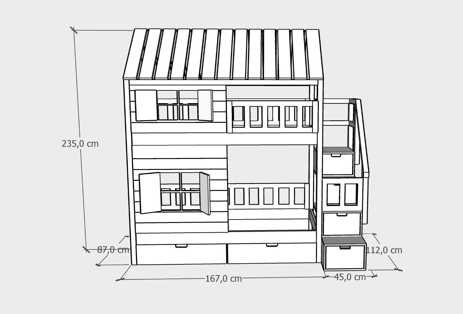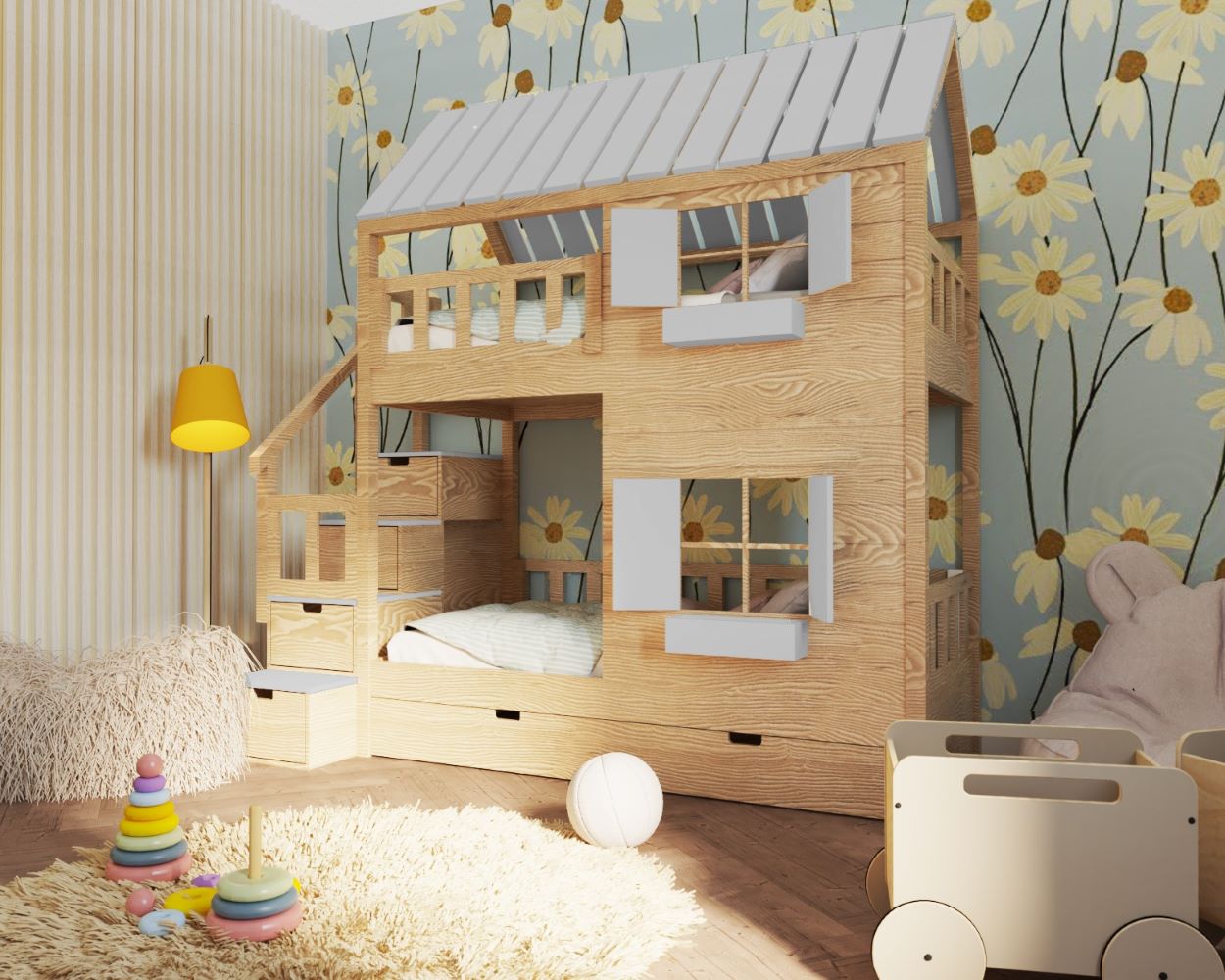 Łóżko piętrowe w kształcie domku z dwuspadowym daszkiem, okienkami z okiennicami i doniczkami oraz schodami, w których ukryte są szufladki na zabawki, książeczki i wszystkie skarby dziecka. Idealne rozwiązanie do pokoju dziecięcego, będące nie tylko bezpiecznym i komfortowym miejscem do spania, ale także źródłem wielu kreatywnych i wspaniałych zabaw. Łóżko piętrowe ze schodami dostępne jest w kilku wersjach kolorystycznych, również tej własnej oraz trzech rozmiarach.
