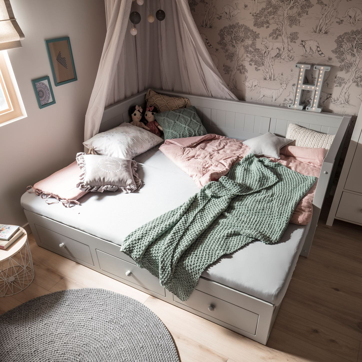 Łóżko rozkładane Dessi to praktyczne i estetyczne rozwiązanie do pokoju dziewczynki – zarówno młodszej, jak i nastolatki. Minimalistyczna, skandynawska forma, delikatne frezowania na bokach i oparciu oraz drewniane uchwyty w szufladach sprawiają, że Dessi doskonale komponuje się z kolekcją mebli Collet i innymi pastelowymi meblami w dziecięcym pokoju. To jeden mebel, który łączy funkcję łóżka pojedynczego, dwuosobowego i sofy dziennej, pomagając sprytnie zaaranżować nawet niewielkie wnętrze.