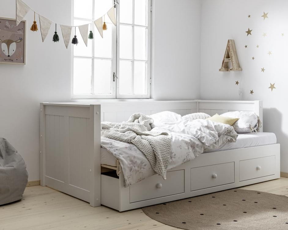 Łóżko rozkładane Dessi – drewniane łóżko do pokoju dziewczynki z szufladami