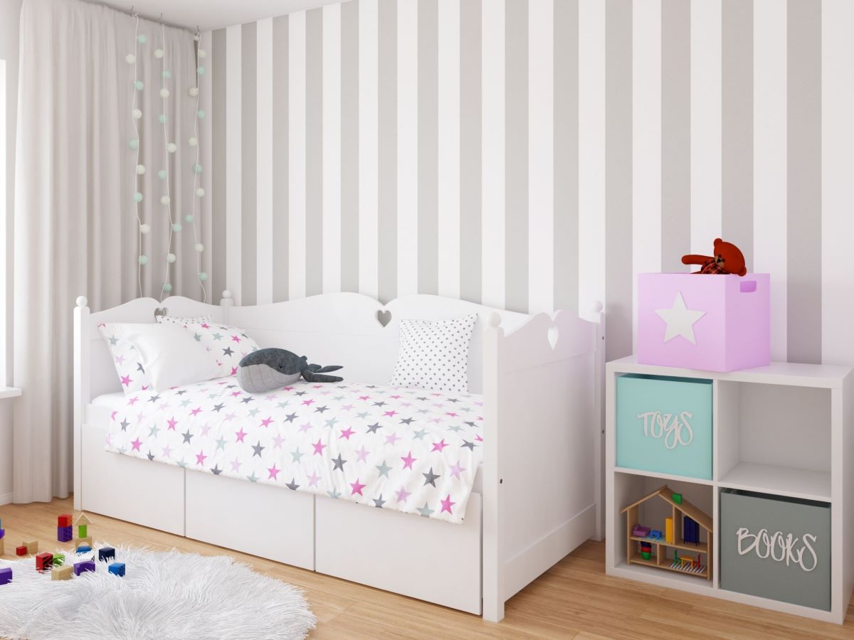 Łóżko z szufladami dla dziewczynki Bella 90x200 to białe łóżko dzienne zabudowane z trzech stron, z wysokim oparciem i ozdobnymi szczytami z serduszkami. Tworzy przytulną, bezpieczną strefę snu i odpoczynku, a jednocześnie oferuje dużo miejsca na przechowywanie pod materacem. Dzięki klasycznej bieli doskonale wpisuje się w jasne aranżacje pokoju dziewczynki i idealnie łączy się z innymi meblami dla dziewczynki z oferty dedekids.pl.
