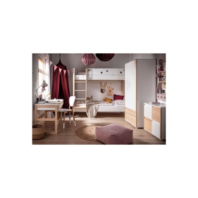 Zestaw Funflex świetnie łączy się z dodatkami w odcieniach burgundu, różu i beżu, co widać na aranżacji: baldachim zawieszony obok łóżka, miękki puf i dekoracyjne lampy tworzą przytulny klimat. Jasna podłoga i naturalne drewno podkreślają skandynawski charakter wnętrza, a białe fronty optycznie powiększają pokój.