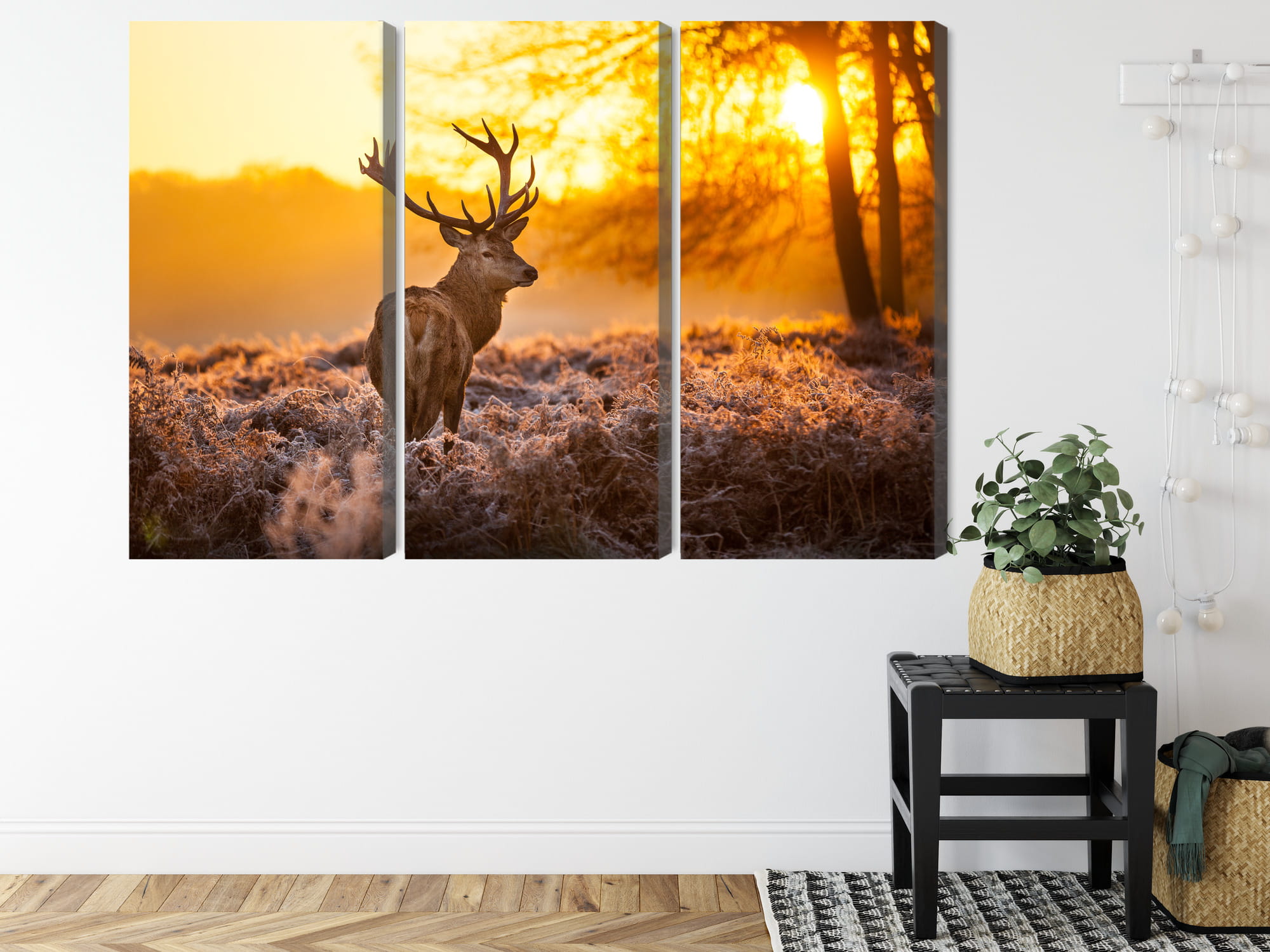 Obraz Wieloczęściowy Jeleń W Lesie O Zachodzie Słońca 3D