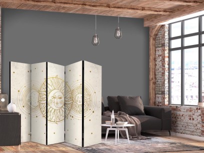 Parawan "Parawan - Złote Słońce i Księżyc - artystyczna ilustracja w stylu retro" to element wyposażenia dający wiele możliwości. Cechuje go m.in. praktyczność. Jego podstawowym zadaniem jest podzielenie przestrzeni na kilka stref w dyskretny i estetyczny sposób. Parawany pokojowe pozwalają na odseparowanie w ciekawy sposób części przeznaczonej do relaksu od tej wyznaczonej do pracy. Dlatego często znajdują one zastosowanie w salonie. Parawany pozwalają też na sprytne ukrycie czegoś, co nie powinno być w pełni widoczne, przykładowo stojaka z ubraniami czy też suszarki z praniem. Można wykorzystać je więc na różne sposoby, zależnie od własnych potrzeb i wymagań. Dostępne w naszej ofercie parawany pokojowe to flizelinowe płótno zamocowane na drewnianym stelażu. Wyróżniają się bardzo solidną konstrukcją, a do wyboru są dwa formaty: 3-częściowy oraz 5-częściowy. Poszczególne elementy są ze sobą połączone za pomocą metalowych, mocnych zawiasów. Złożenie i rozłożenie parawanu nie stanowi żadnego problemu.