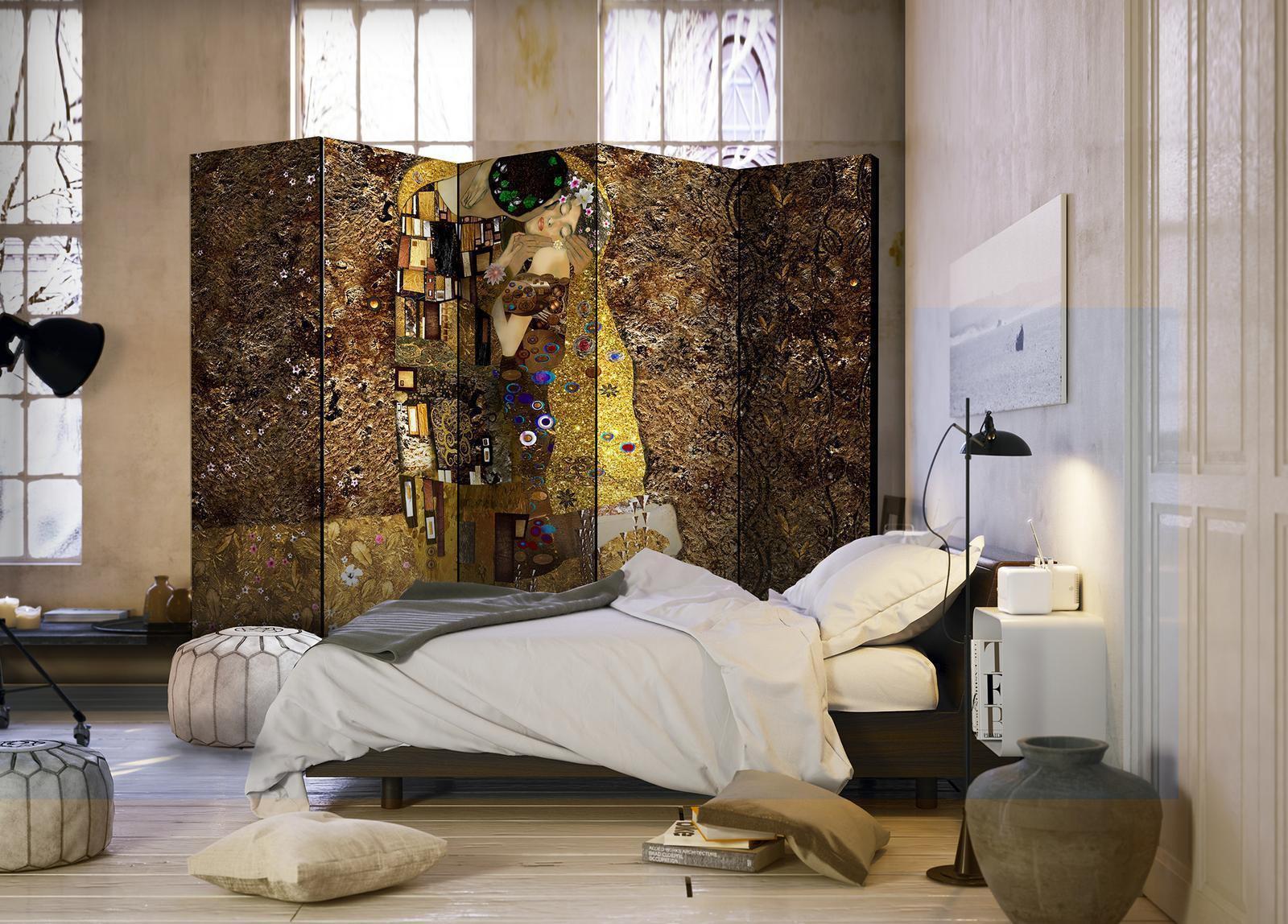 Parawan "Parawan - Złoty pocałunek II" to element wyposażenia dający wiele możliwości. Cechuje go m.in. praktyczność. Jego podstawowym zadaniem jest podzielenie przestrzeni na kilka stref w dyskretny i estetyczny sposób. Parawany pokojowe pozwalają na odseparowanie w ciekawy sposób części przeznaczonej do relaksu od tej wyznaczonej do pracy. Dlatego często znajdują one zastosowanie w salonie. Parawany pozwalają też na sprytne ukrycie czegoś, co nie powinno być w pełni widoczne, przykładowo stojaka z ubraniami czy też suszarki z praniem. Można wykorzystać je więc na różne sposoby, zależnie od własnych potrzeb i wymagań. Dostępne w naszej ofercie parawany pokojowe to flizelinowe płótno zamocowane na drewnianym stelażu. Wyróżniają się bardzo solidną konstrukcją, a do wyboru są dwa formaty: 3-częściowy oraz 5-częściowy. Poszczególne elementy są ze sobą połączone za pomocą metalowych, mocnych zawiasów. Złożenie i rozłożenie parawanu nie stanowi żadnego problemu.