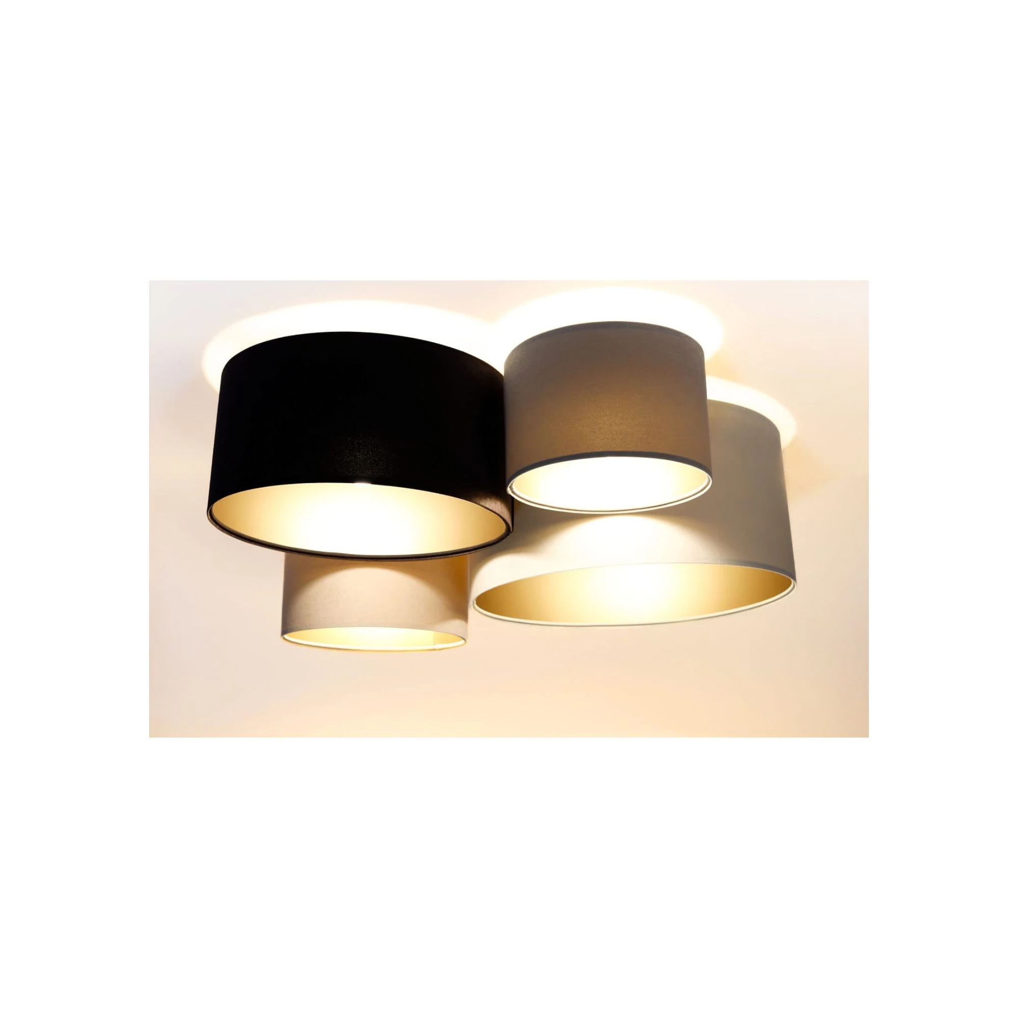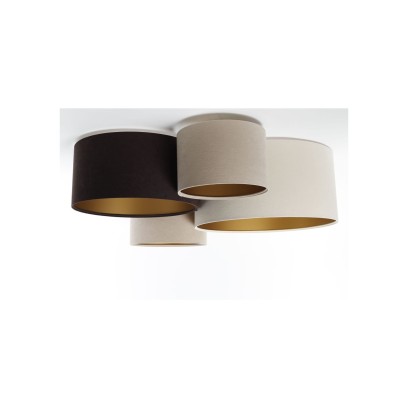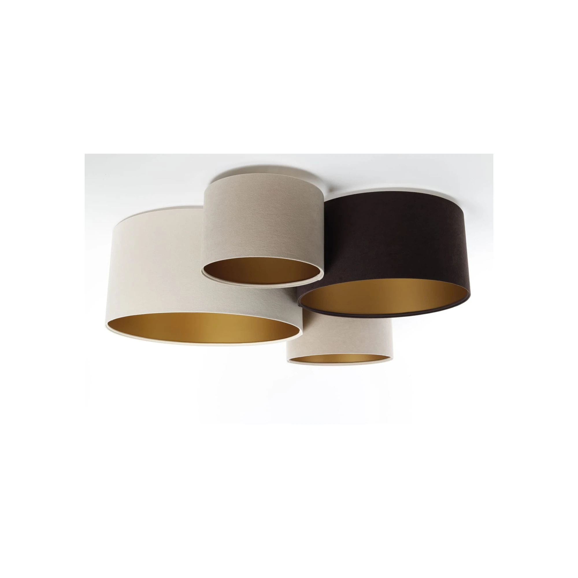 Kompozycja czterech abażurów o różnych wymiarach sprawia, że lampa wygląda ciekawie z każdej perspektywy. Welurowa powierzchnia dodaje miękkości, a zestawienie kilku kolorów pozwala łatwiej dopasować plafon do mebli, tekstyliów i dodatków. Złote wnętrze nie tylko zdobi lampę, ale też wpływa na przyjemniejszy odbiór światła we wnętrzu.
