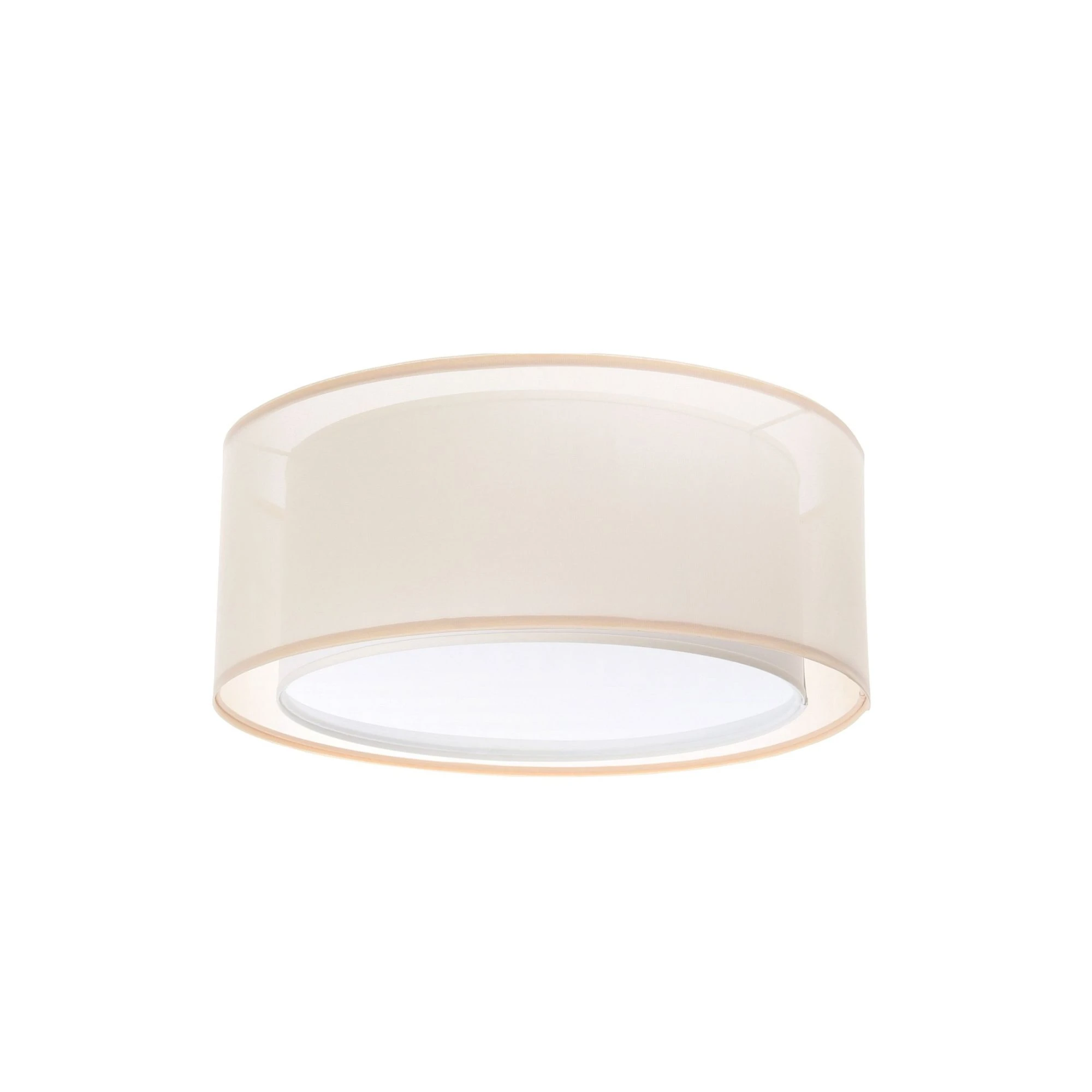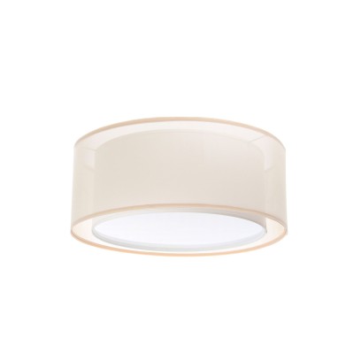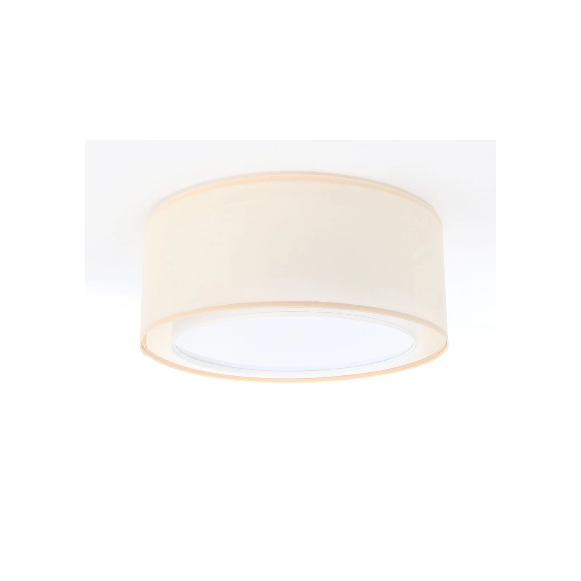 Model ma formę dwuściennego walca, a jego zewnętrzna warstwa została wykonana z półprzezroczystej tkaniny. Dzięki temu plafon wygląda lekko, miękko i bardziej dekoracyjnie niż klasyczne, proste oprawy sufitowe.