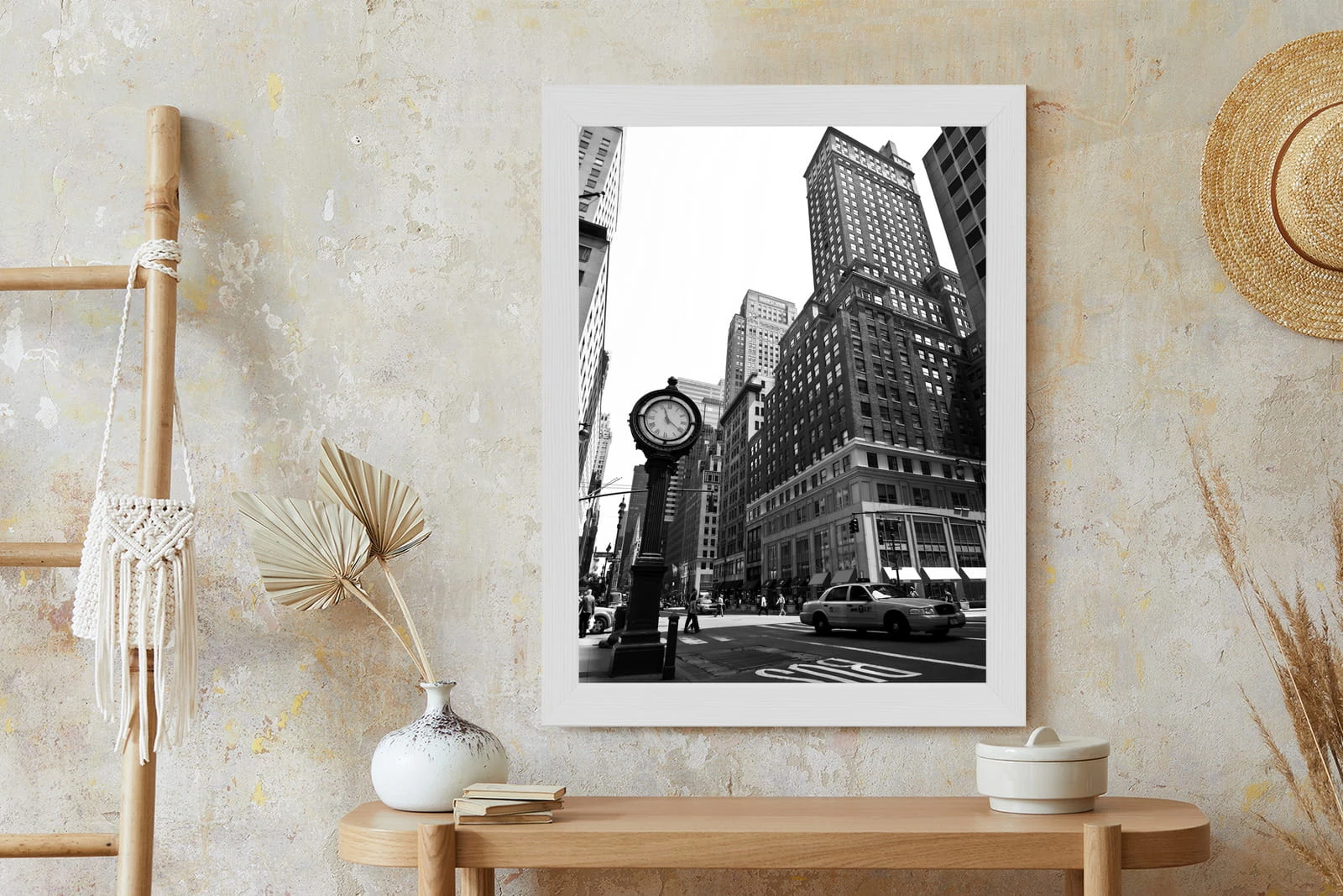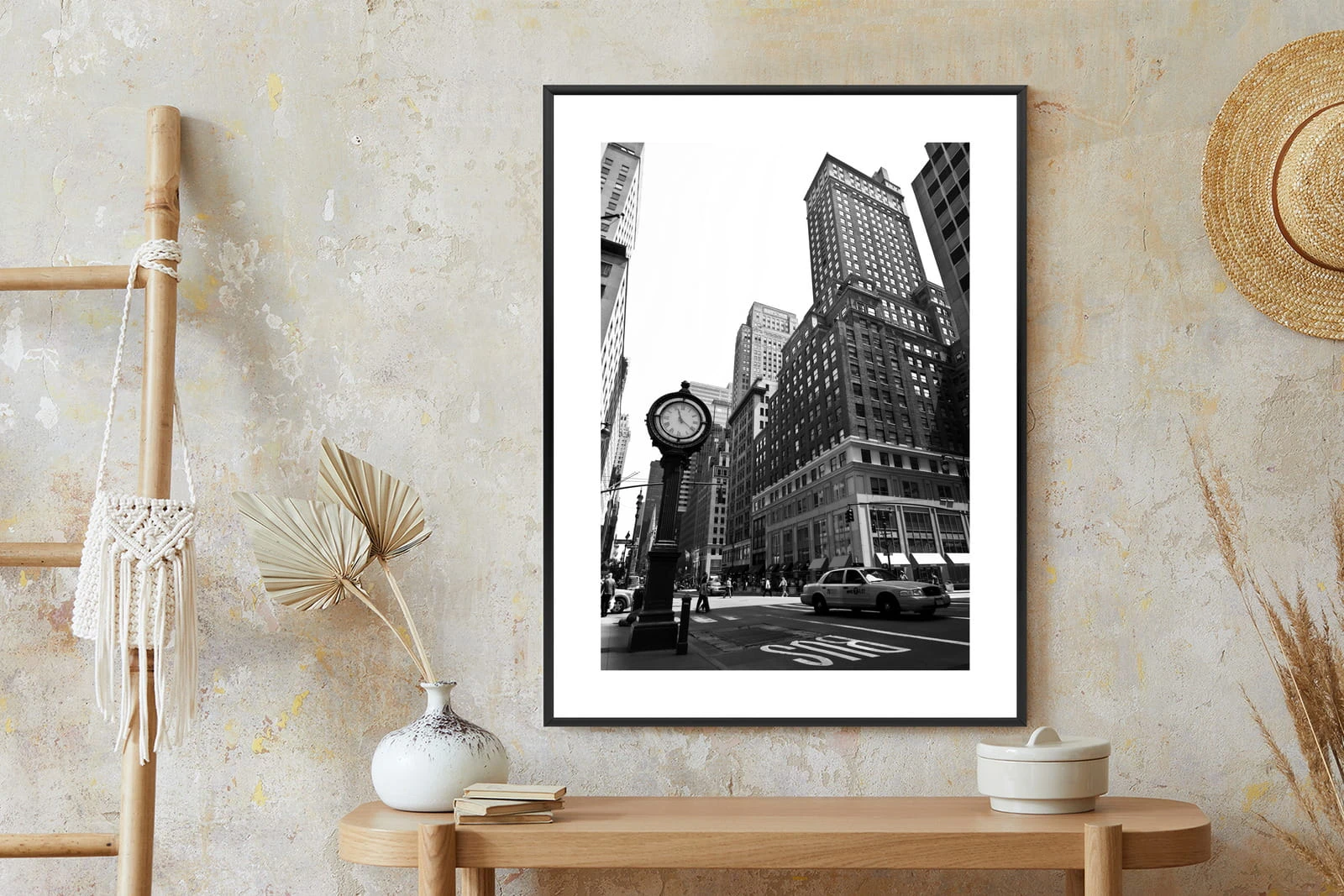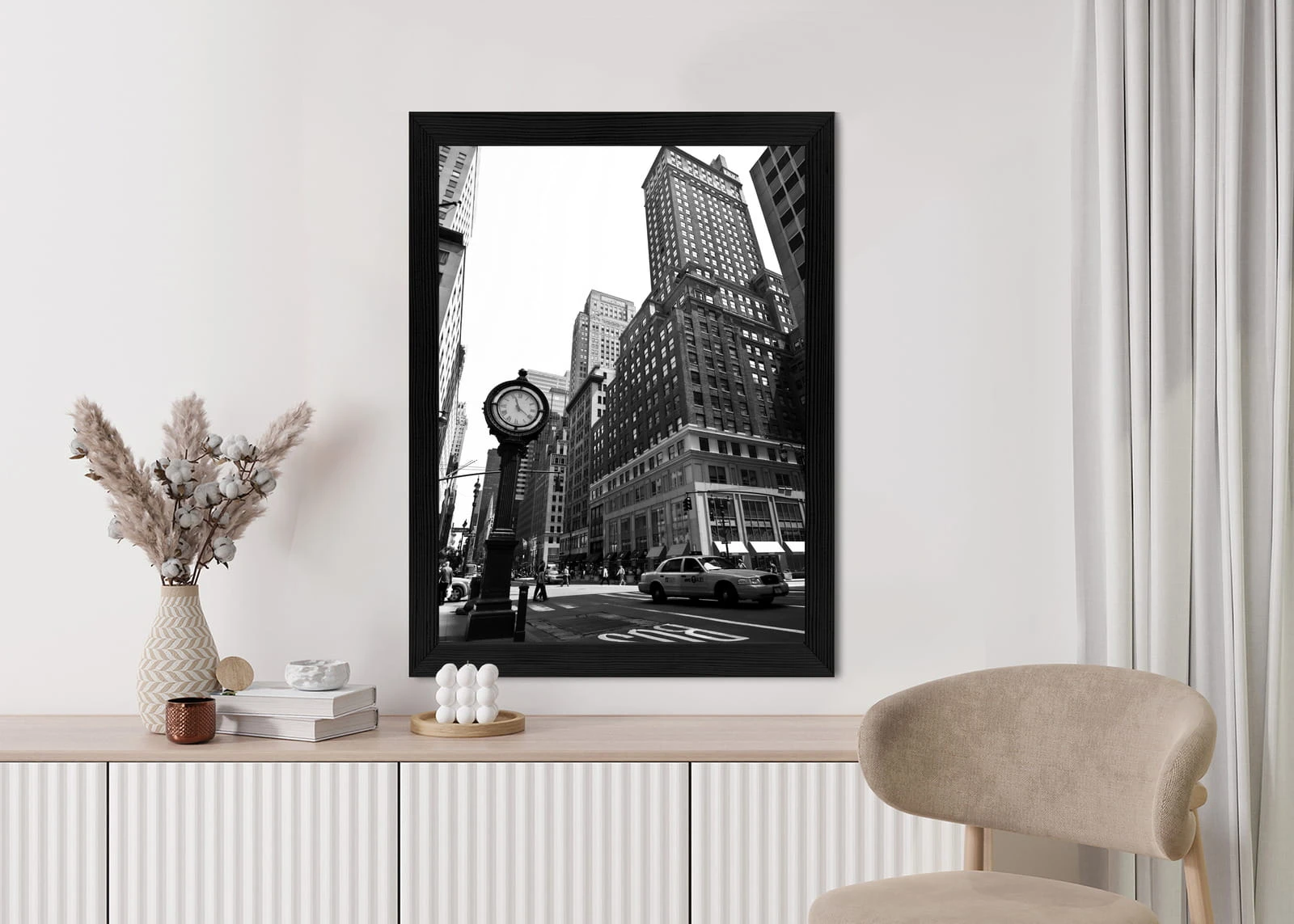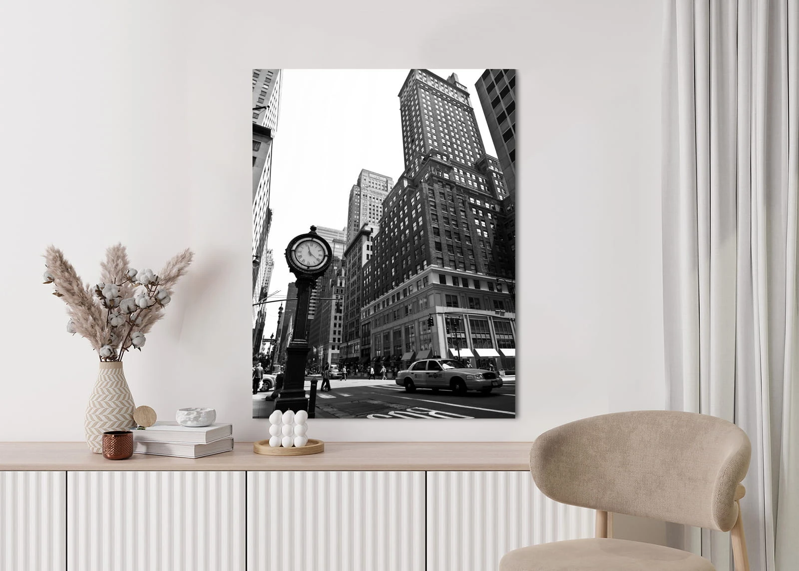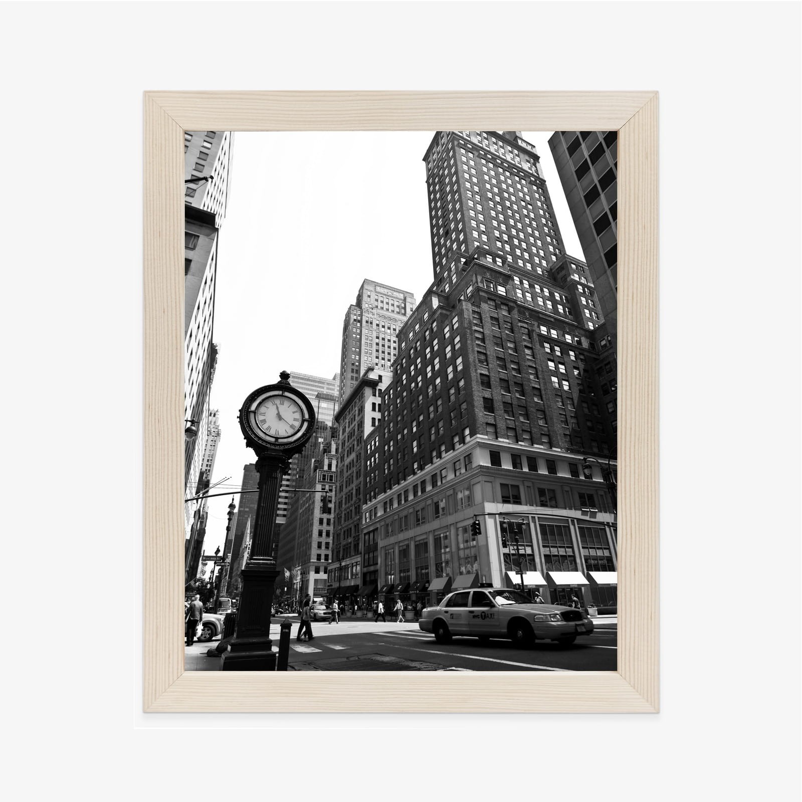 Plakat Czarno Biały Zegar I Taksówka Na Ulicy Nowego Jorku