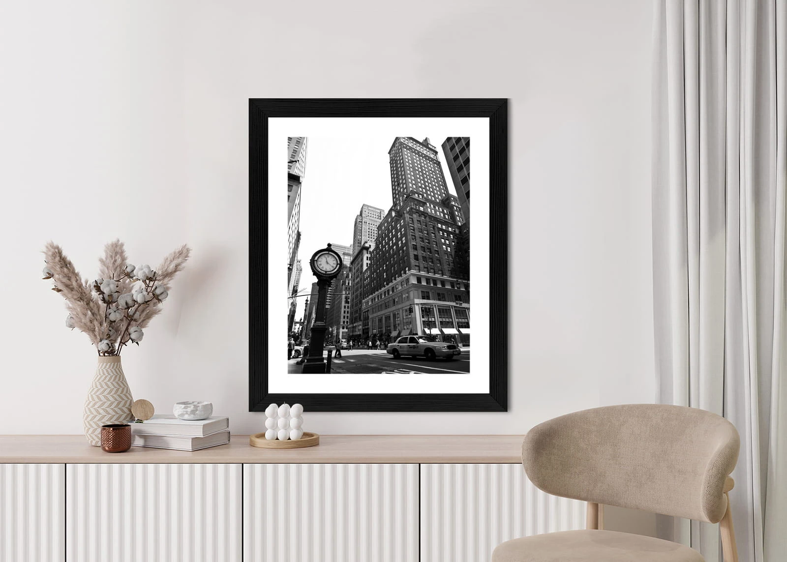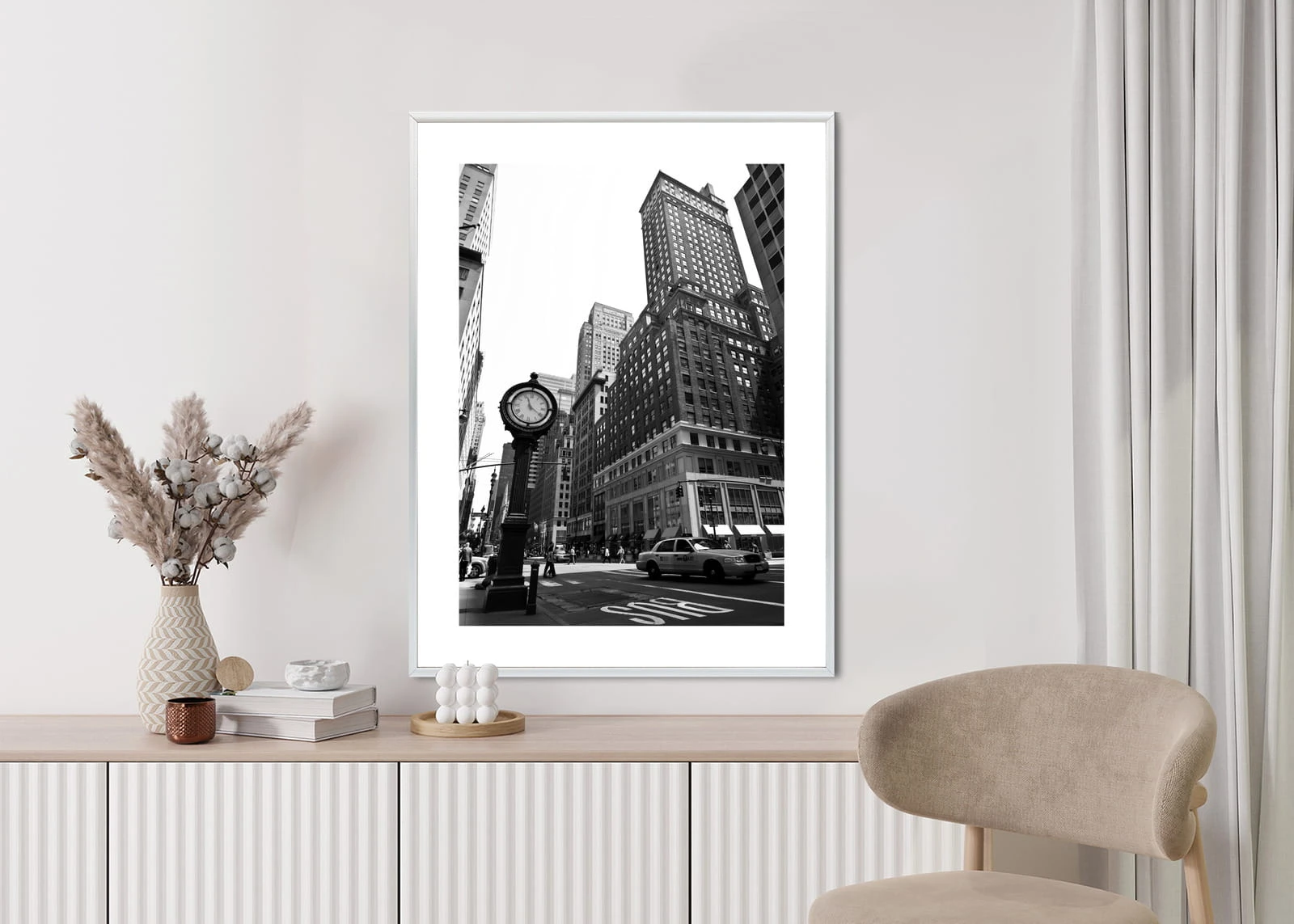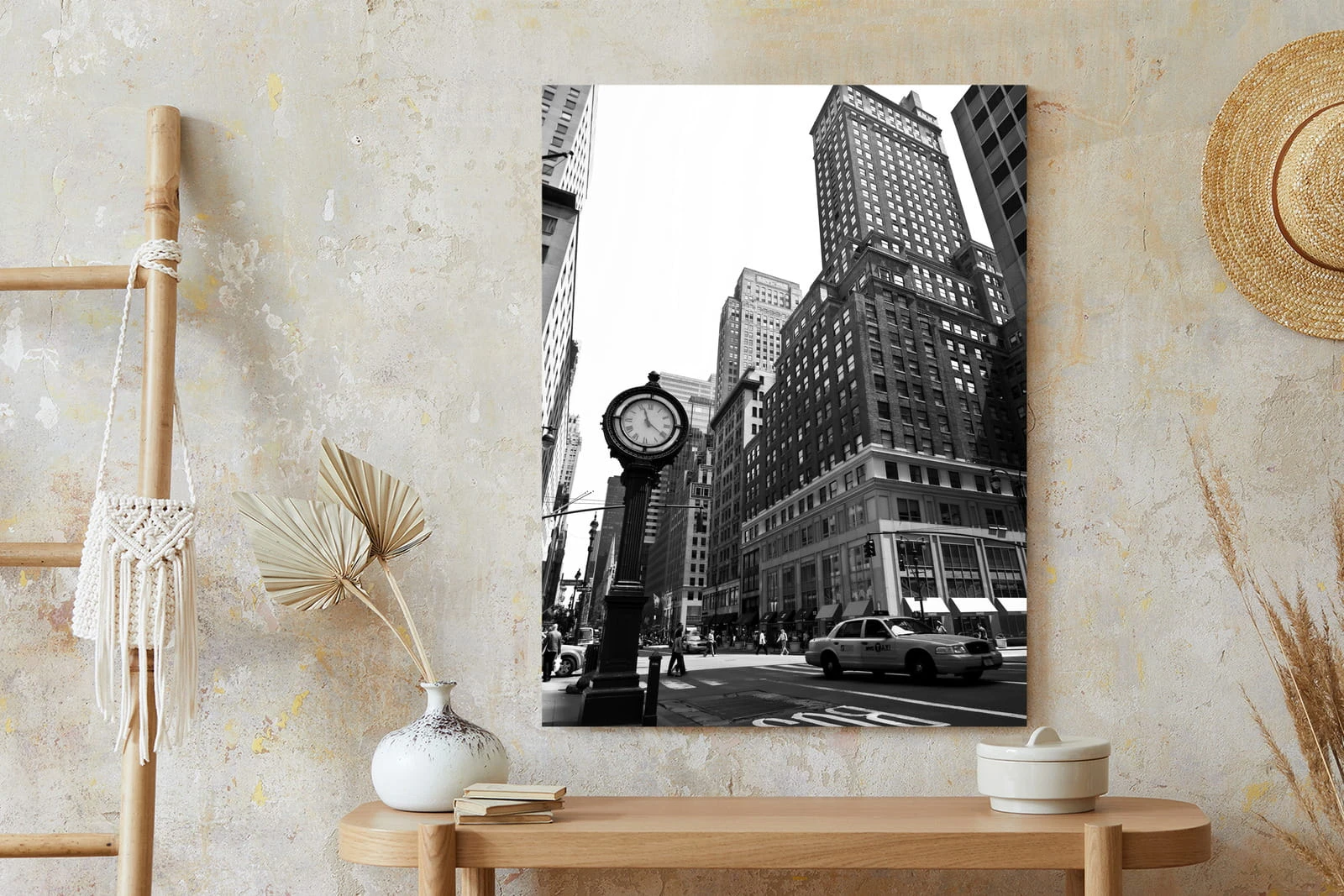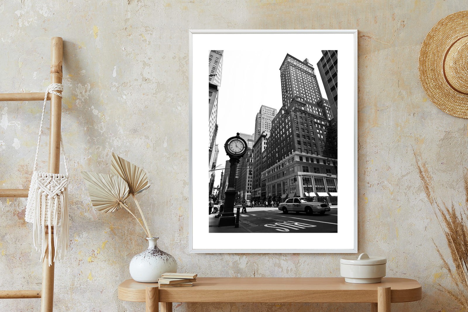 Plakat Czarno Biały Zegar I Taksówka Na Ulicy Nowego Jorku