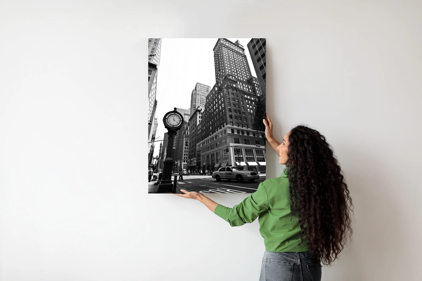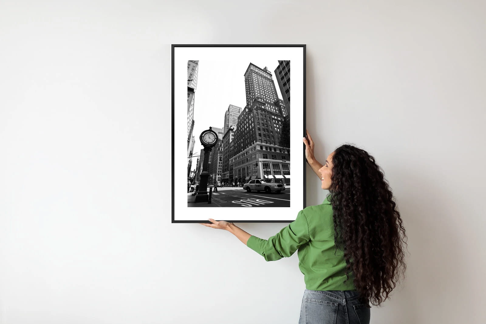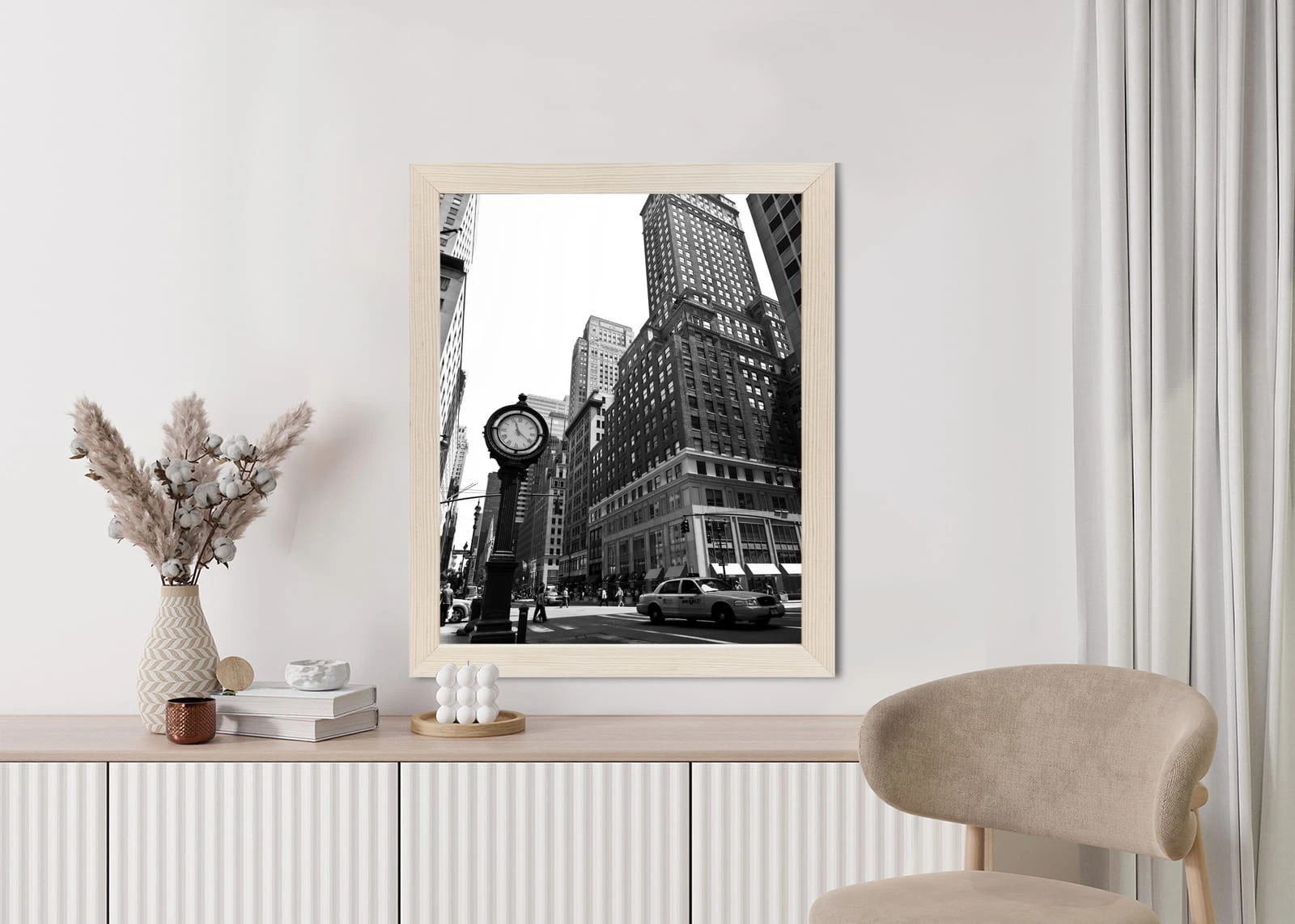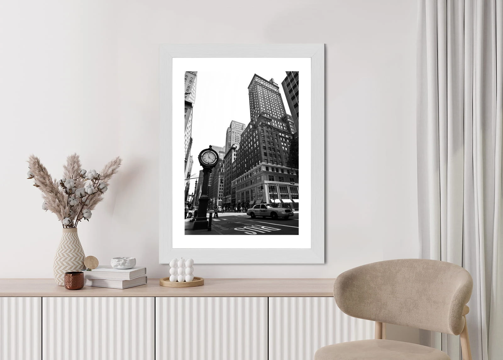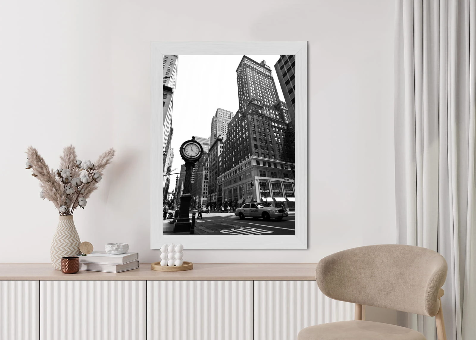 Plakat Czarno Biały Zegar I Taksówka Na Ulicy Nowego Jorku