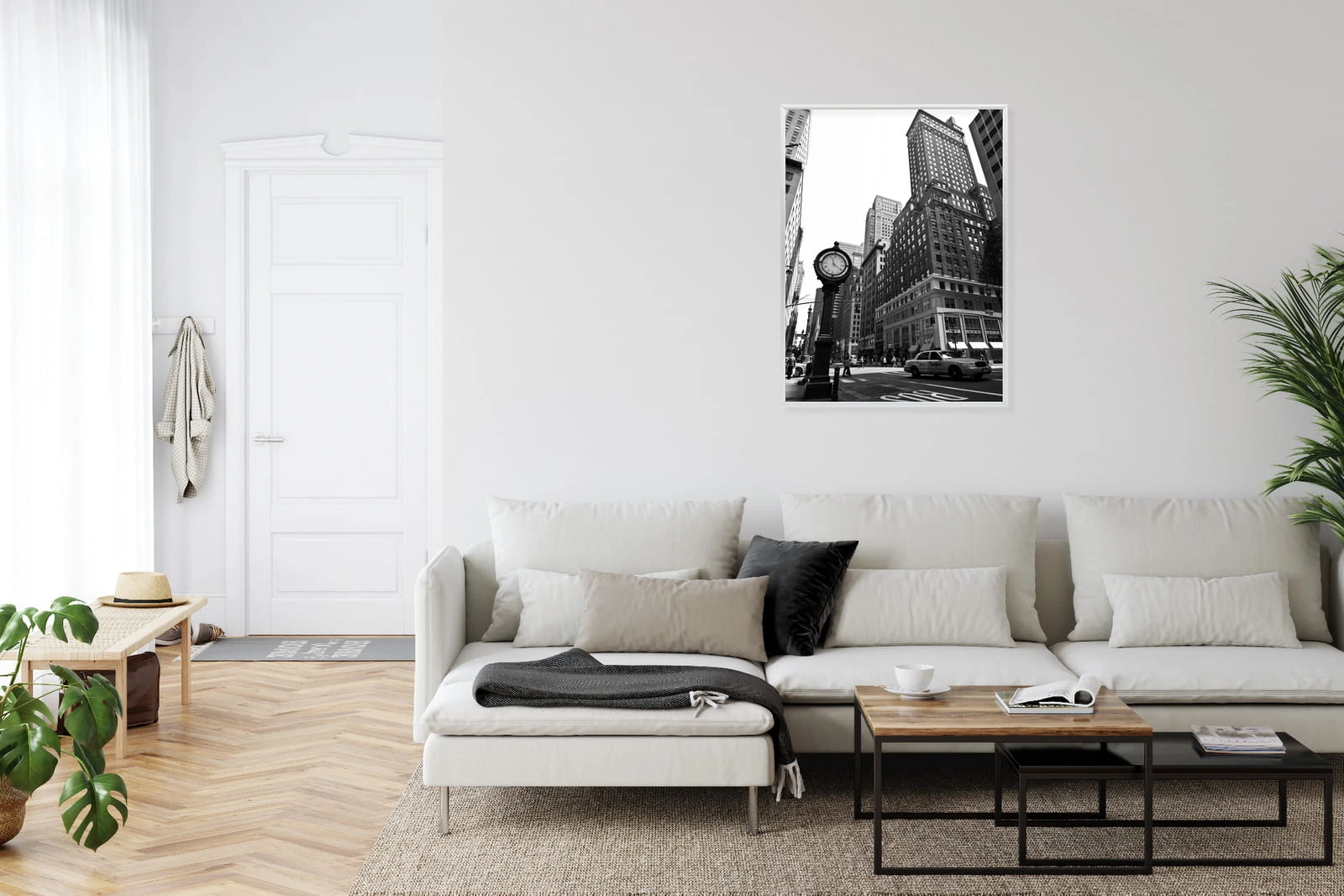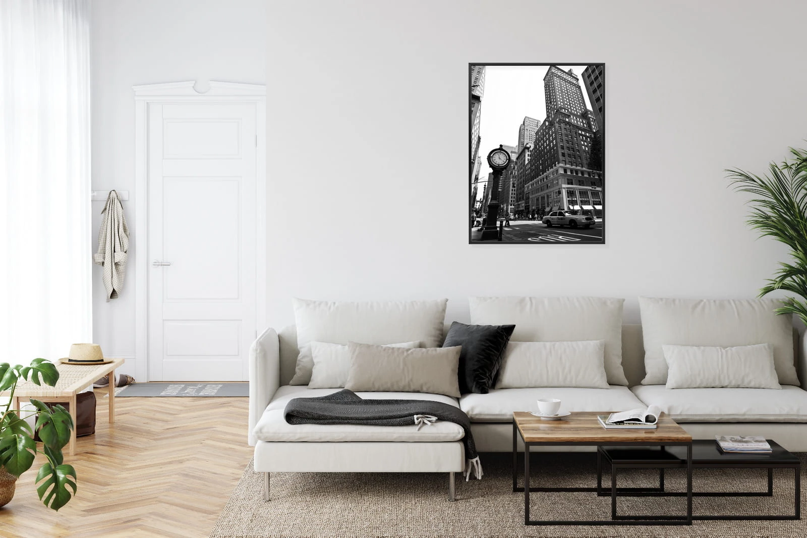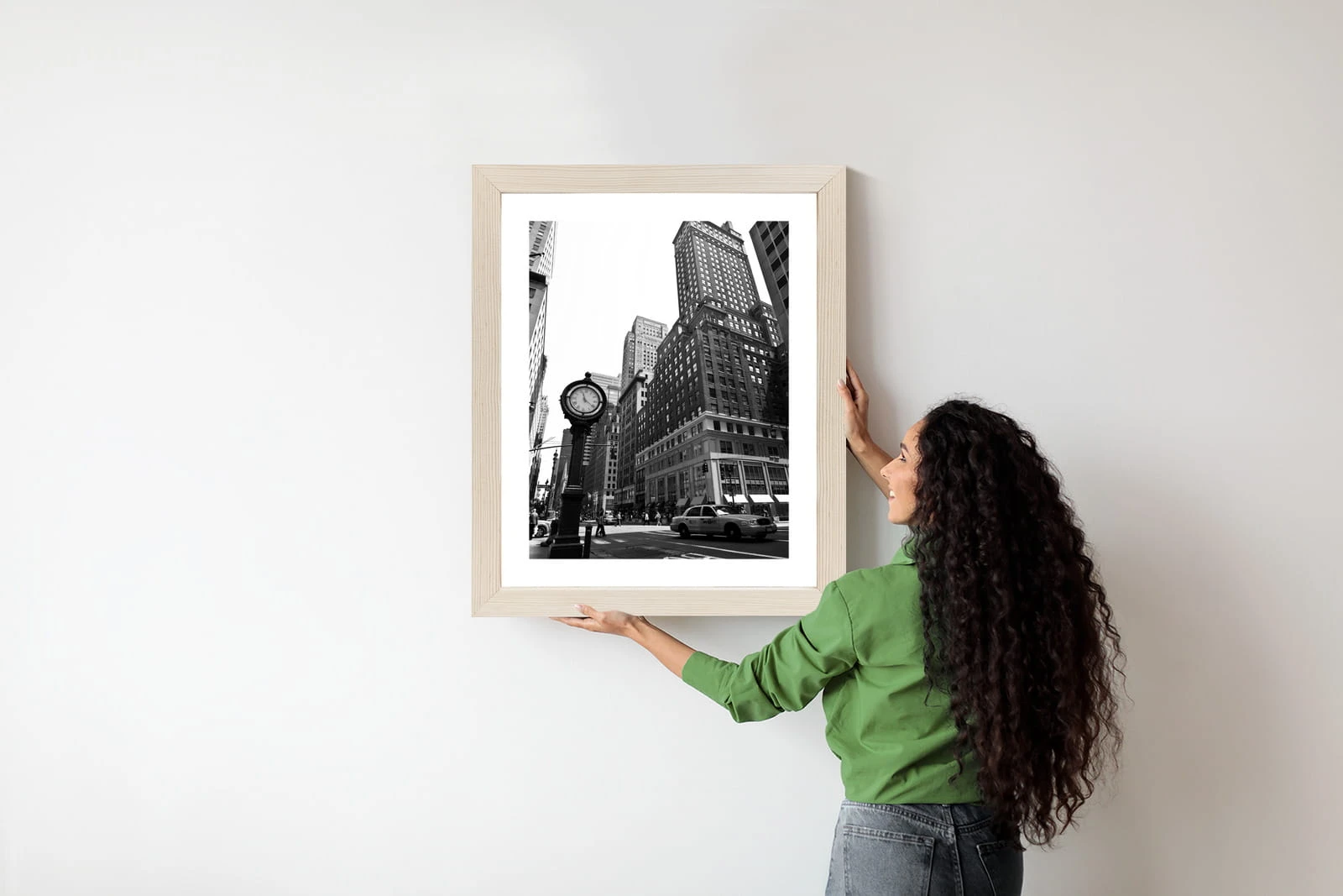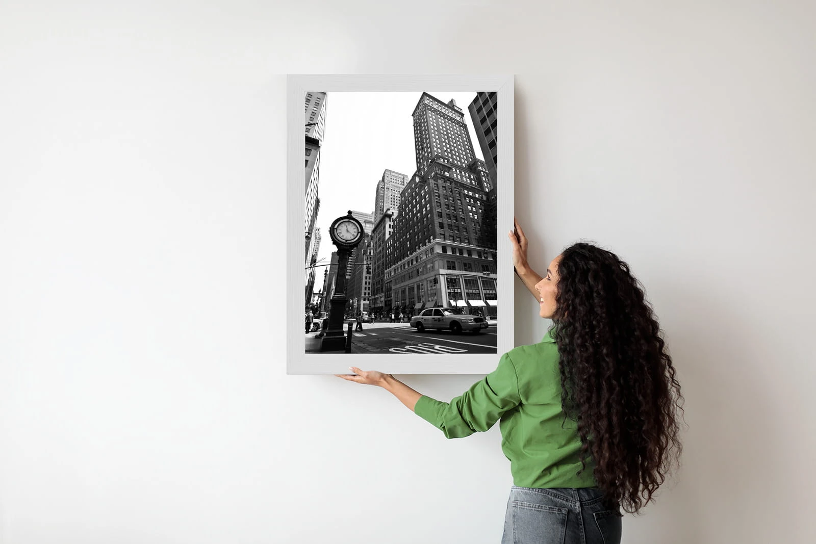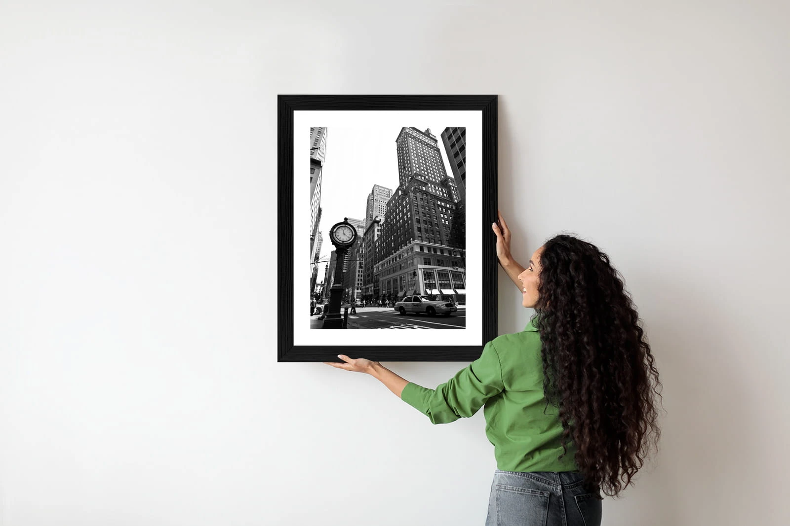 Plakat Czarno Biały Zegar I Taksówka Na Ulicy Nowego Jorku