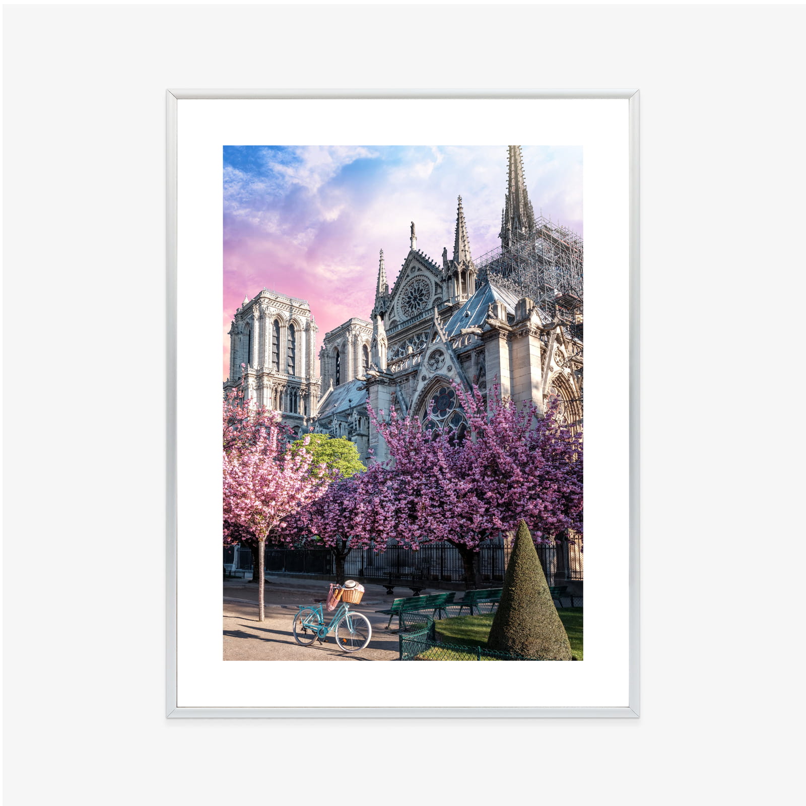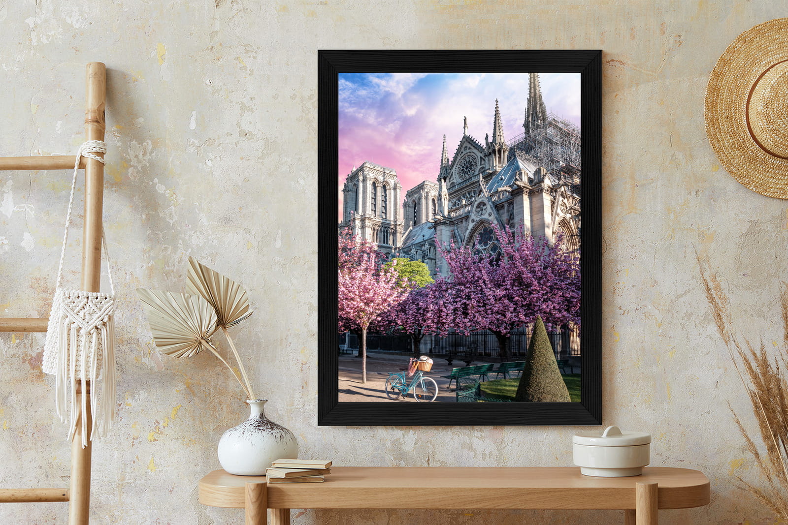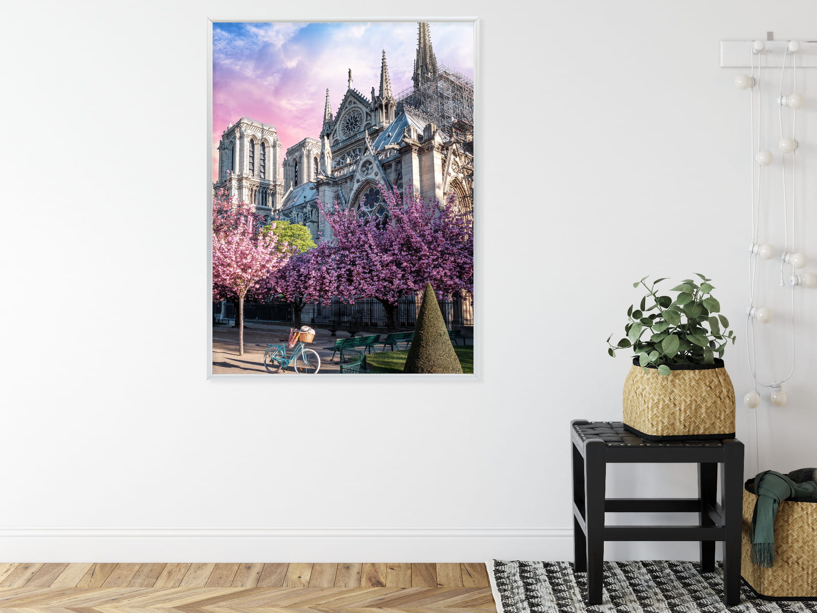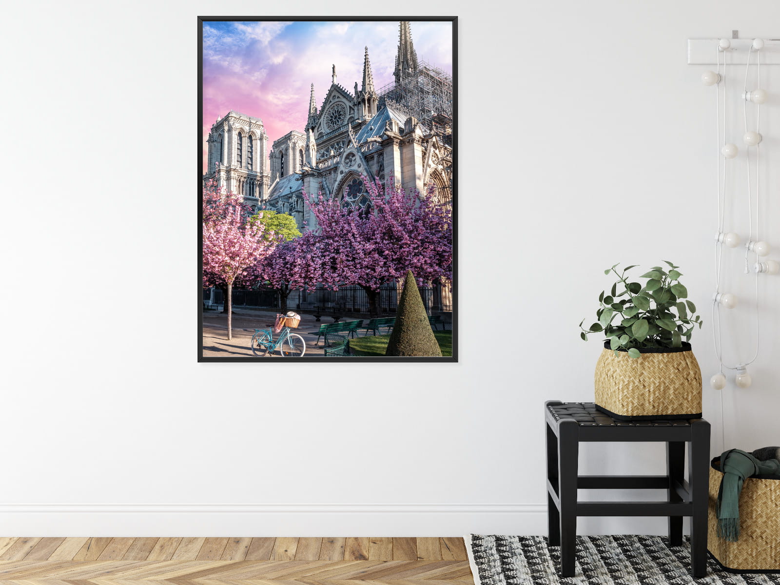 Plakat Katedra Notre Dame De Paris O Wschodzie Słońca I Kwitnące Wiśnie