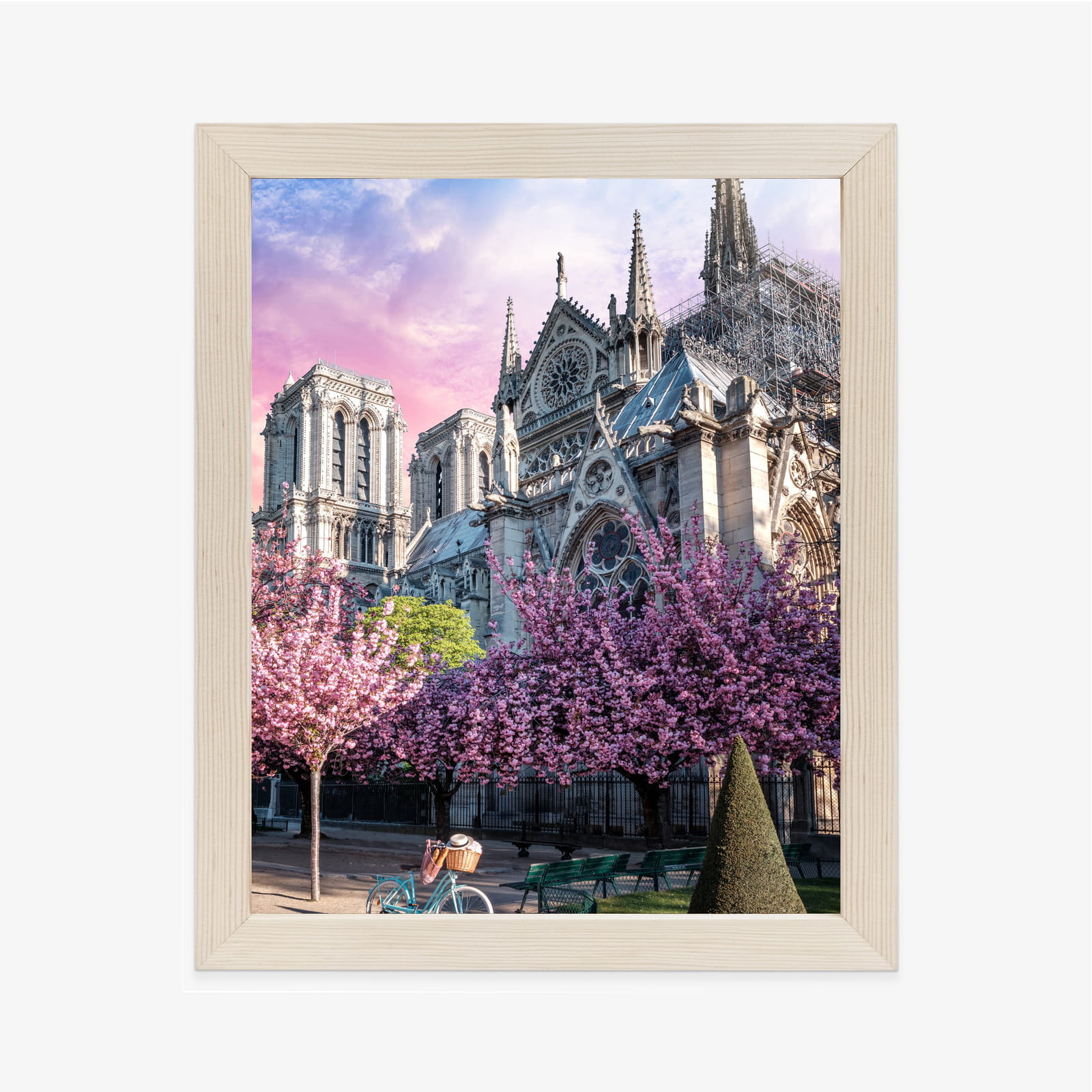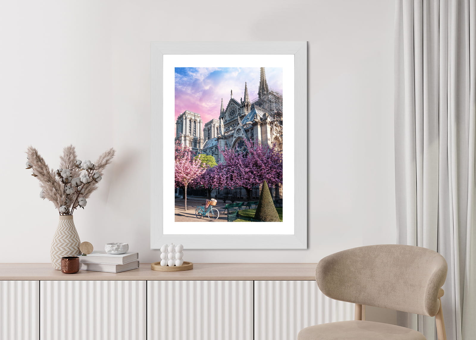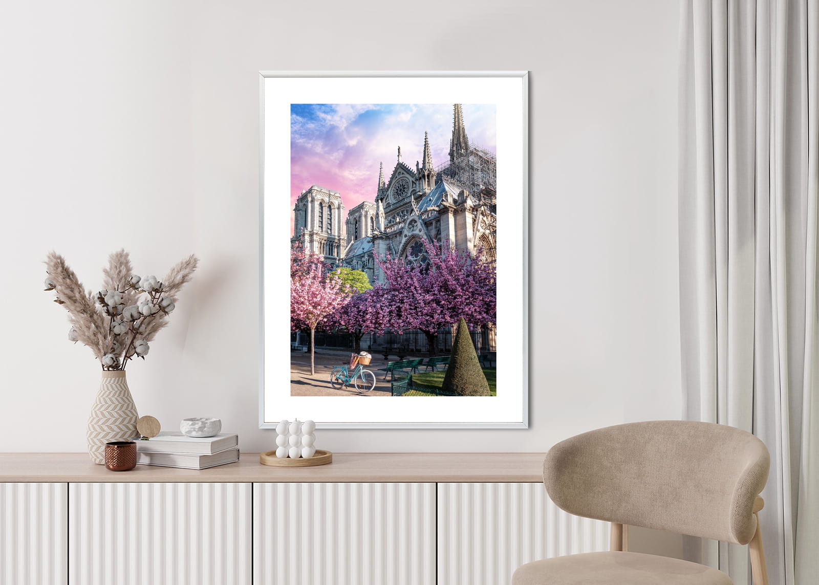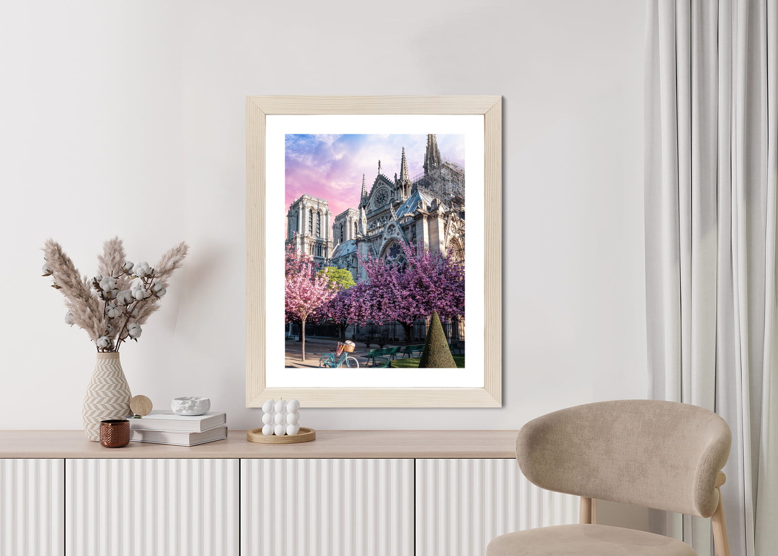Plakat Katedra Notre Dame De Paris O Wschodzie Słońca I Kwitnące Wiśnie