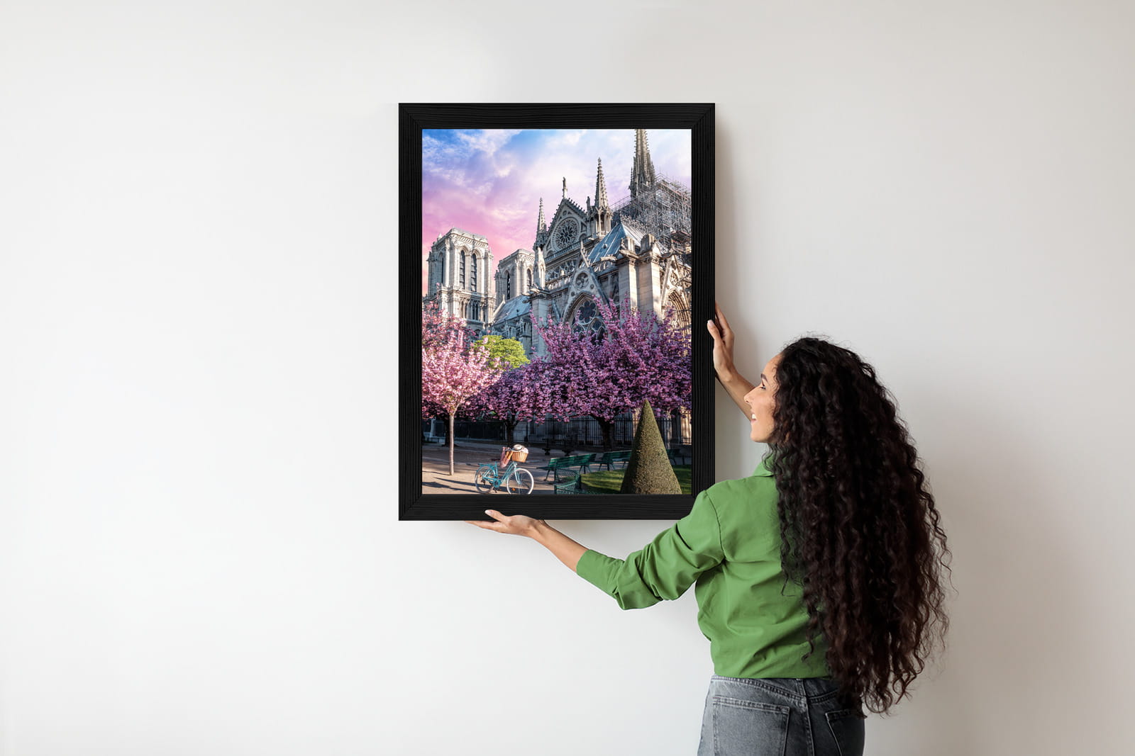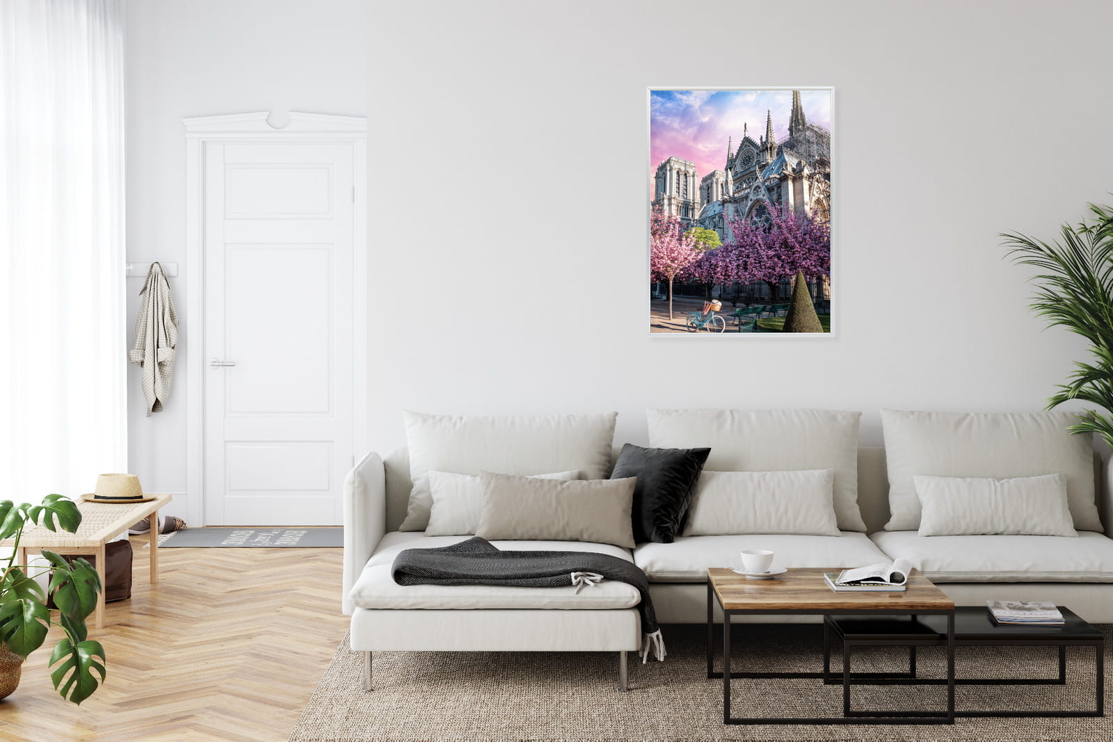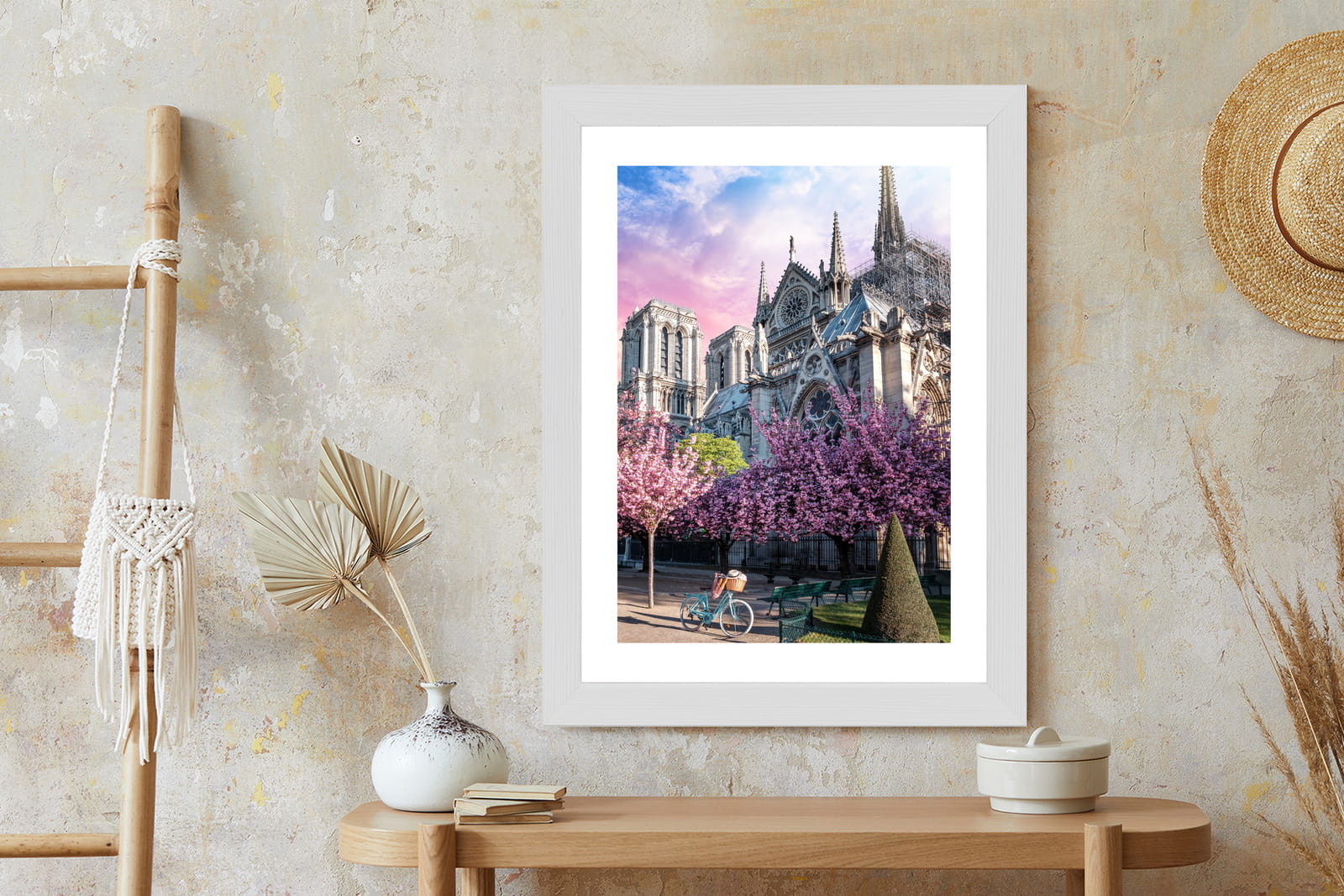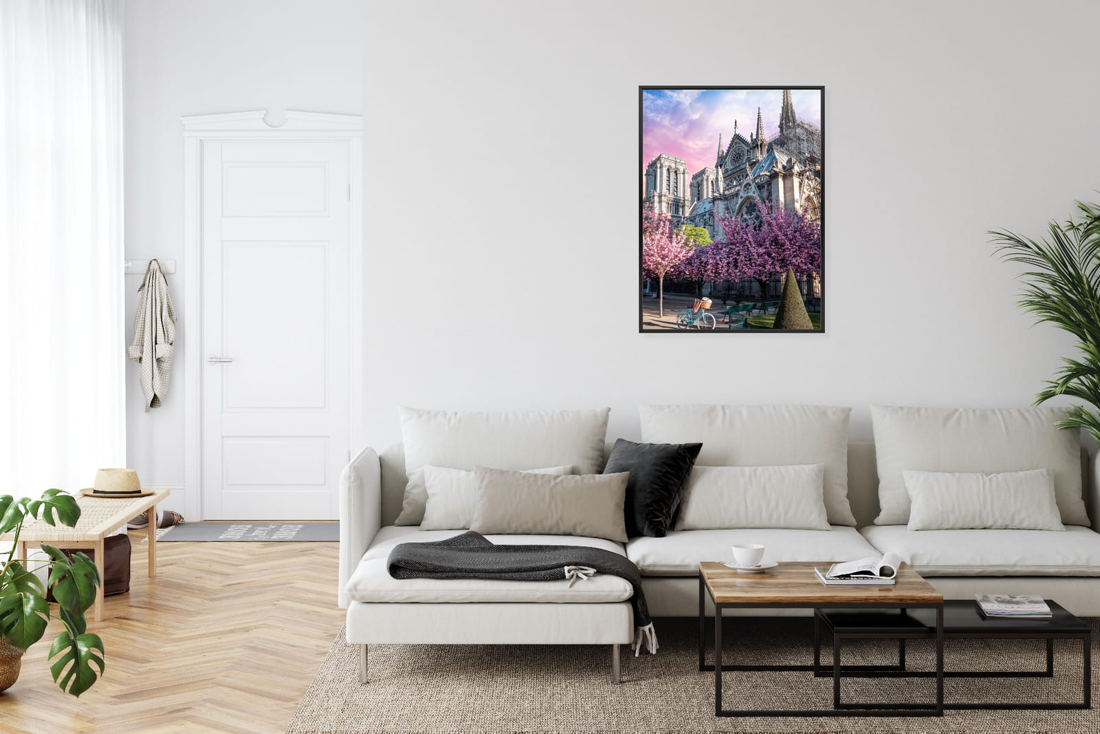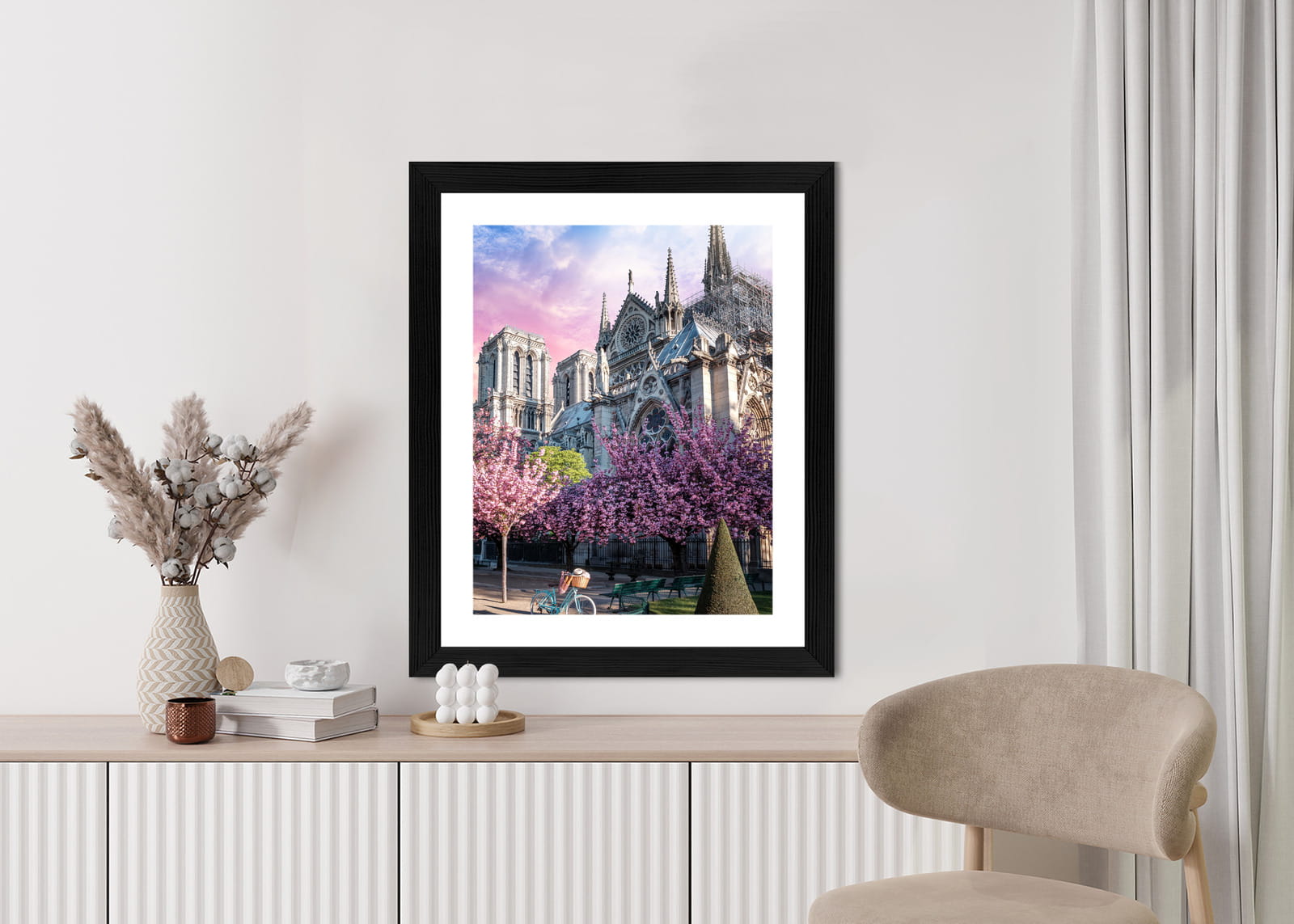Plakat Katedra Notre Dame De Paris O Wschodzie Słońca I Kwitnące Wiśnie