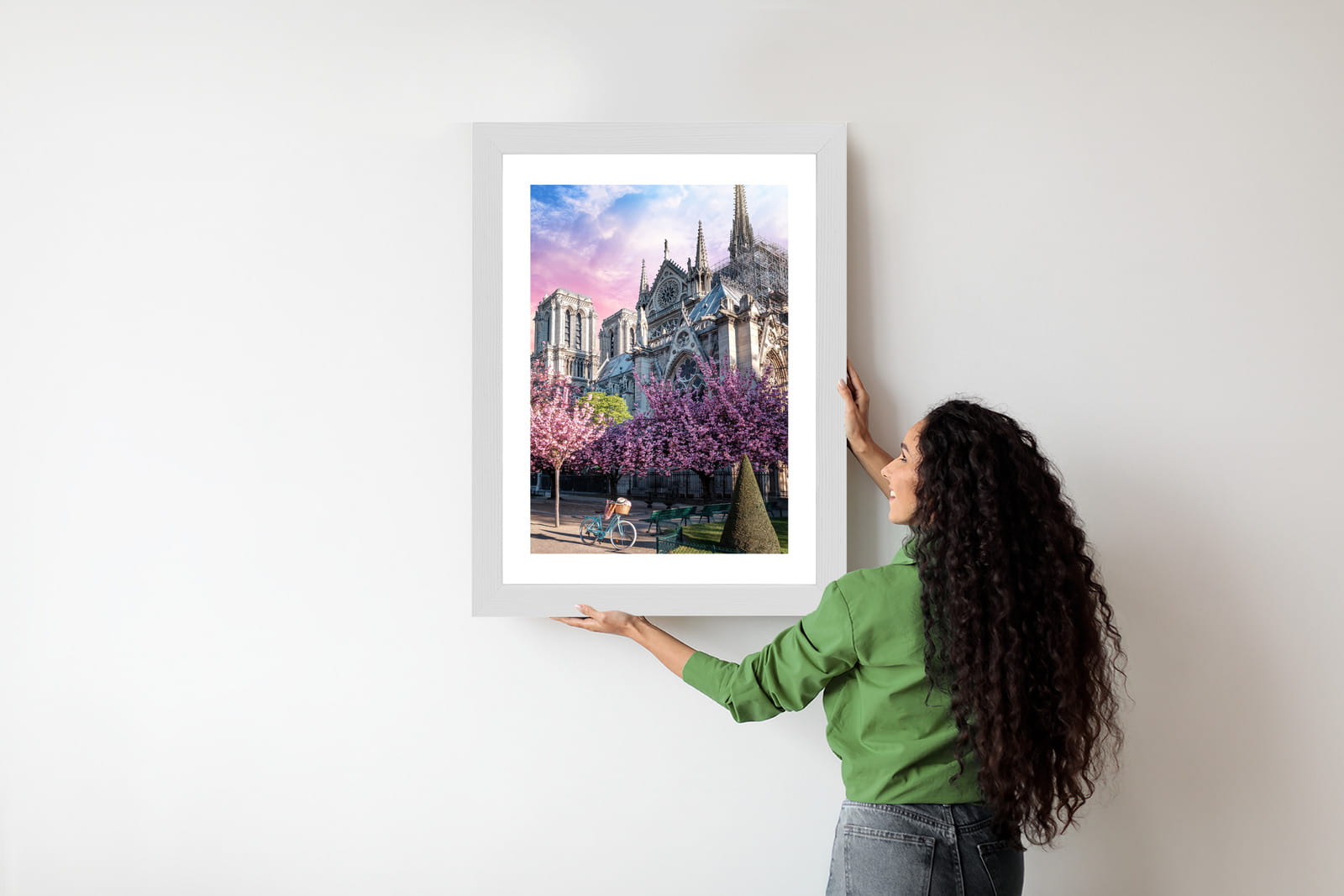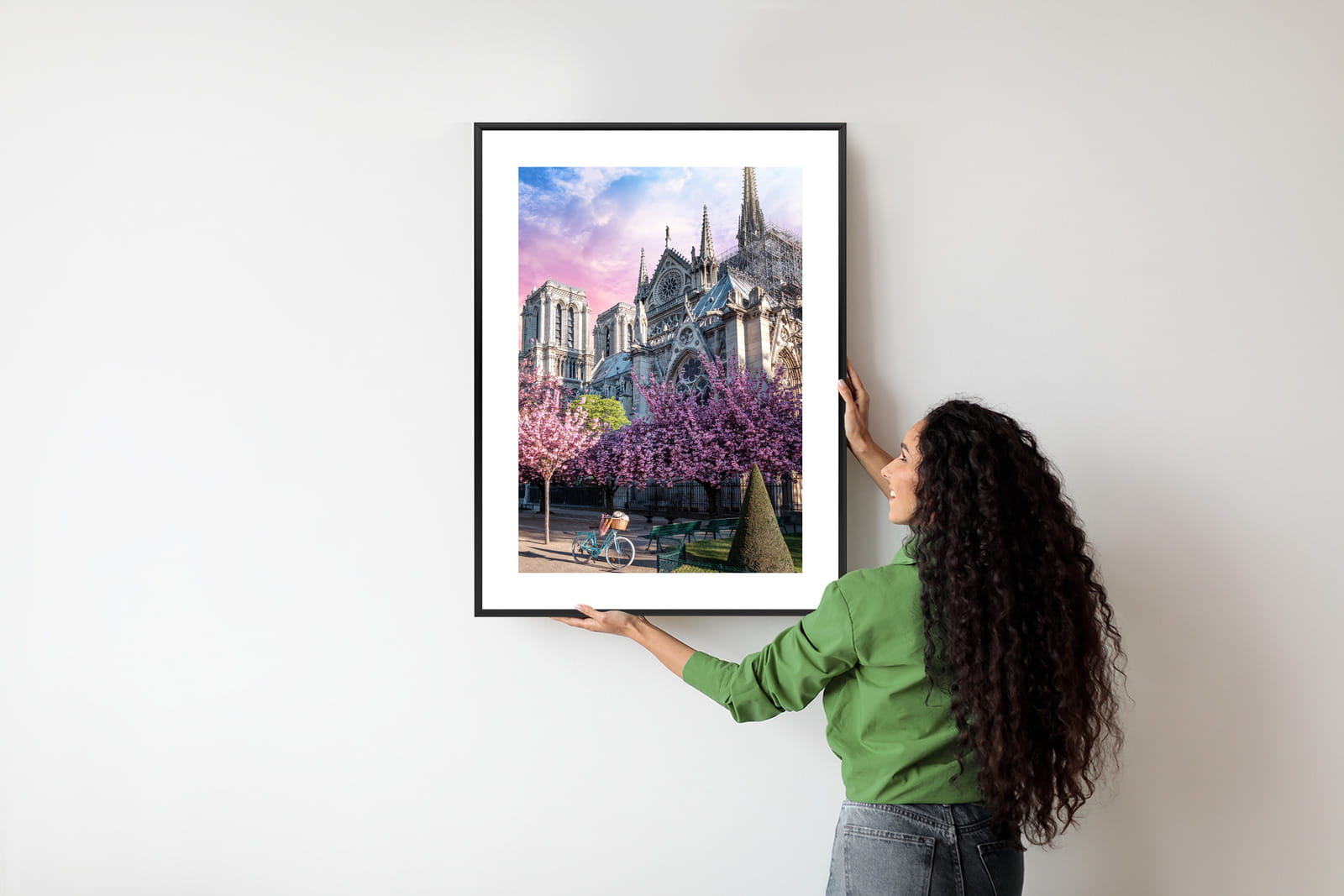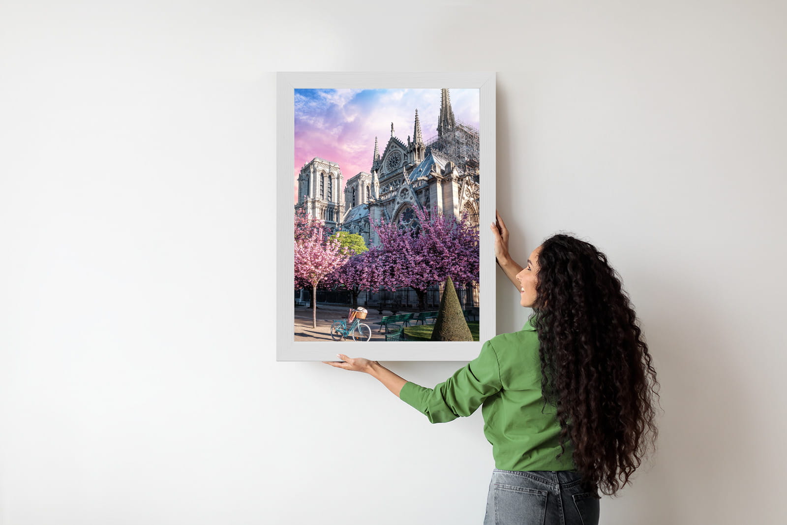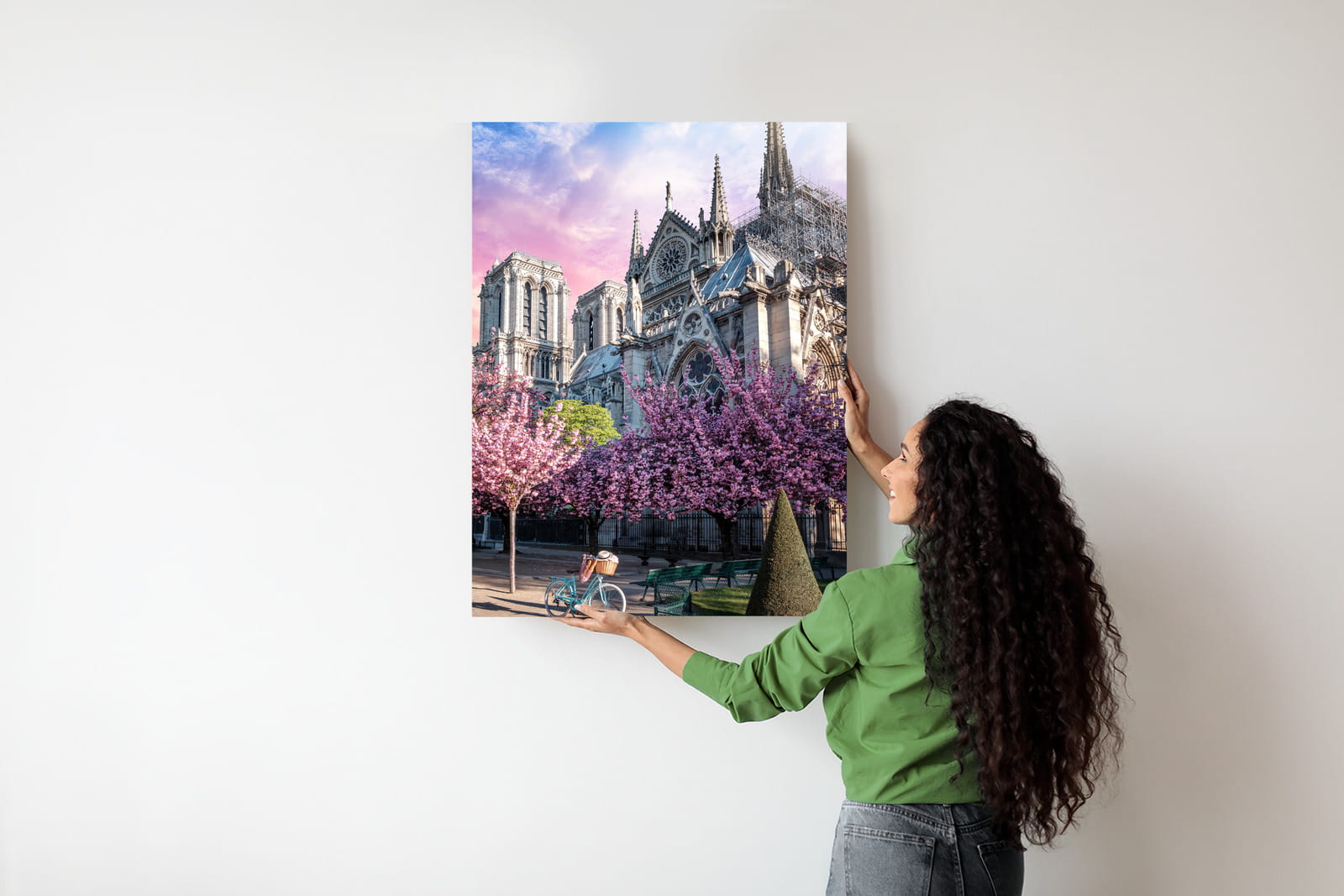Plakat Katedra Notre Dame De Paris O Wschodzie Słońca I Kwitnące Wiśnie