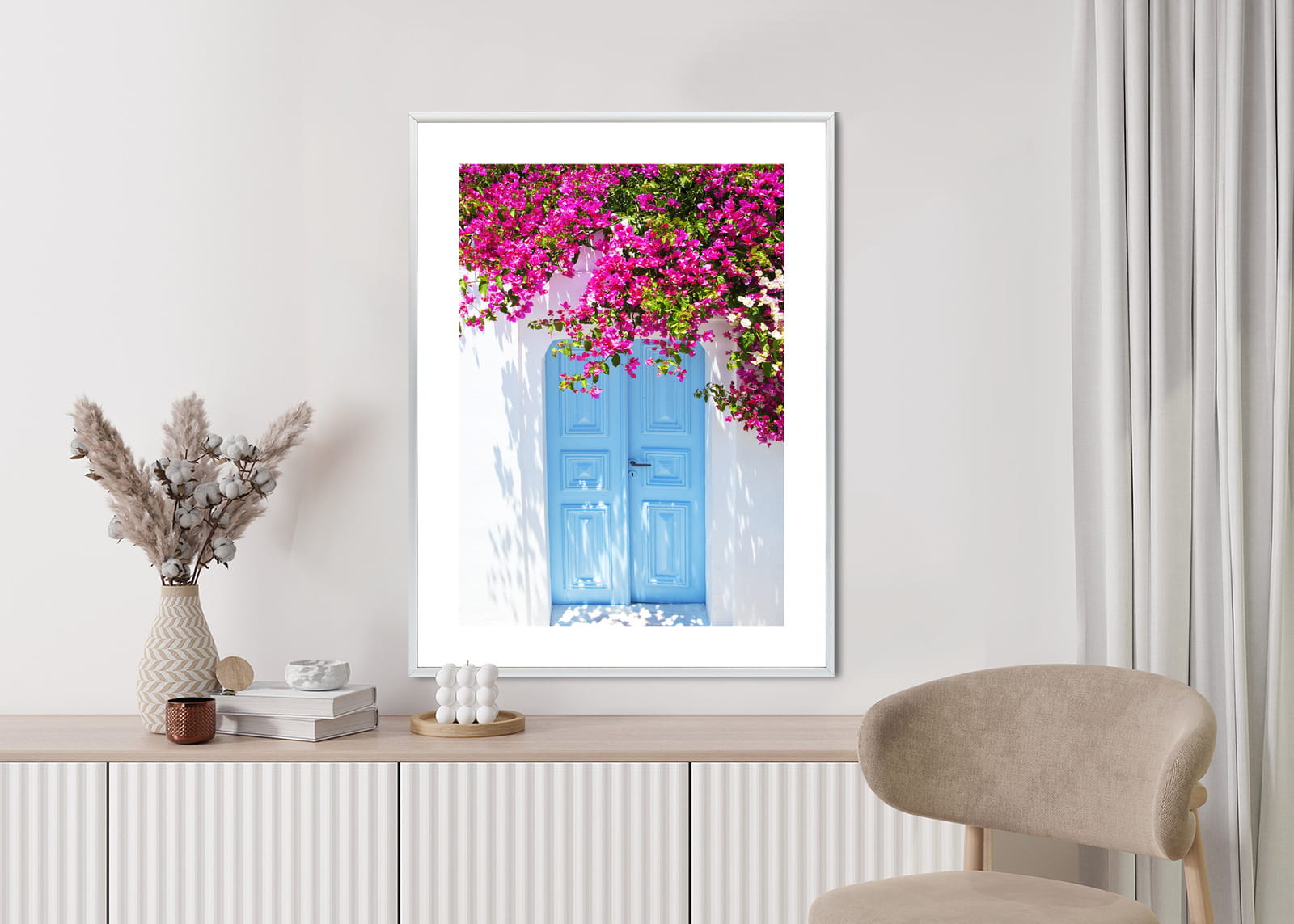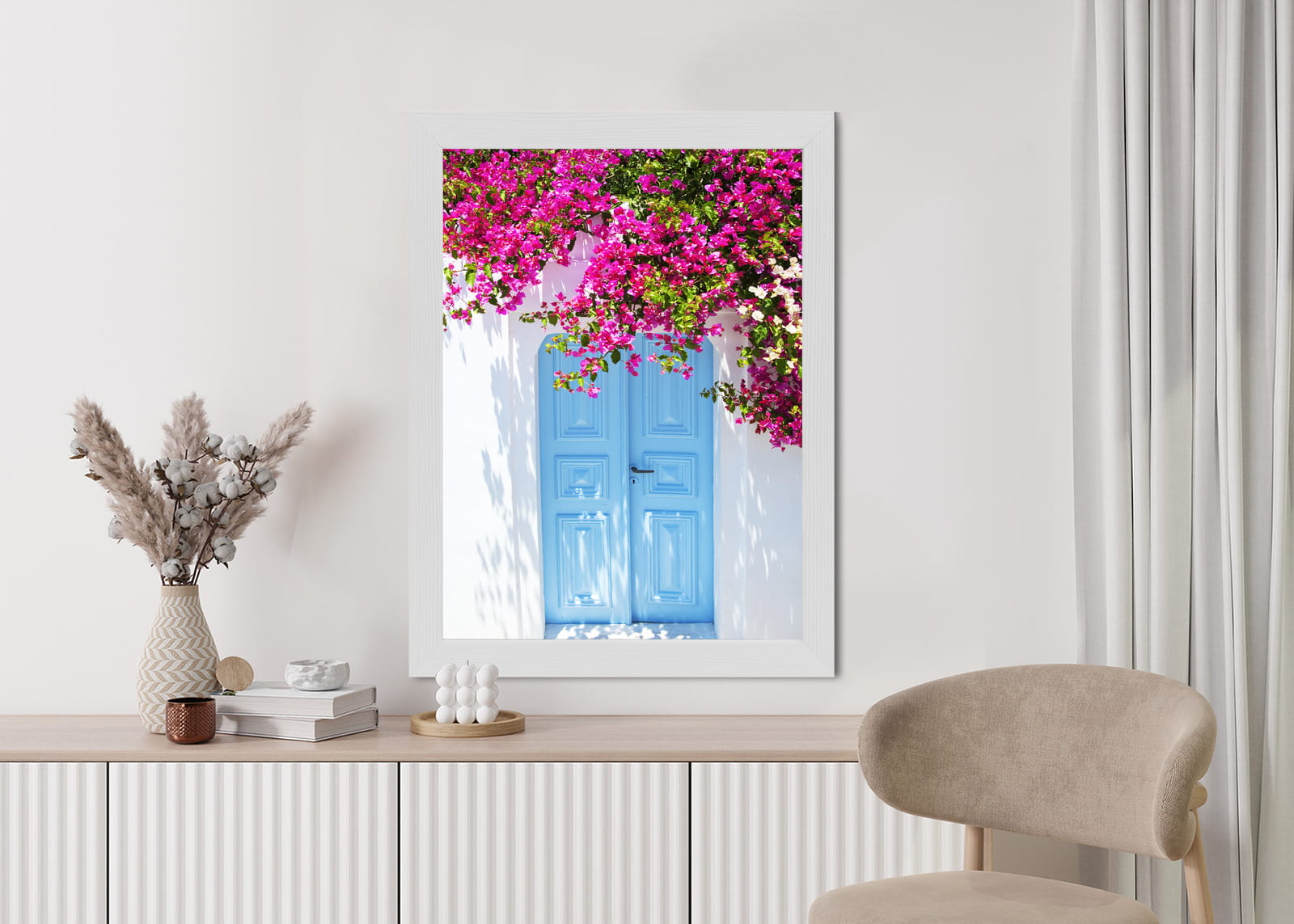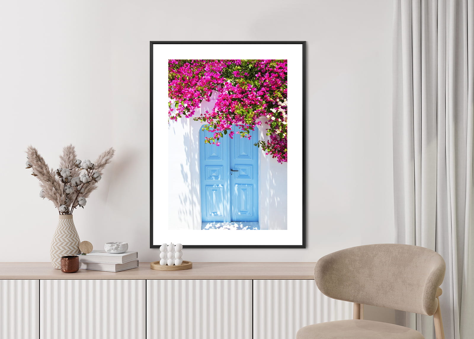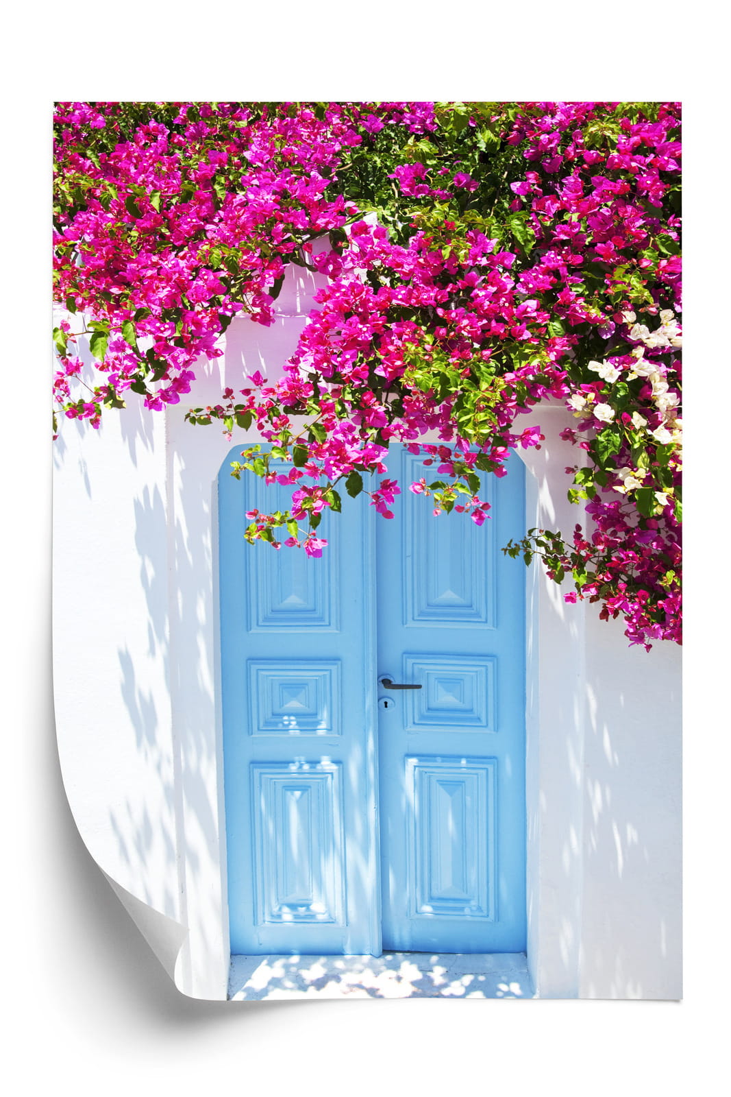 Plakat Niebieskie Drzwi I Różowe Kwiaty Tradycyjna Grecka Architektura
