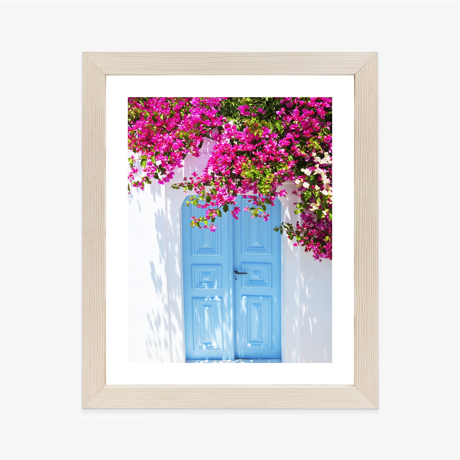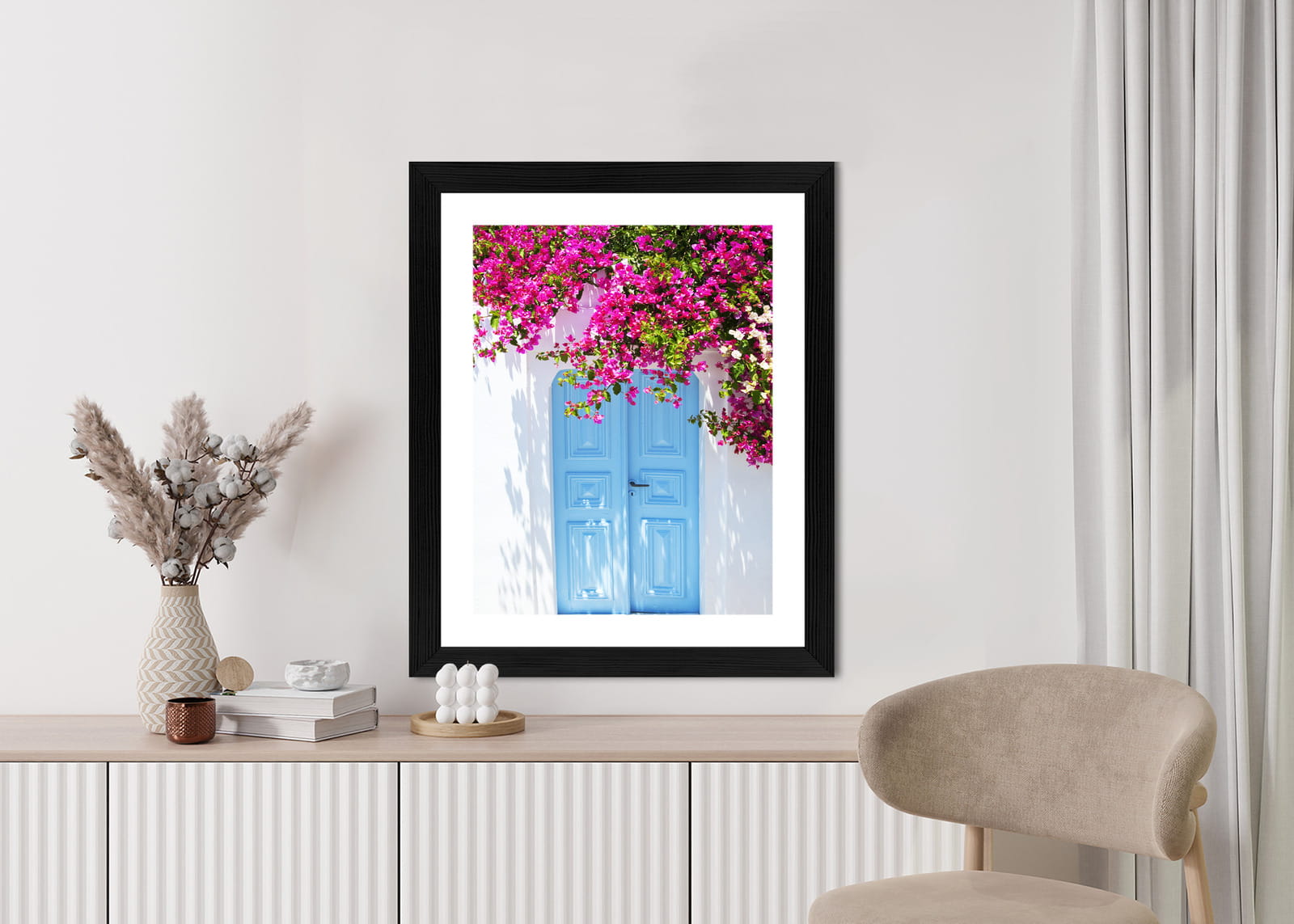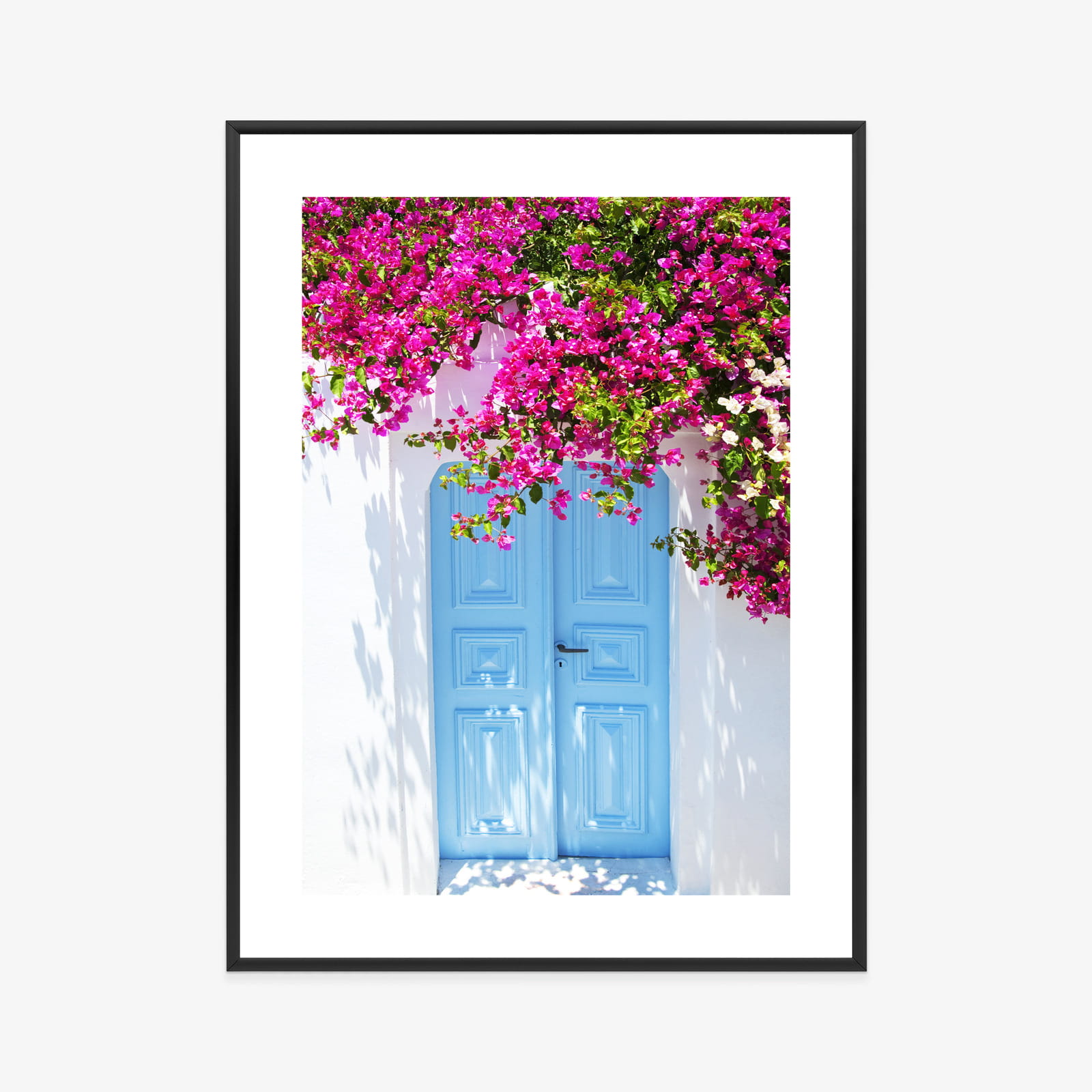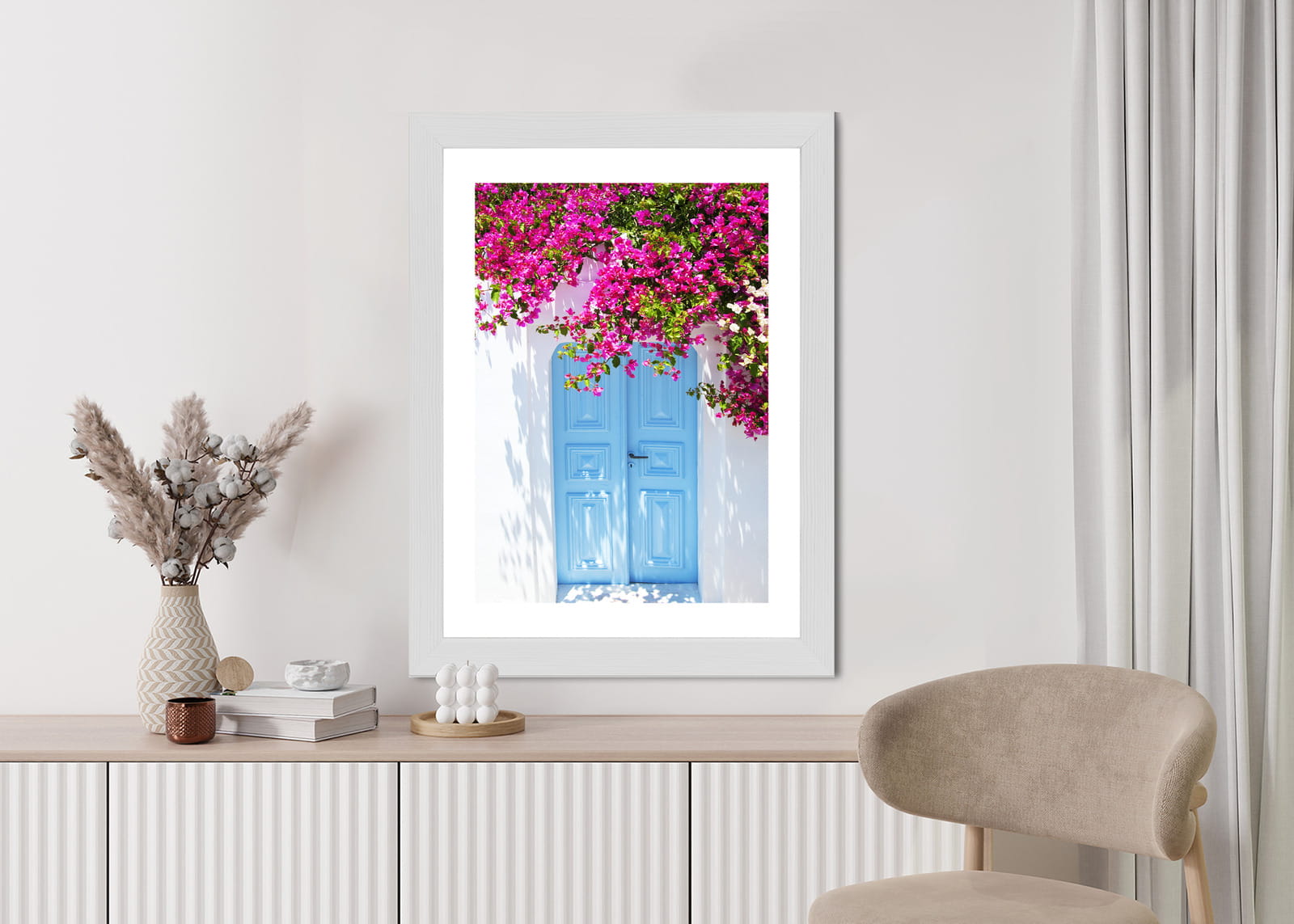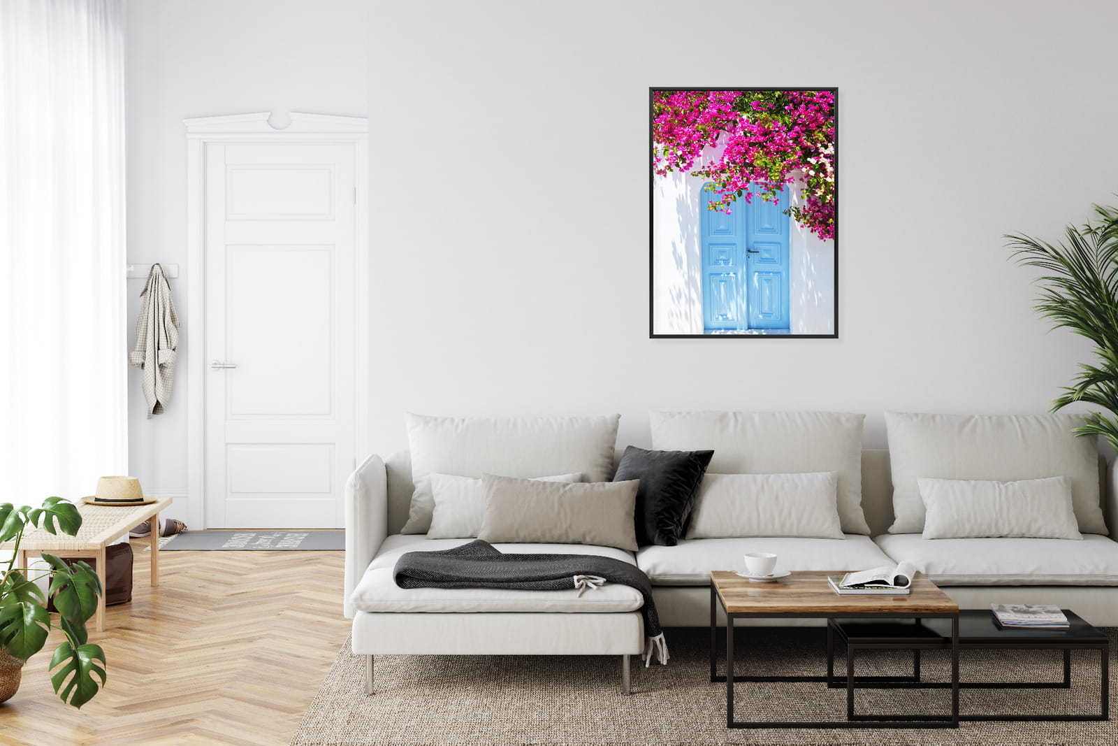 Plakat Niebieskie Drzwi I Różowe Kwiaty Tradycyjna Grecka Architektura