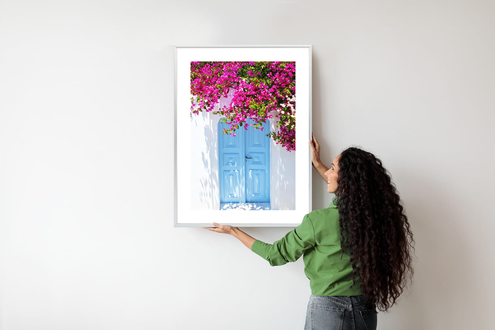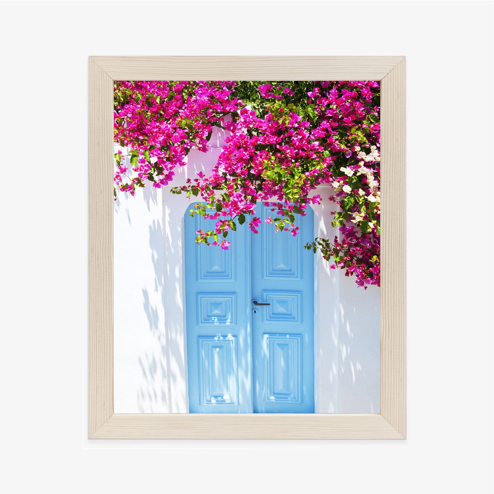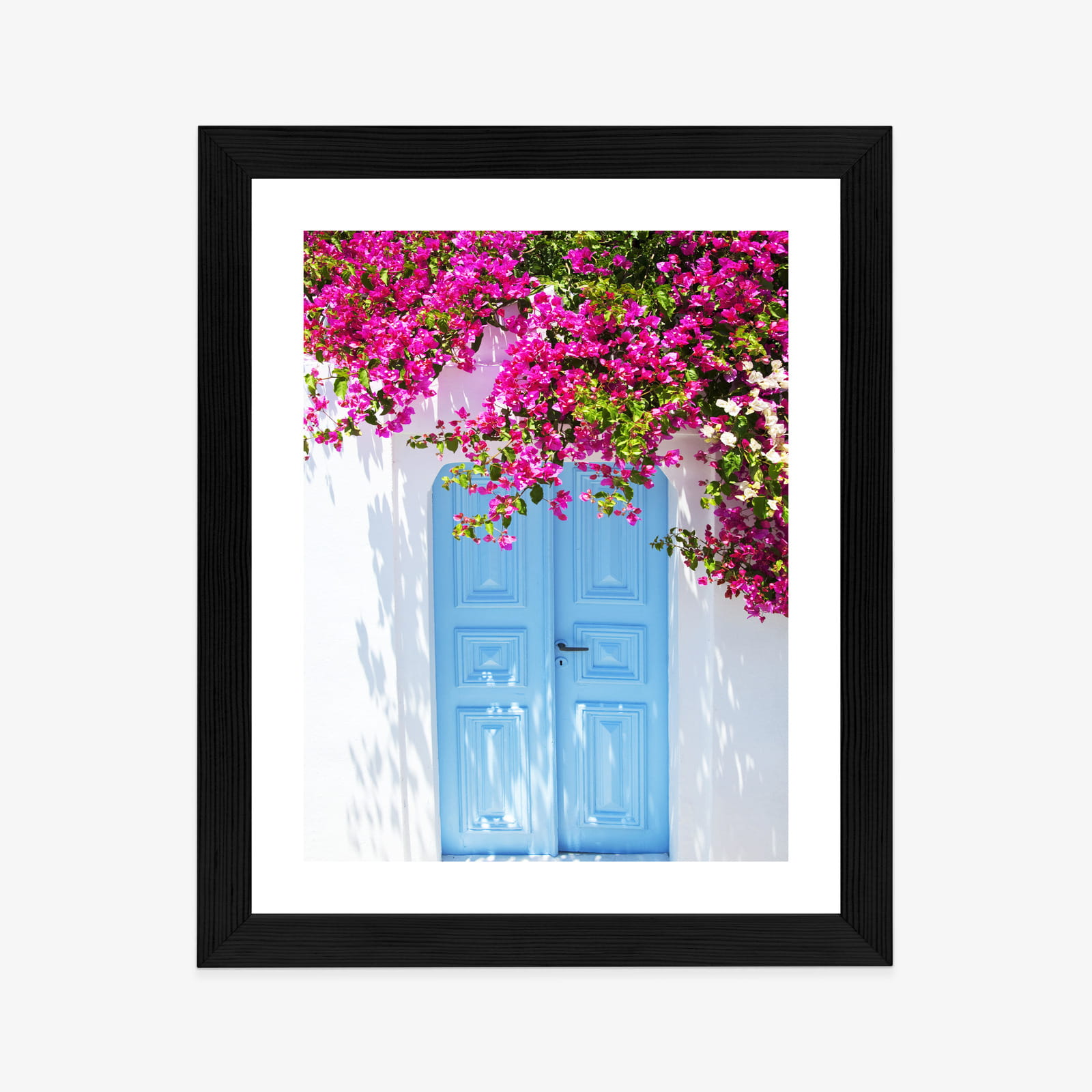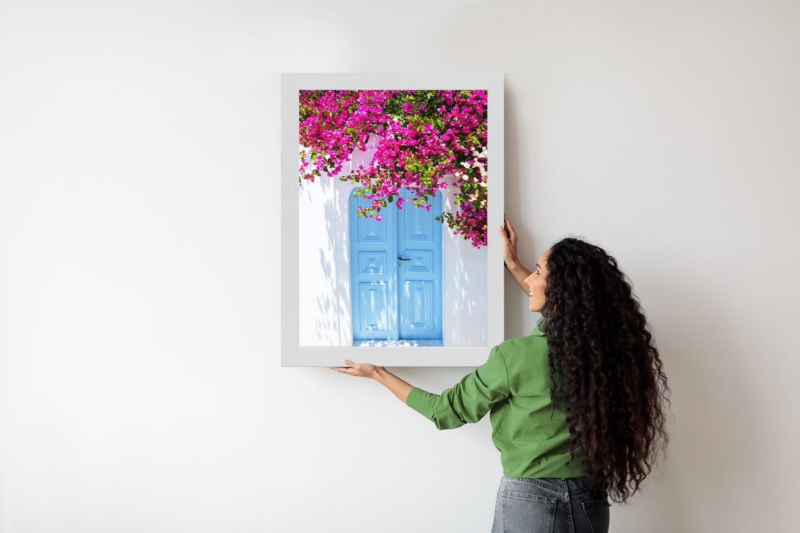 Plakat Niebieskie Drzwi I Różowe Kwiaty Tradycyjna Grecka Architektura