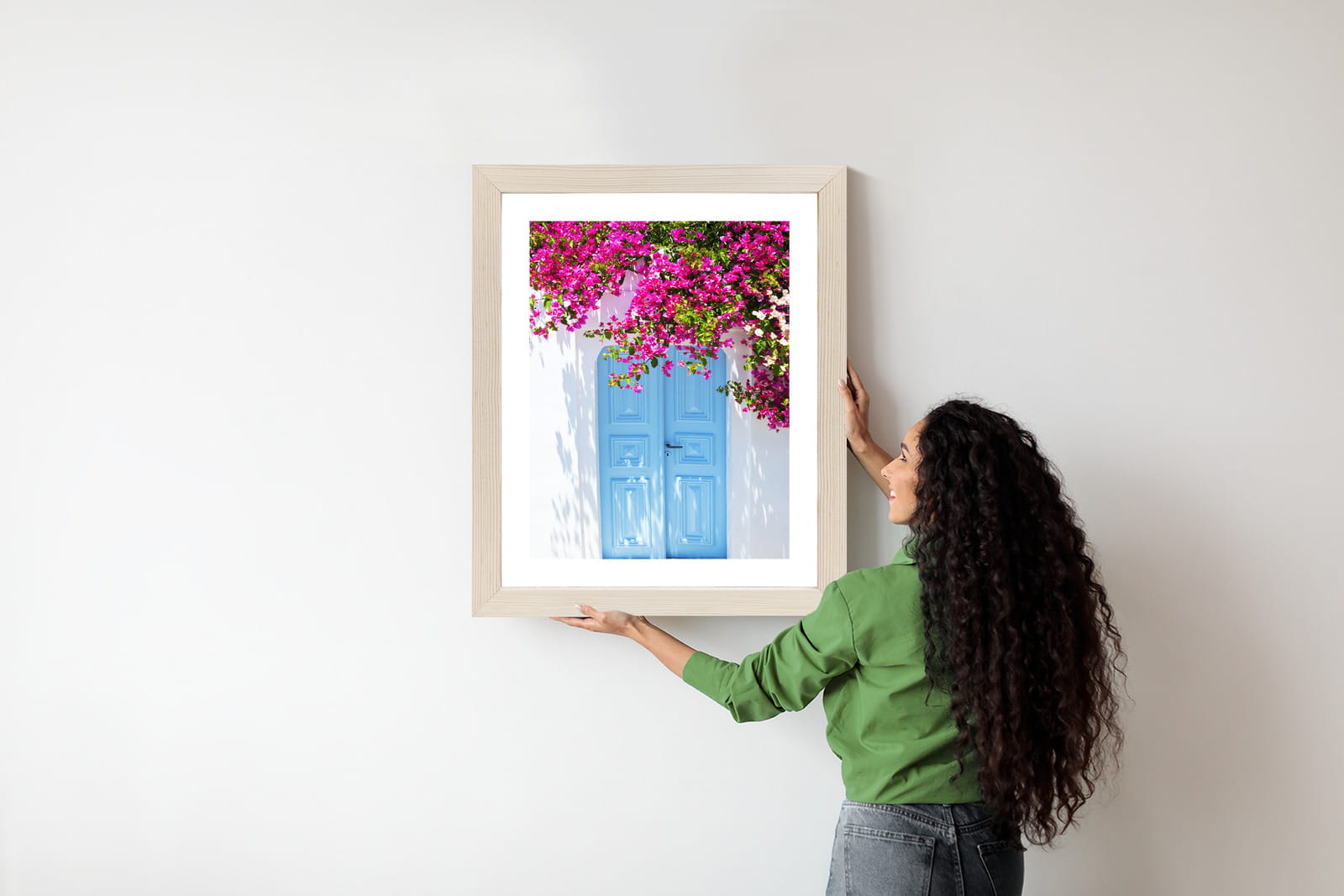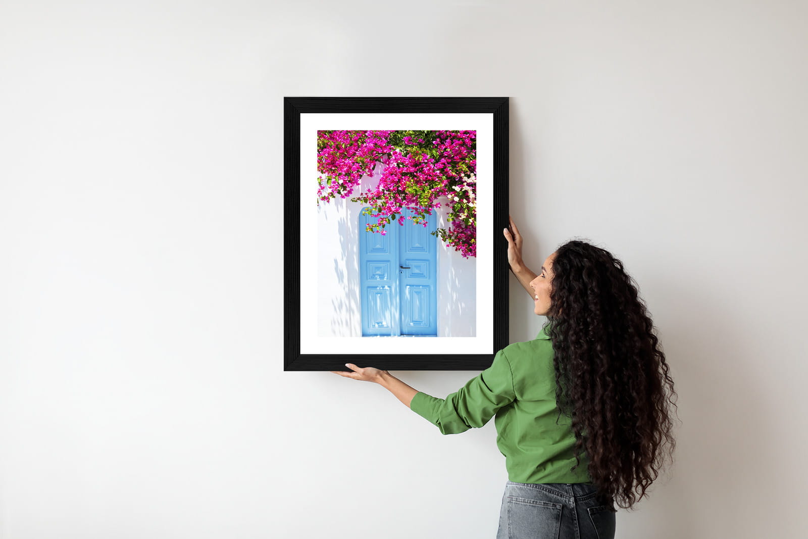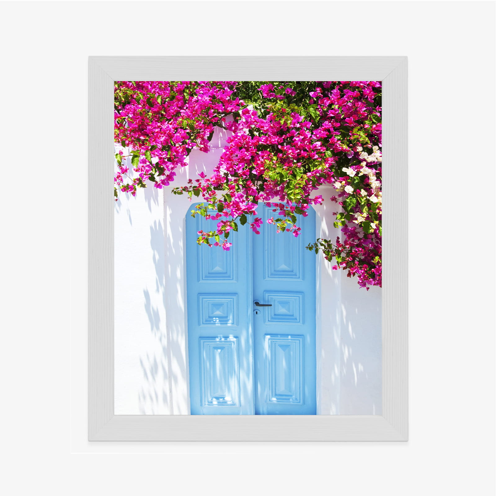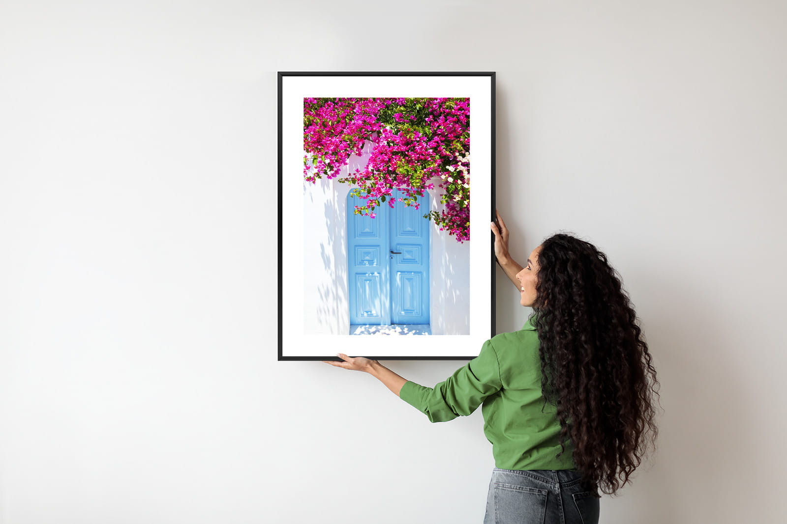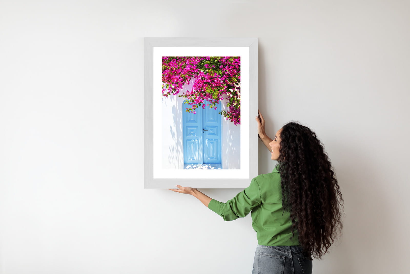 Plakat Niebieskie Drzwi I Różowe Kwiaty Tradycyjna Grecka Architektura