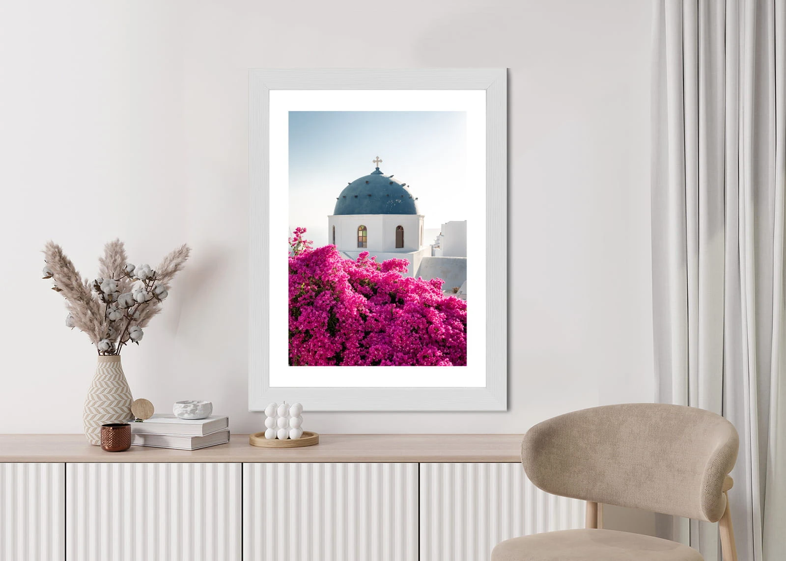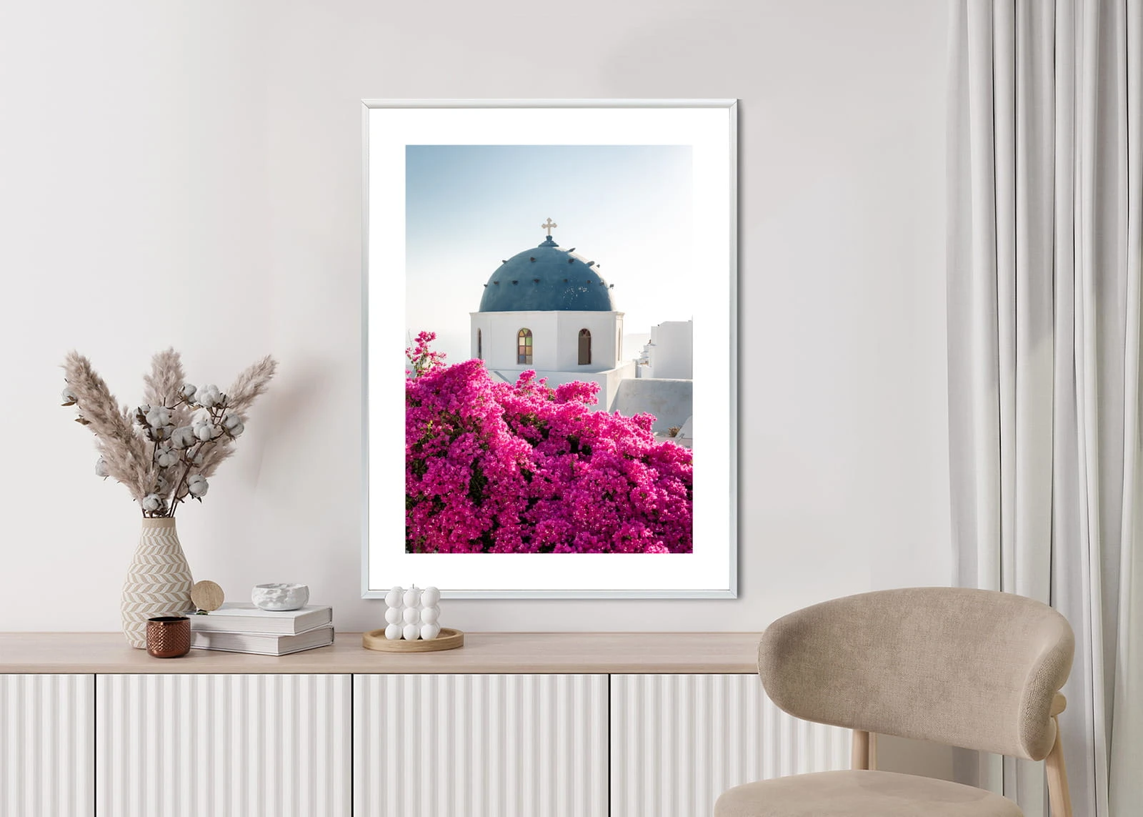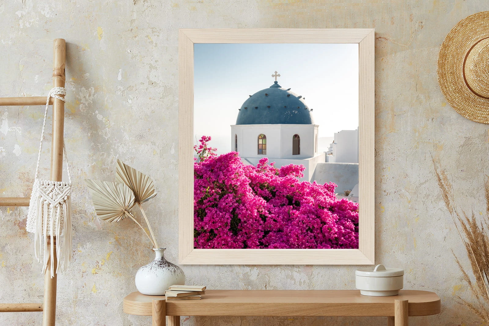 Plakat Typowa Architektura Santorini I Kwitnąca Bugenwilla