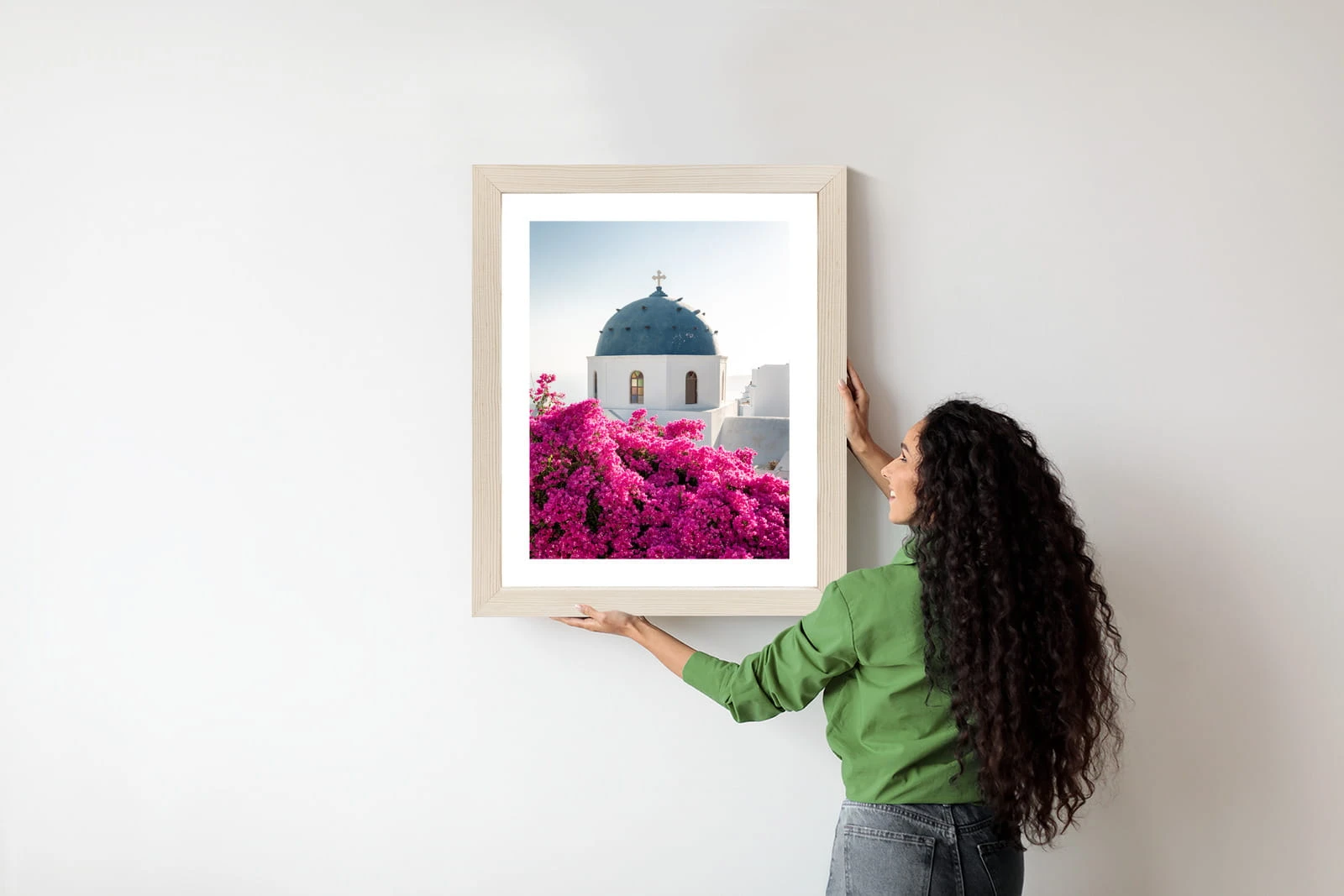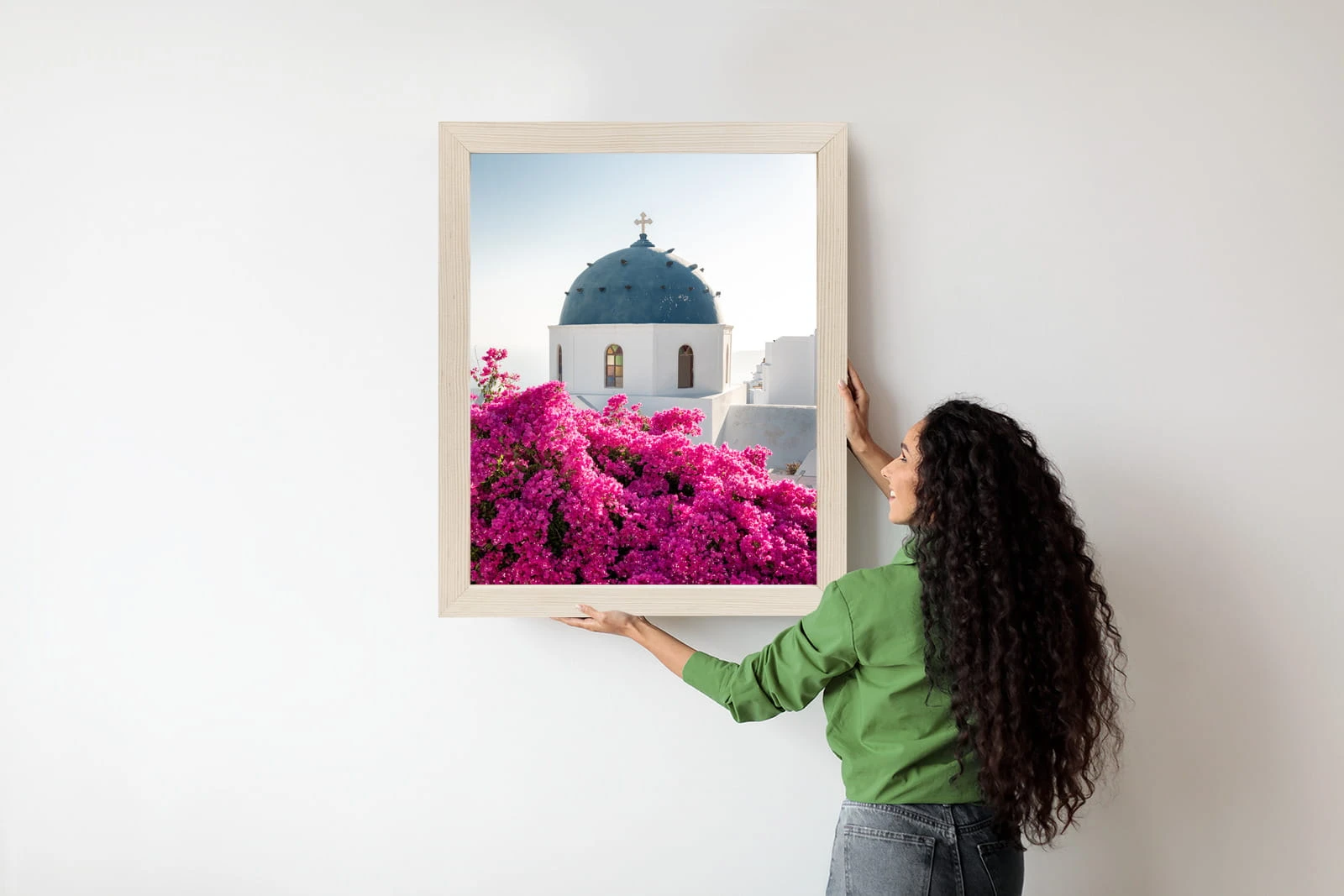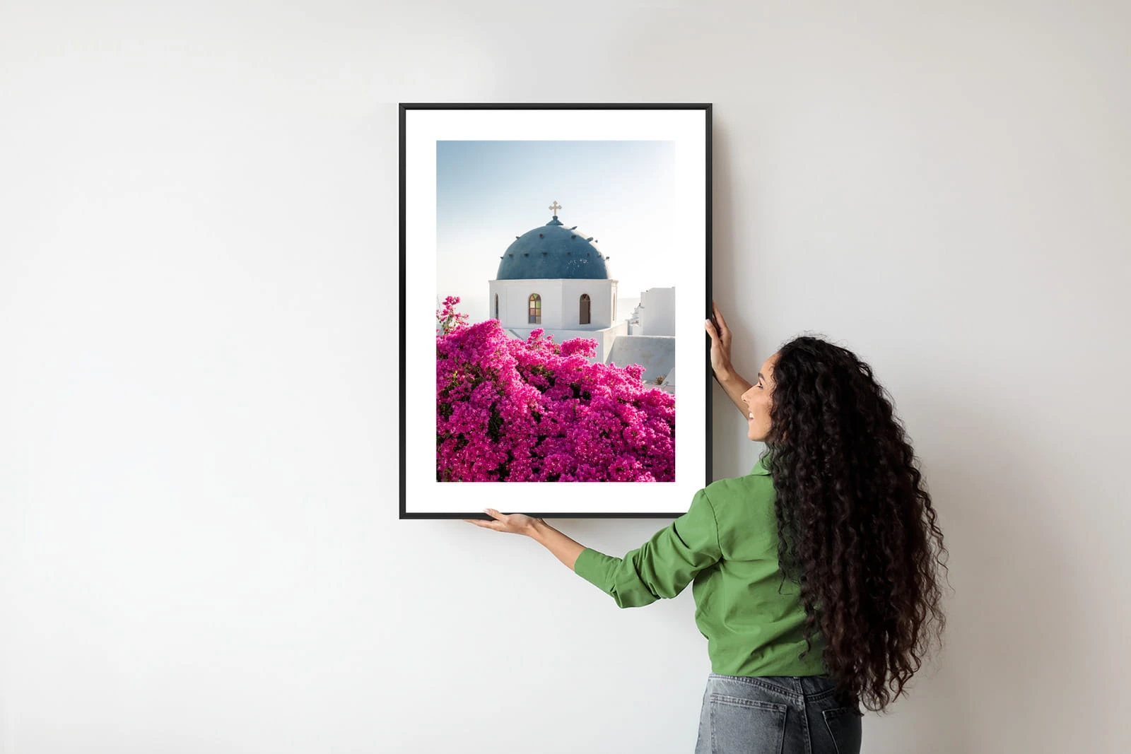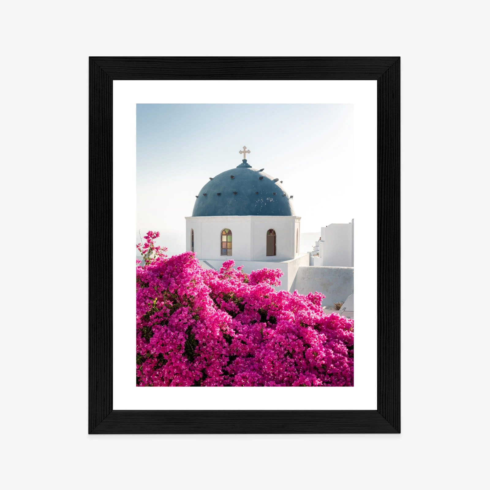 Plakat Typowa Architektura Santorini I Kwitnąca Bugenwilla