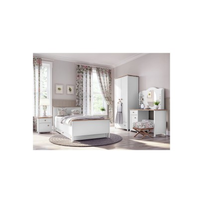 W pokoju ustawiono białe meble z kolekcji Story. Cena obejmuje zestaw mebli: