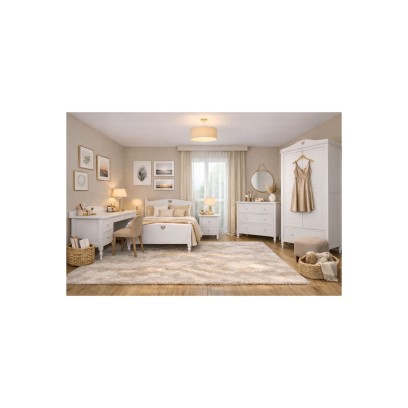 Pokój dla dziewczyny 14 lat Bella to gotowy, biały zestaw mebli młodzieżowych zaprojektowany z myślą o nowoczesnym, ale nadal dziewczęcym wnętrzu. W skład kompletu wchodzą: łóżko 90x200, biurko, szafa, komoda oraz szafka nocna, dzięki czemu jednym wyborem urządzasz funkcjonalny pokój nastolatki. Wszystkie bryły z kolekcji Bella mają subtelne frezy, toczone nogi oraz charakterystyczne serduszko, które delikatnie podkreśla dziewczęcy charakter aranżacji.