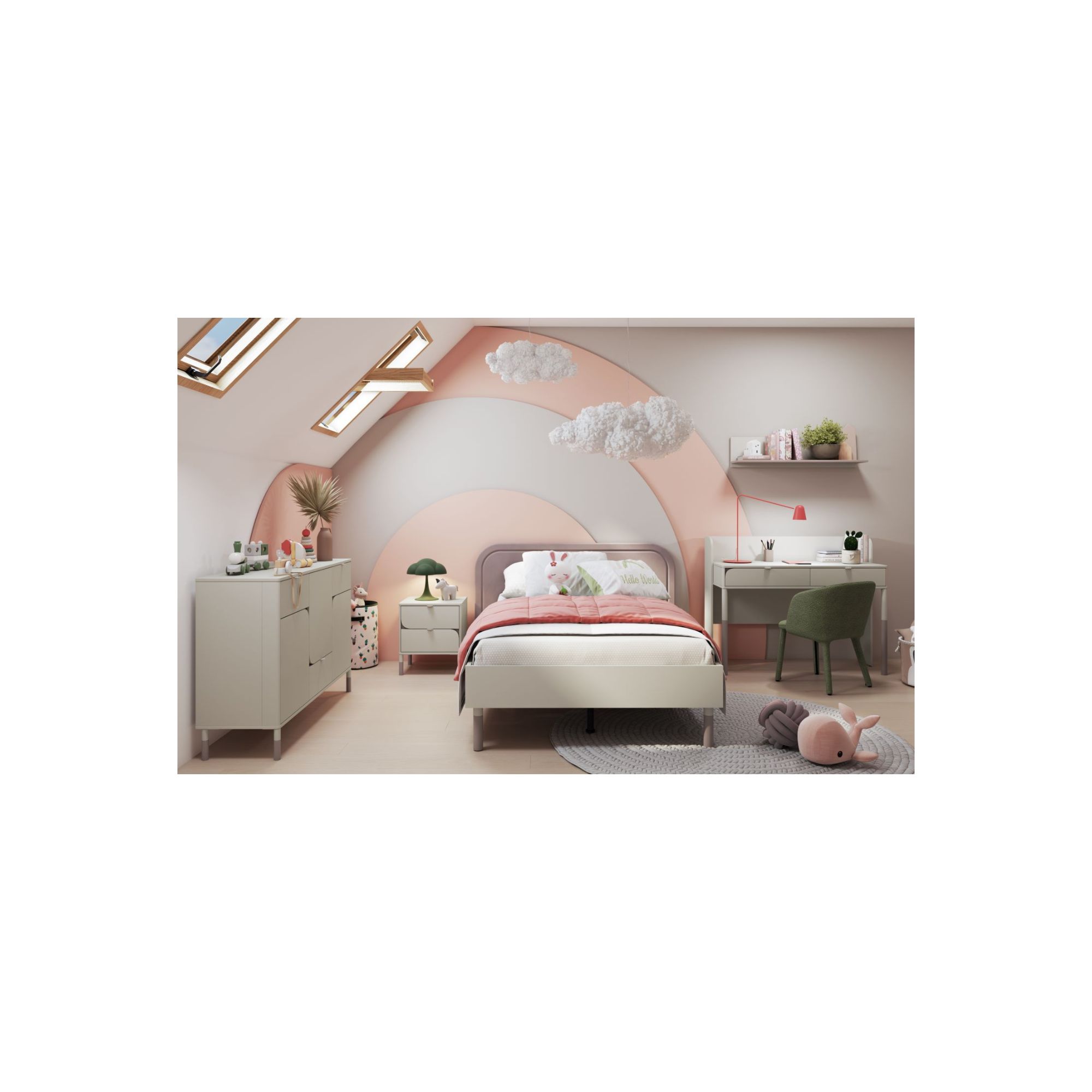 Pokój młodzieżowy na poddaszu Harmony to gotowa aranżacja pokoju dziewczynki w wieku szkolnym lub nastolatki. Zestaw tworzą meble z kolekcji Harmony: łóżko z zagłówkiem, biurko, komoda i szafka nocna, a całość uzupełniają pastelowe ściany, miękkie dywany i dekoracje w formie chmur. To przykład, jak urządzić poddasze tak, by było zarówno przytulne, jak i funkcjonalne.